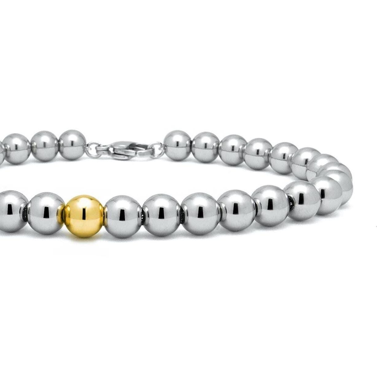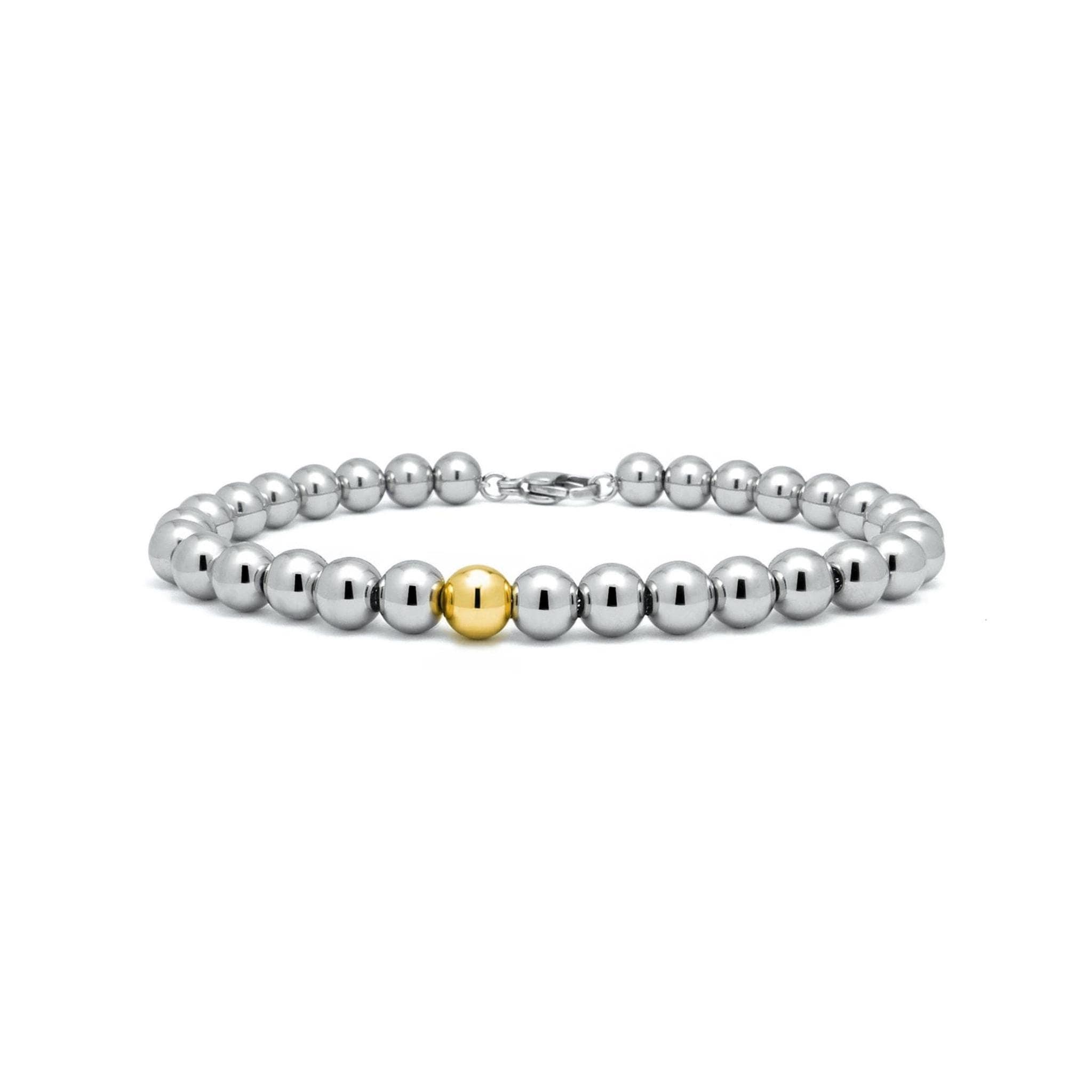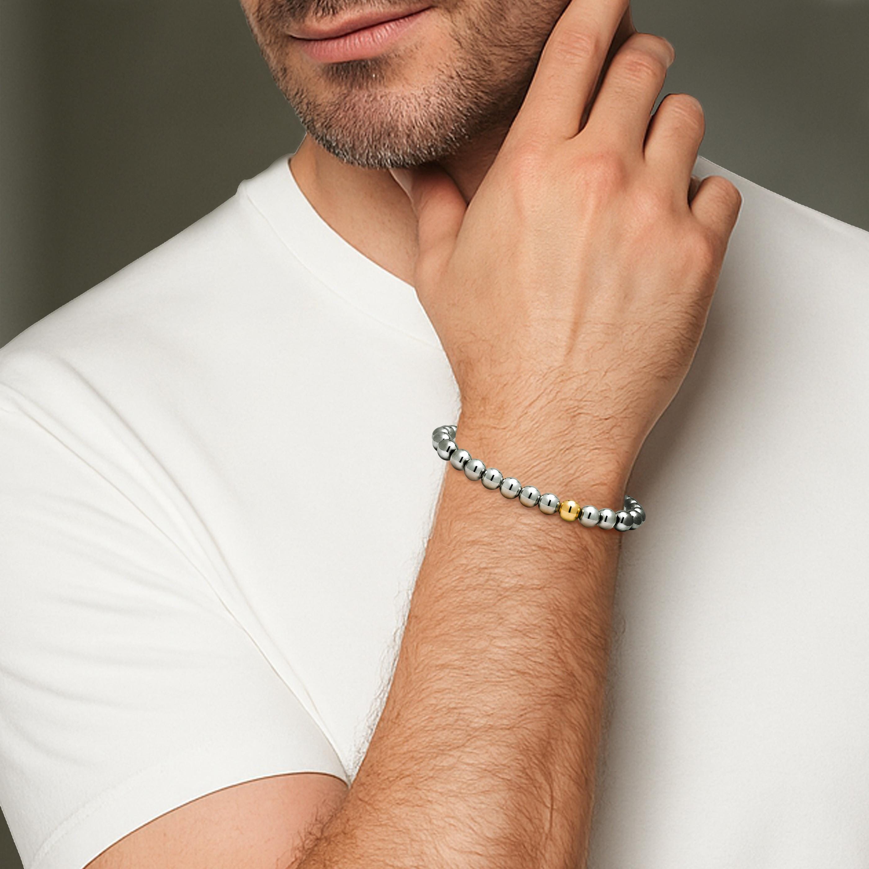 A refined expression of understated luxury, this bracelet is composed of 5mm polished stainless steel beads, seamlessly strung on an ultra-fine internal steel chain for both flexibility and strength. At its center, a sleek gold accent bead a subtle yet distinctive contrast, staying true to the brand’s clean, architectural aesthetic.