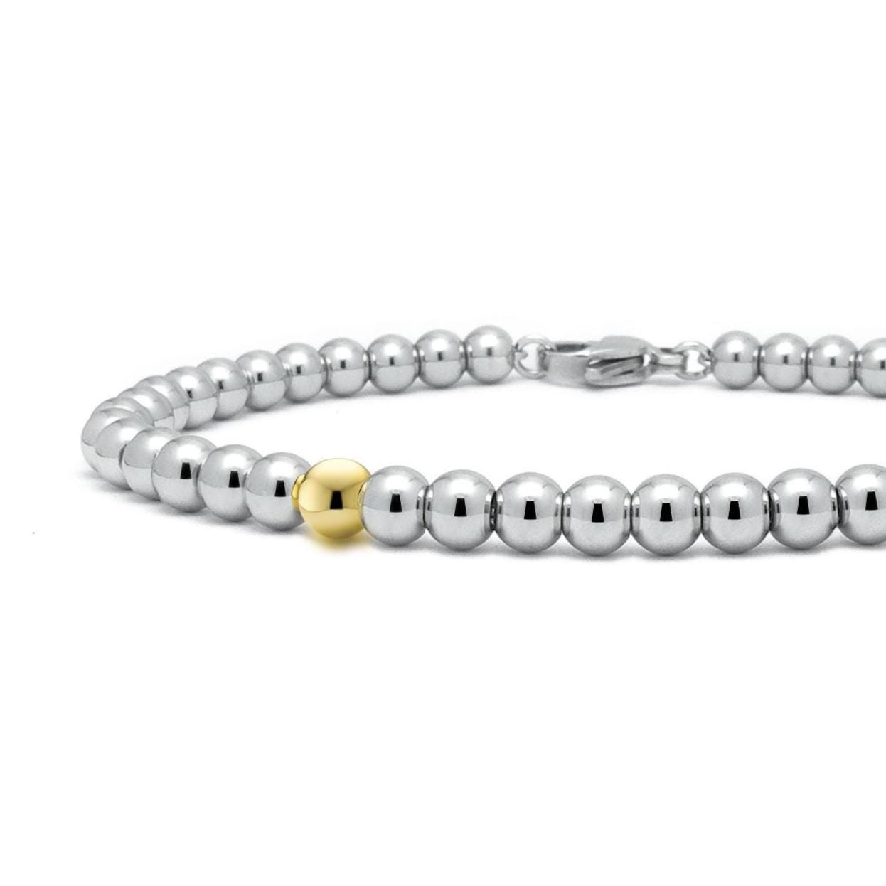 A refined expression of understated luxury, this bracelet is composed of 5mm polished stainless steel beads, seamlessly strung on an ultra-fine internal steel chain for both flexibility and strength. At its center, a sleek gold accent bead a subtle yet distinctive contrast, staying true to the brand’s clean, architectural aesthetic.