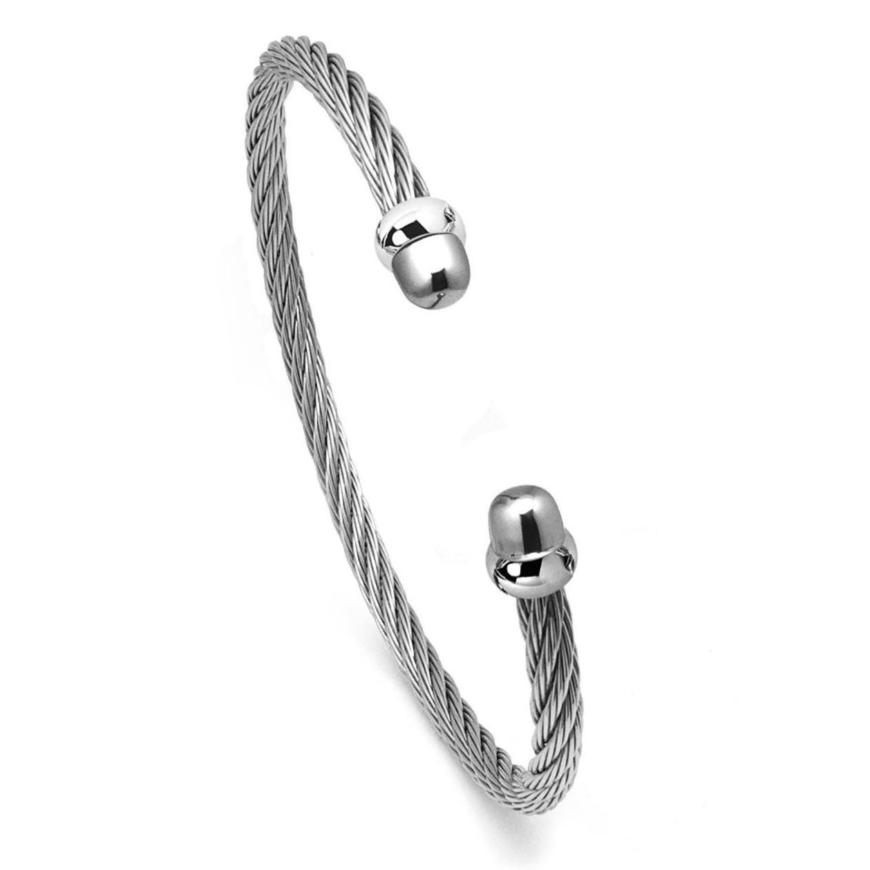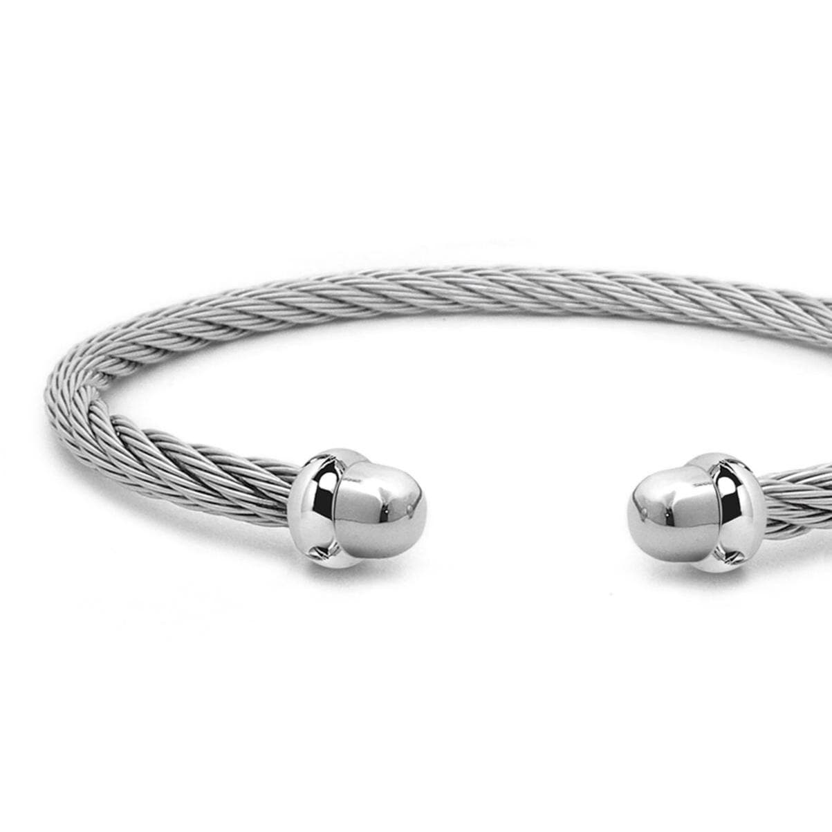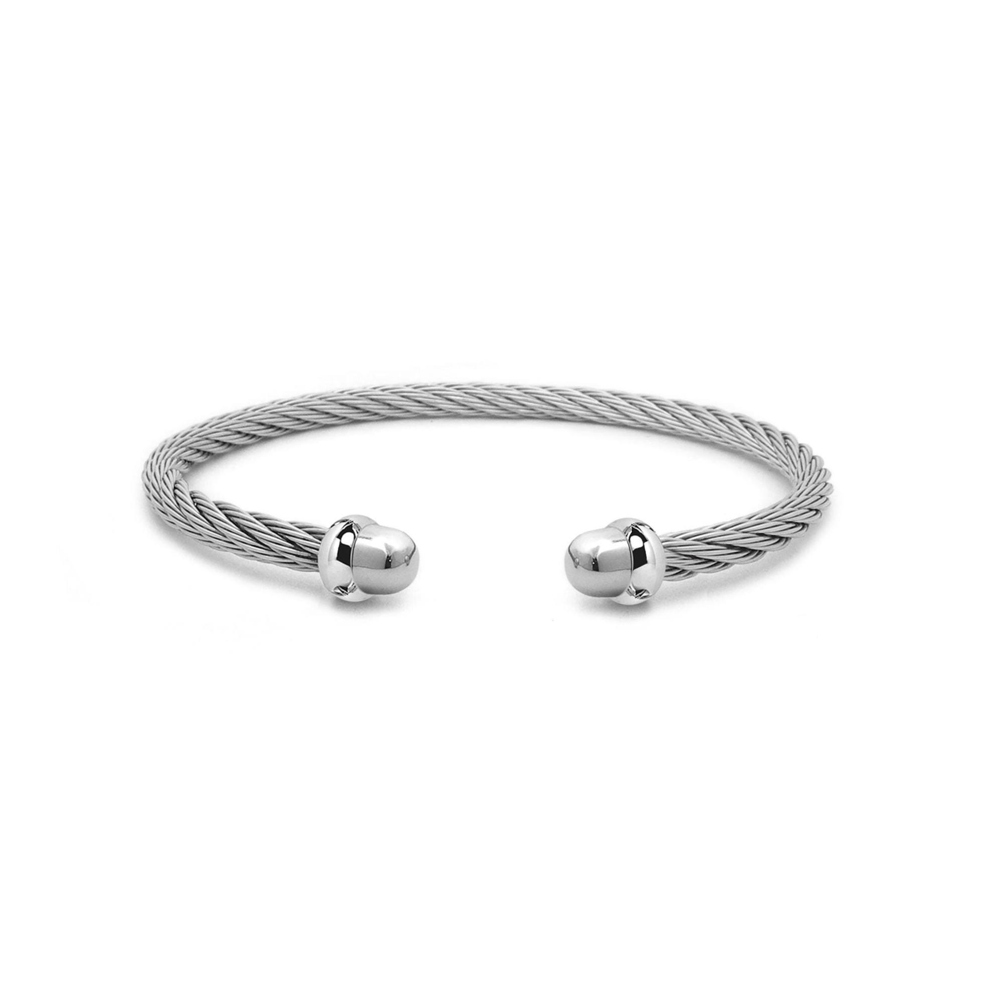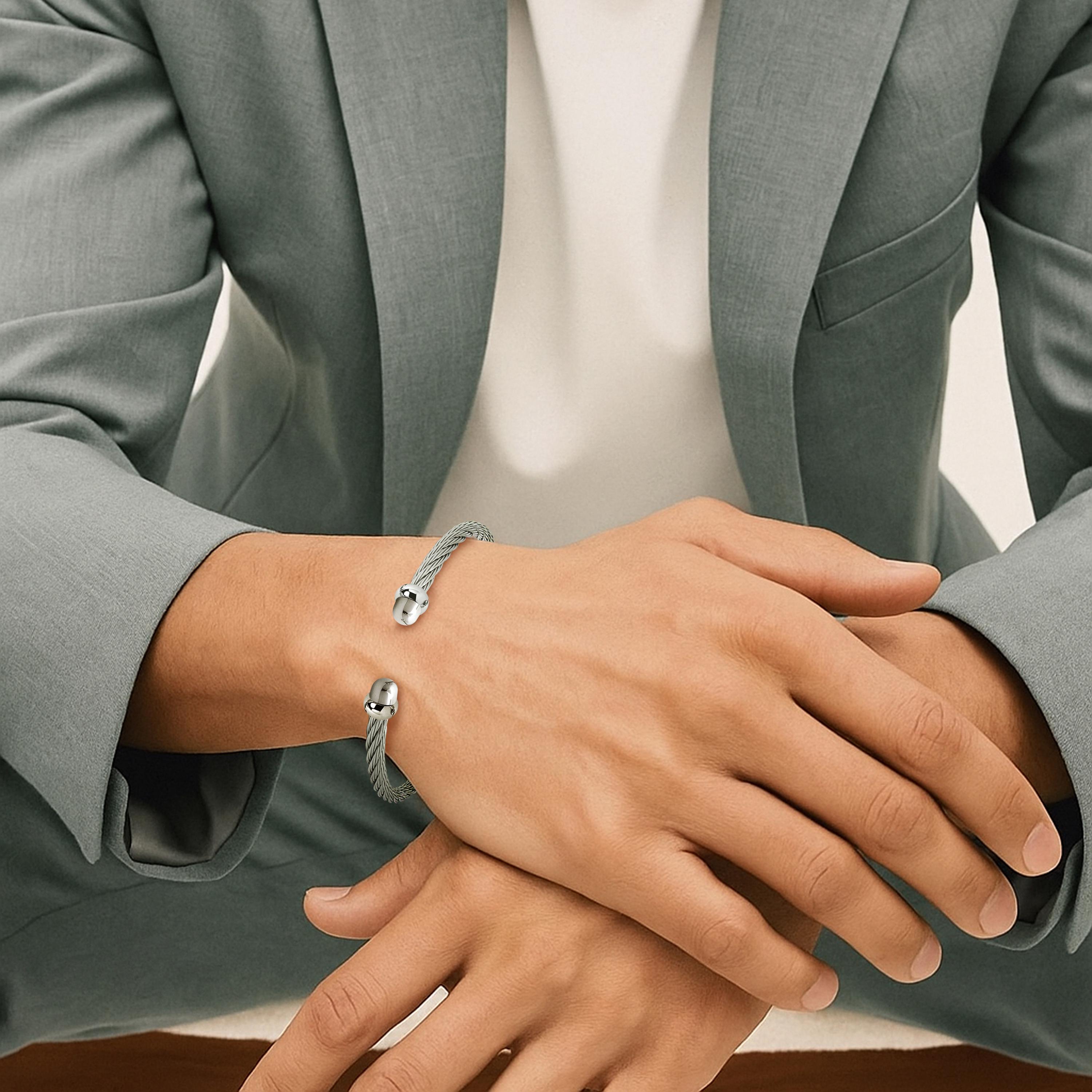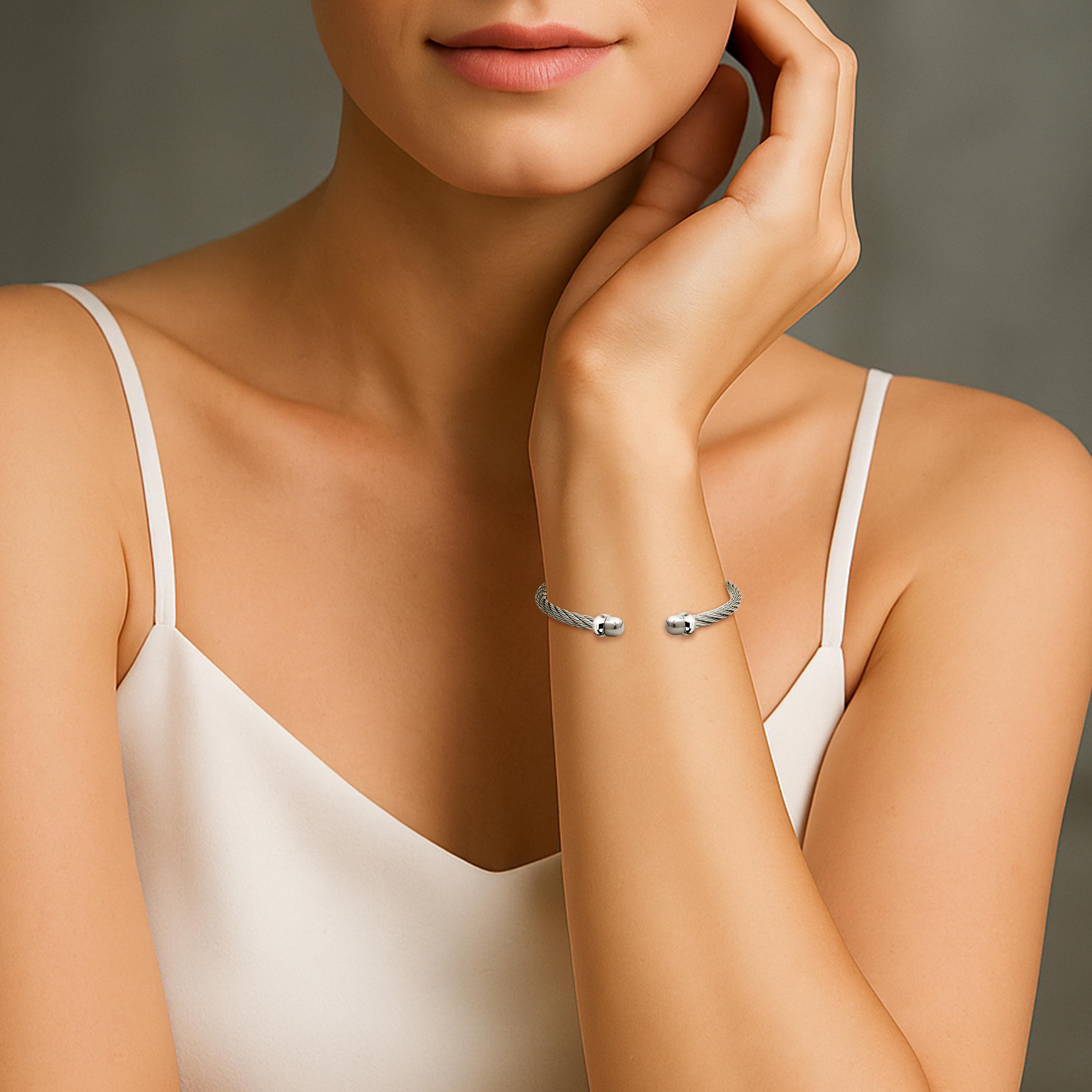 Engineered for minimalist sophistication, this open cuff bracelet features a clean, clasp-free silhouette made entirely from high-tensile flexible stainless steel cable ending with two Cup accents for a bold touch. The open-ended design ensures a seamless look while offering exceptional flexibility and security through natural cable tension — no moving parts, no closures, just effortless functionality.
