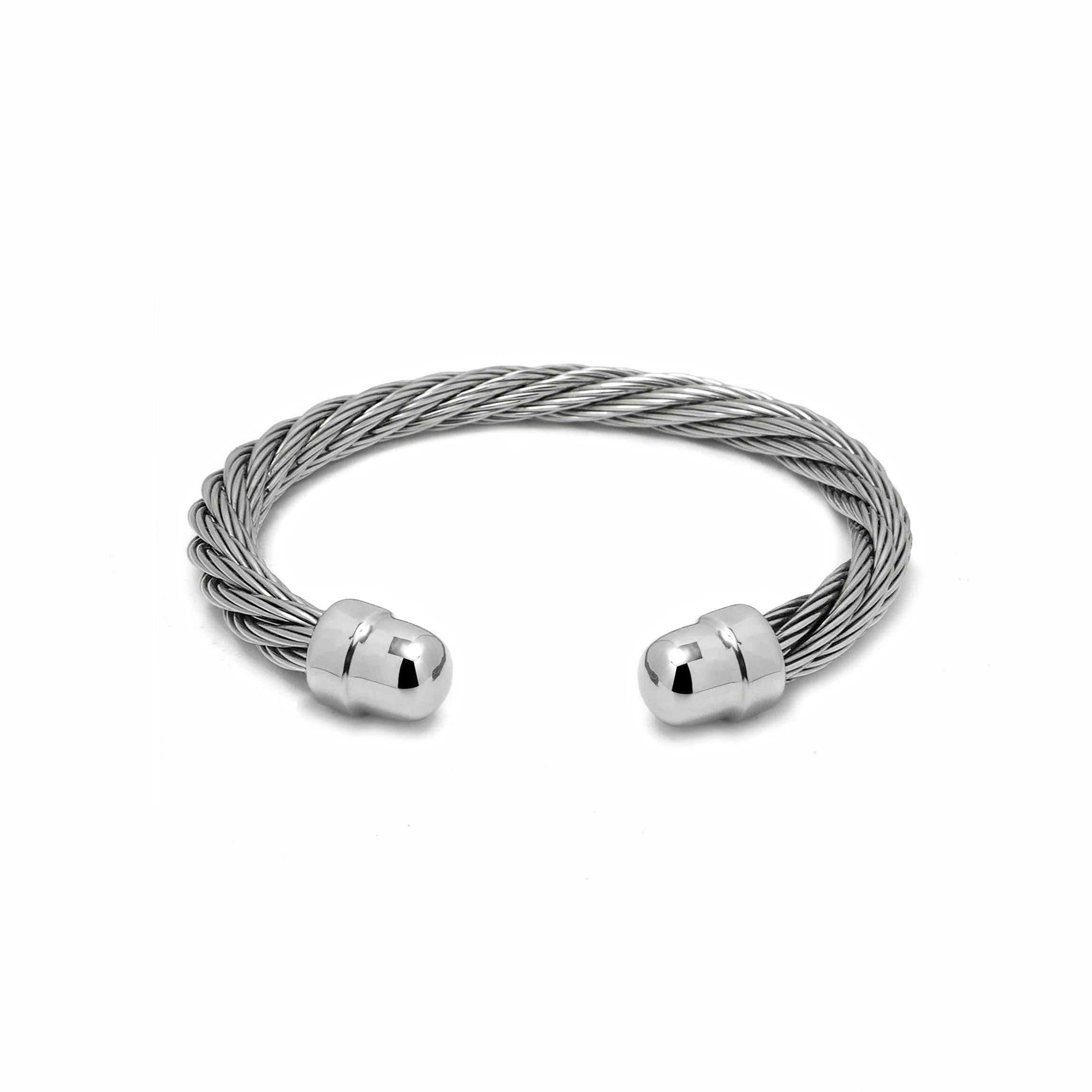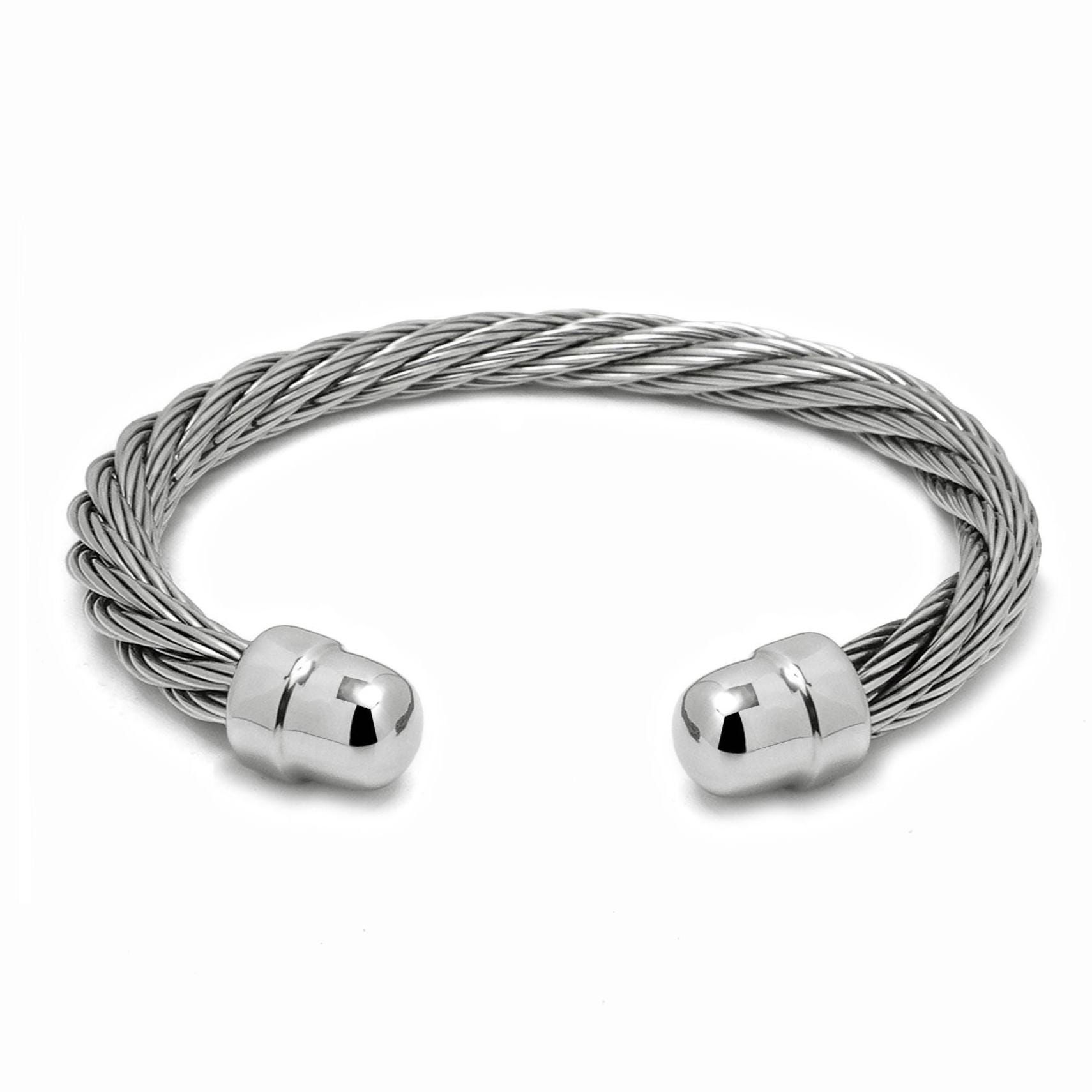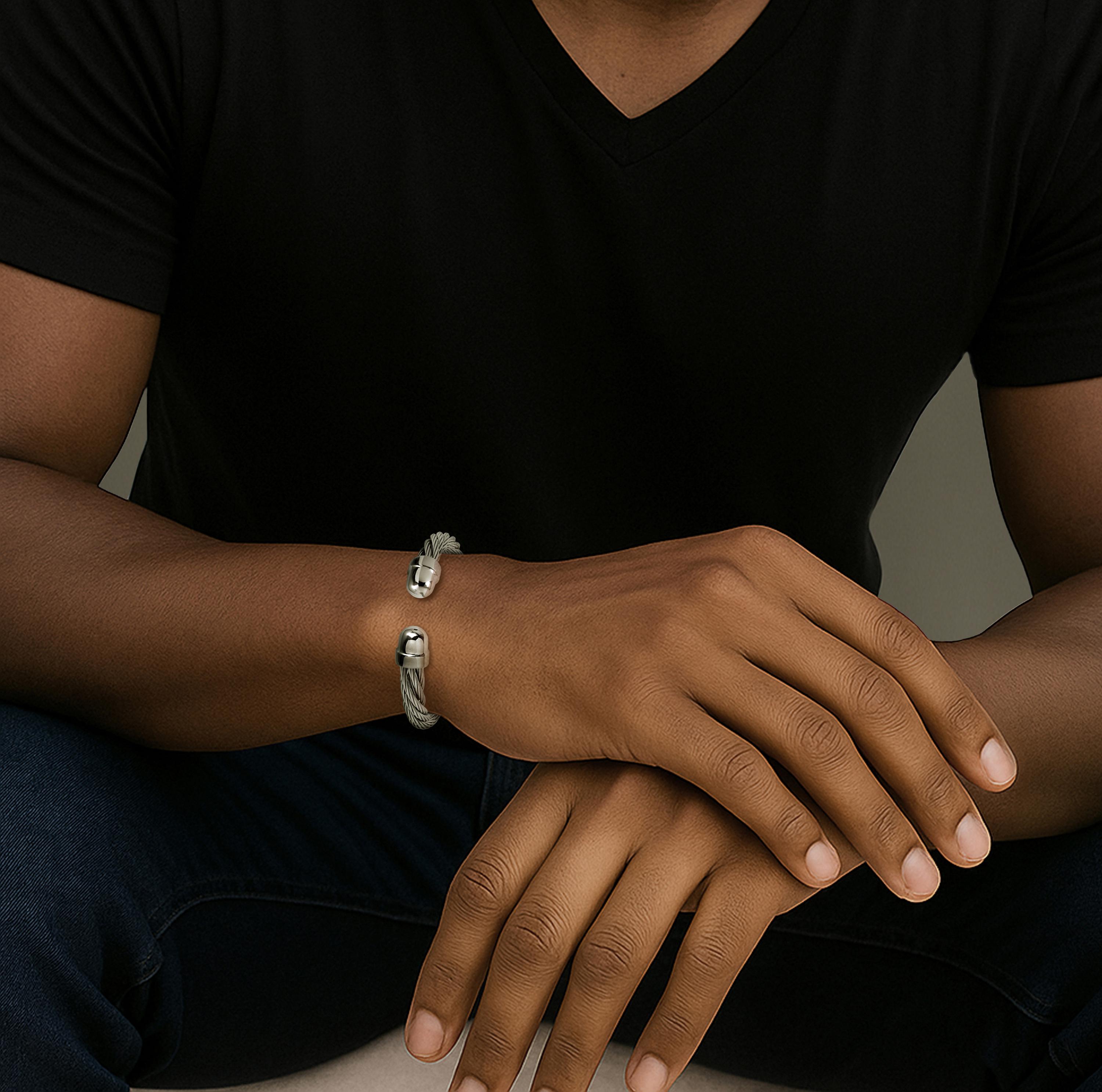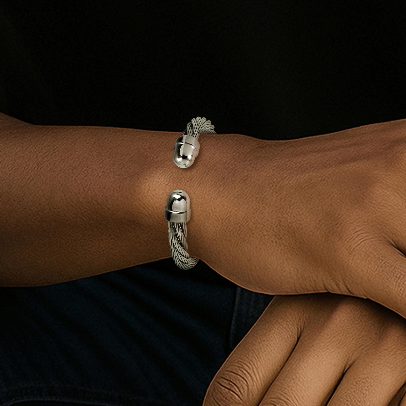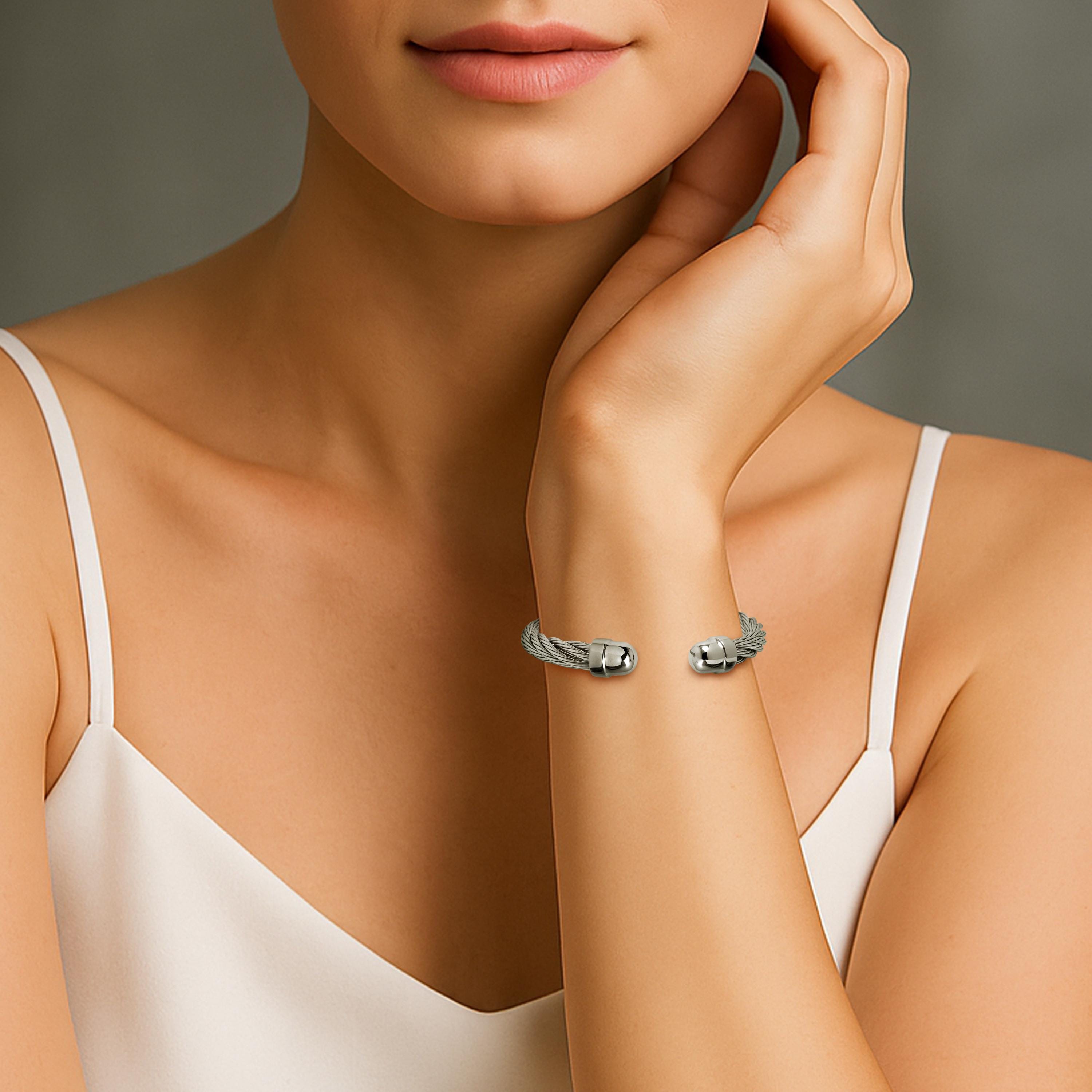 Engineered for minimalist sophistication, this bold open cuff bracelet features a clean, clasp-free silhouette made entirely from authentic, high-tensile stainless steel wire rope.