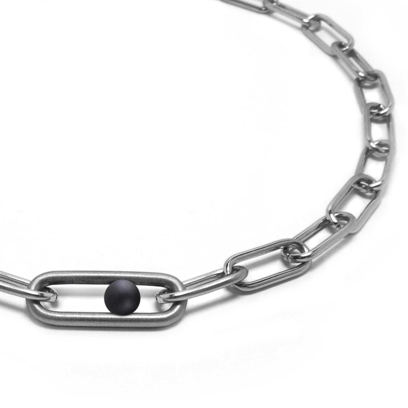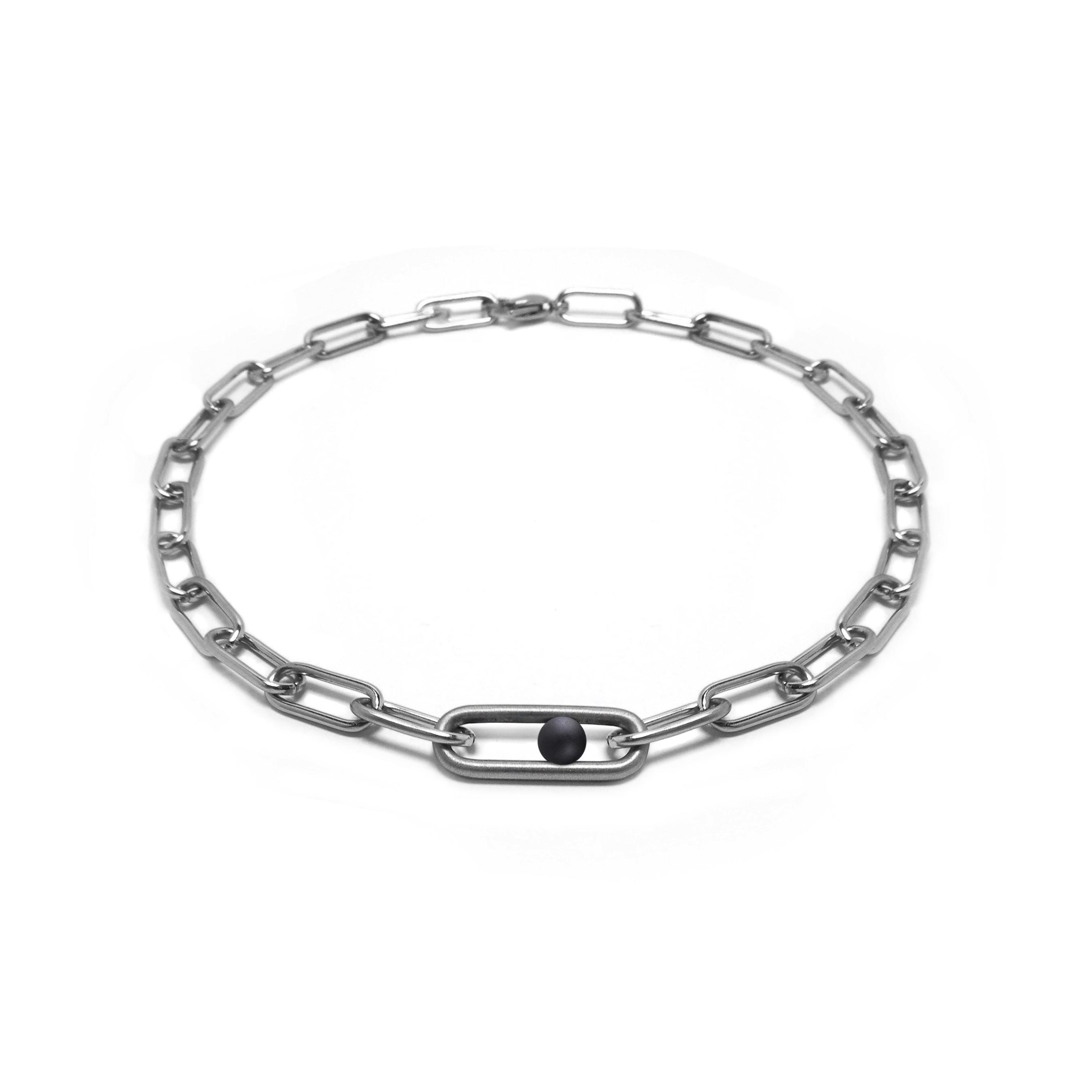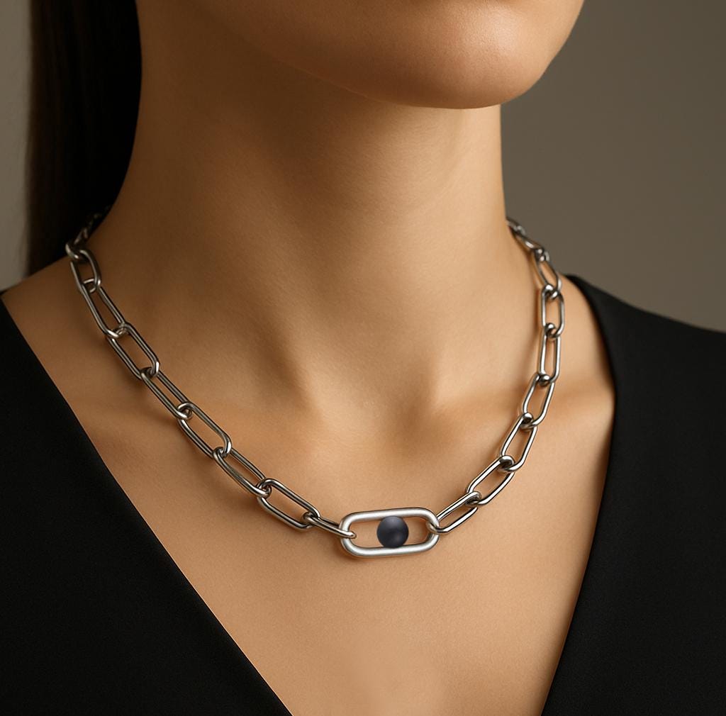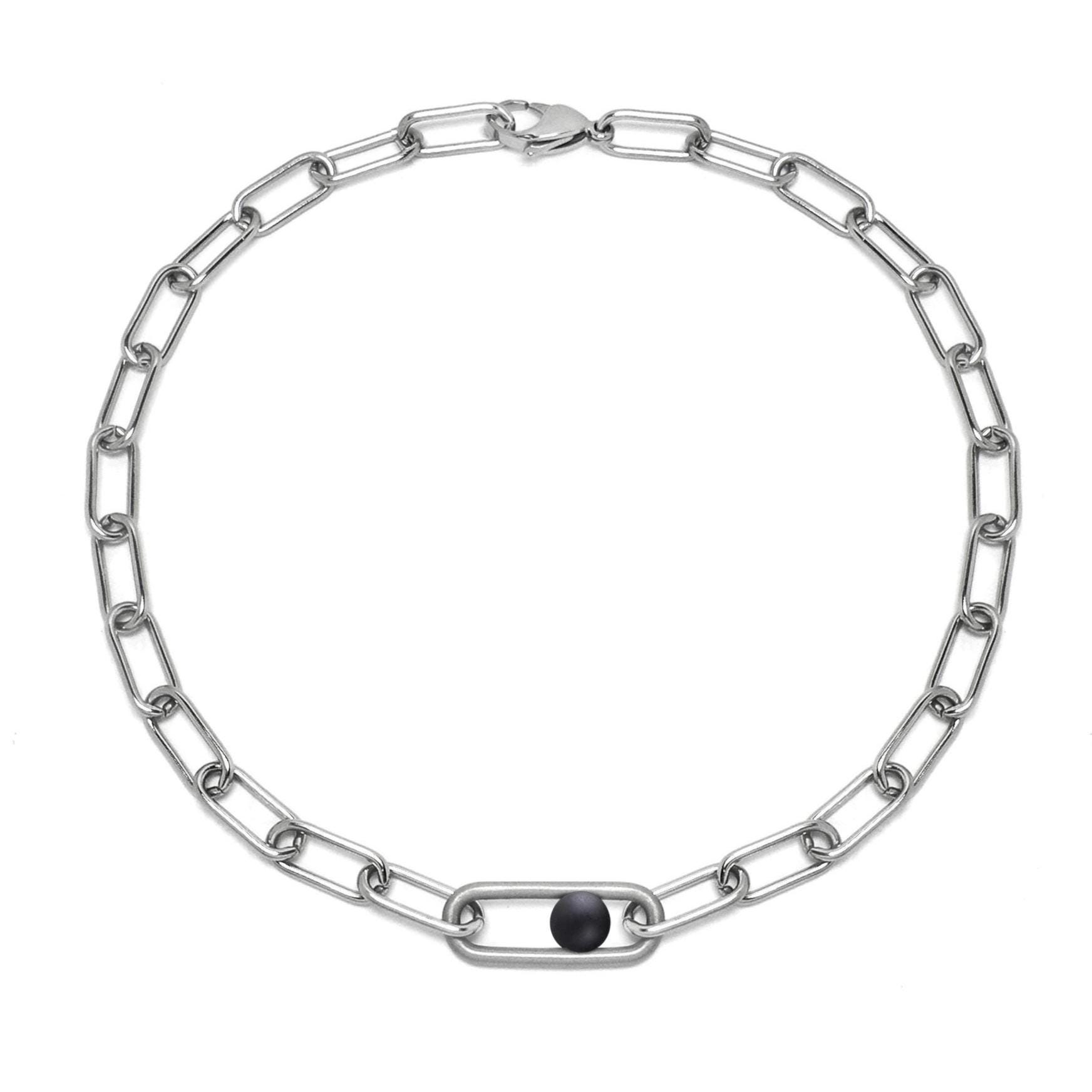 A bold take on the iconic paperclip silhouette. This necklace is crafted in premium 316L stainless steel and features elongated, rectangular links for a clean, architectural feel. The satin-finish oversized center link adds a refined contrast, elevating the minimal design with subtle texture and sophistication. Within this brushed central link, a smooth, matte black obsidian bead is securely set between its two bars, creating a striking interplay of texture and color. Perfect for those who embrace timeless design with a contemporary edge symbolizing unity and functionality..