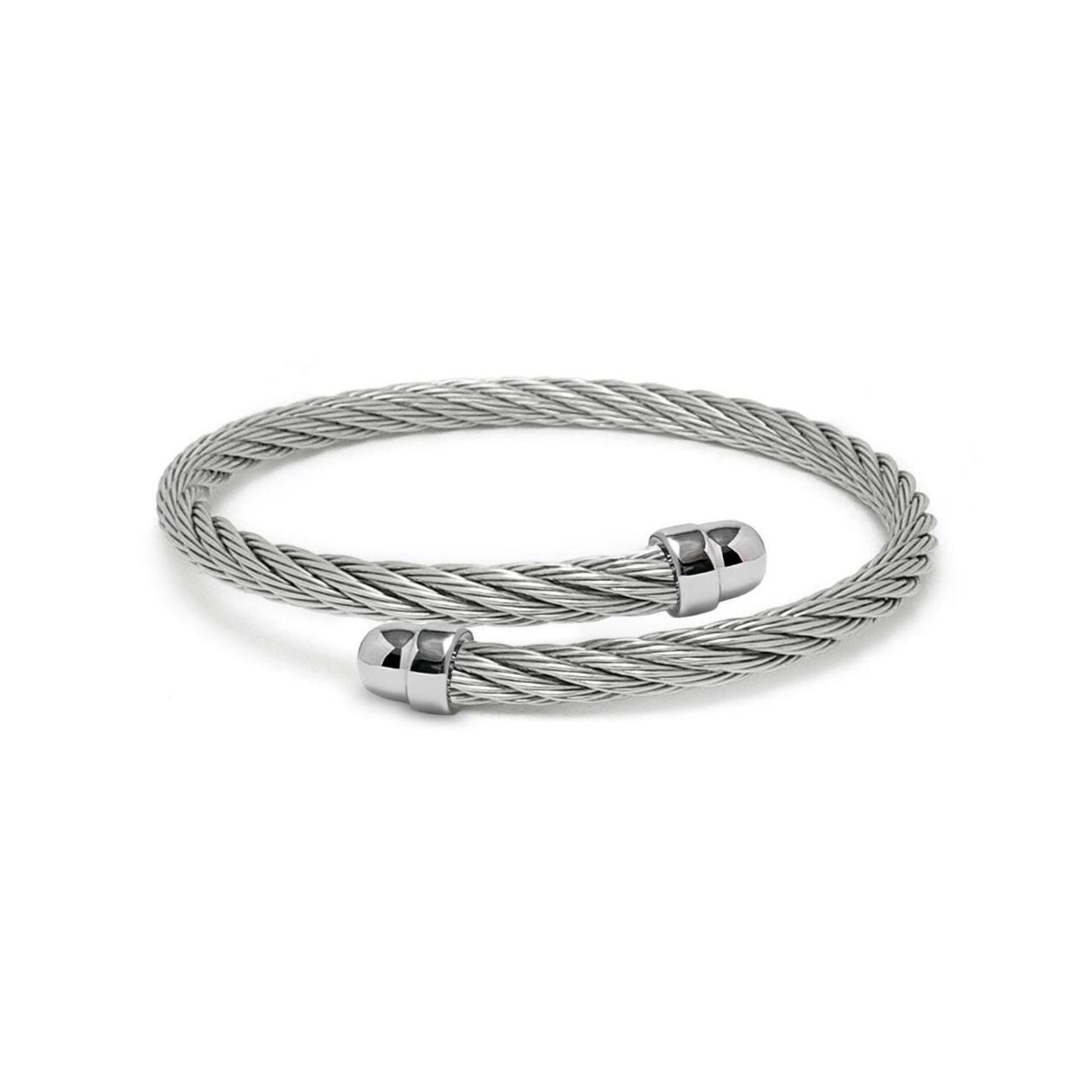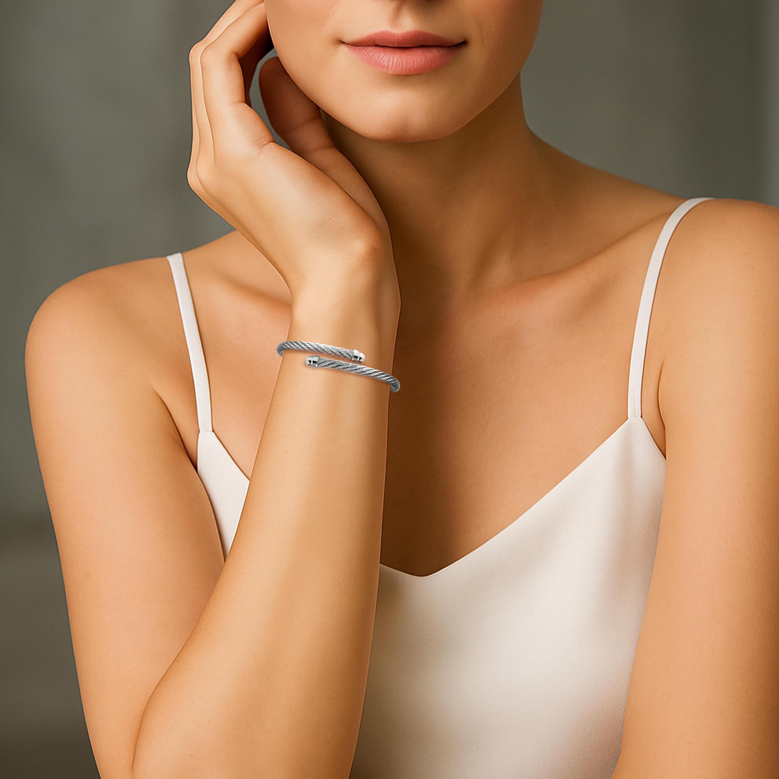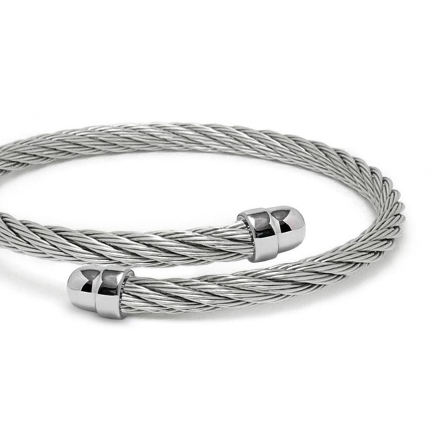 Engineered for minimalist sophistication, this bypass cuff bracelet features a clean, clasp-free silhouette made entirely from authentic, high-tensile stainless steel wire rope. A perfect blend of industrial strength and refined detail, is crafted from high-quality, flexible stainless steel cable ending with smooth, polished dome terminals. These end caps add a touch of understated elegance, elevating the minimalist design. It's easy to adjust and comfortable to wear, making it an ideal, durable piece that is water and wear-resistant. A versatile accessory suitable for any occasion, perfect to wear on its own or layered with other pieces, it is the ideal choice for those who love textural contrasts and clean, modern design.