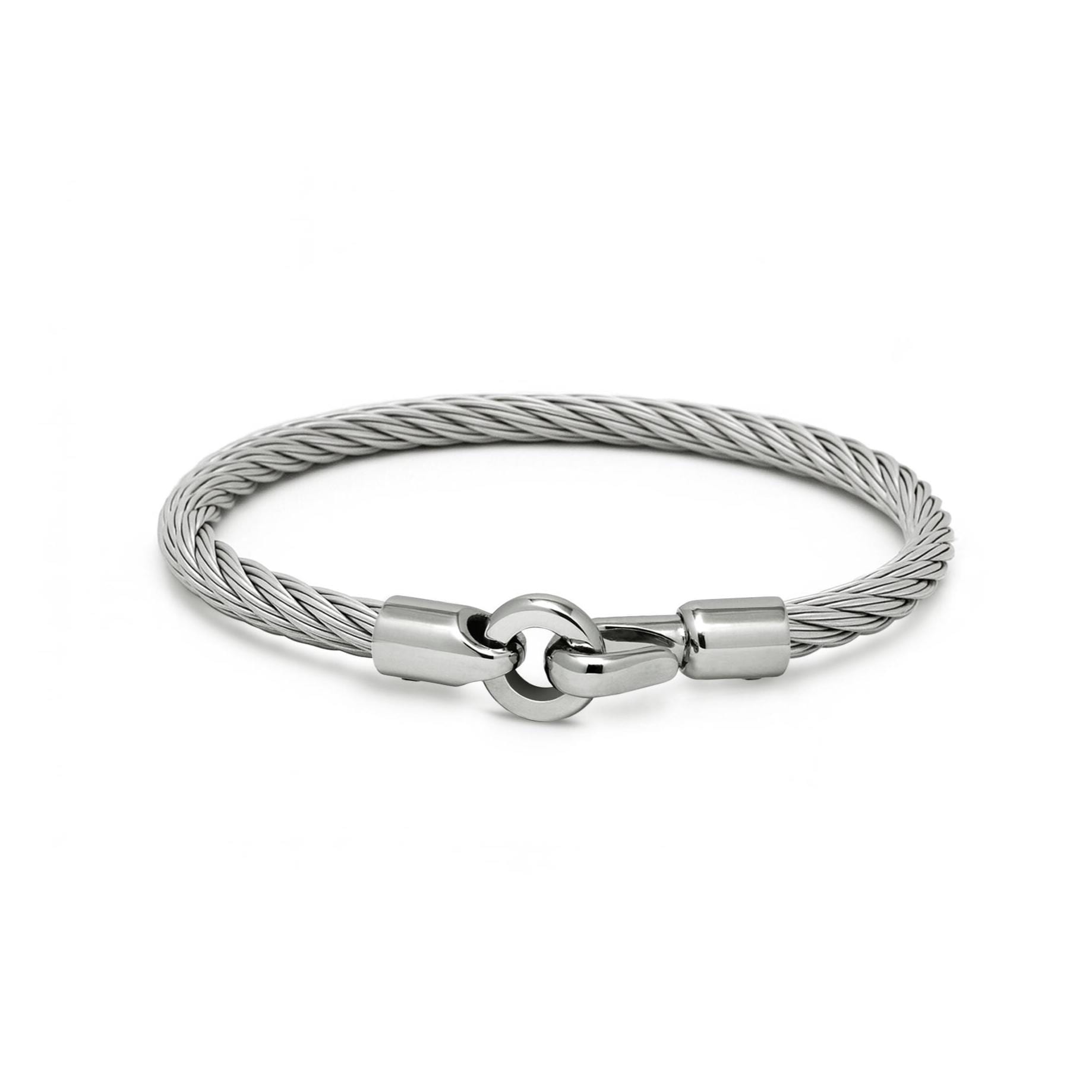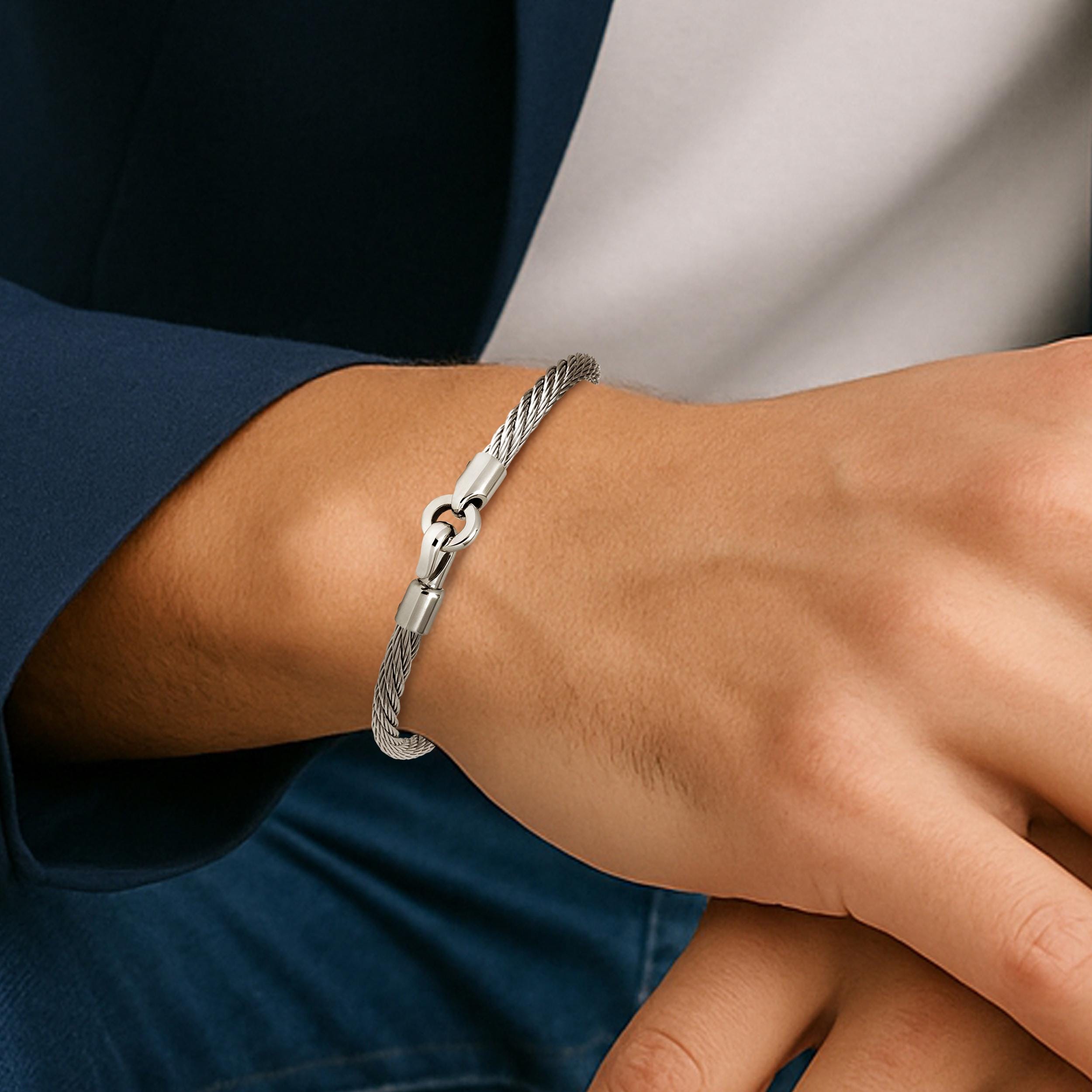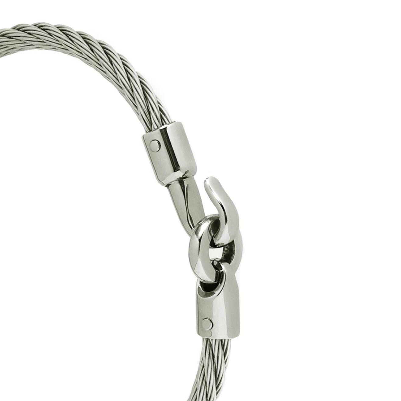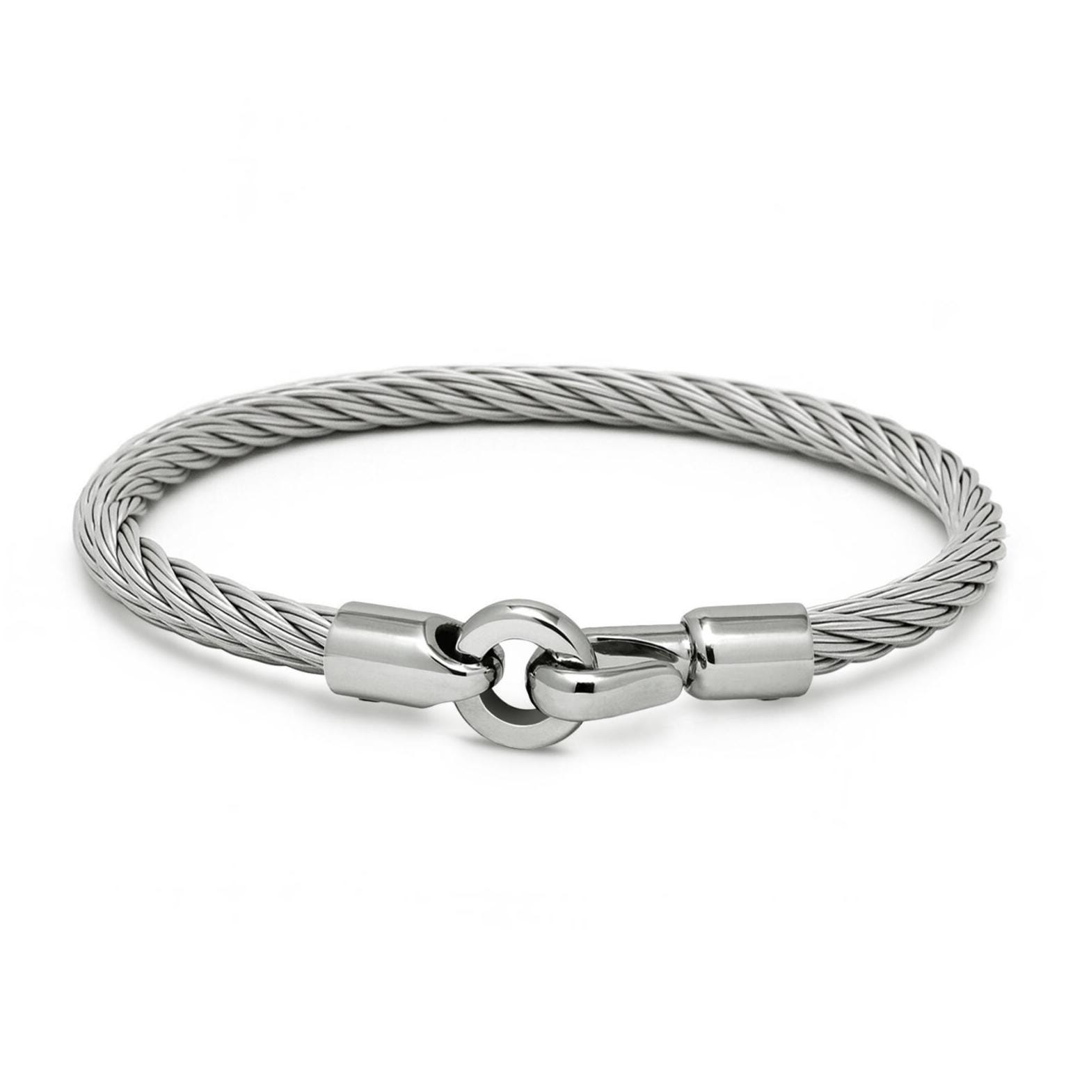 The bracelet features a 4mm twisted steel wire rope (cable) renowned for its exceptional durability, flexibility, and tarnish-free resilience. The natural elasticity of the cable ensures a comfortable, custom-like fit