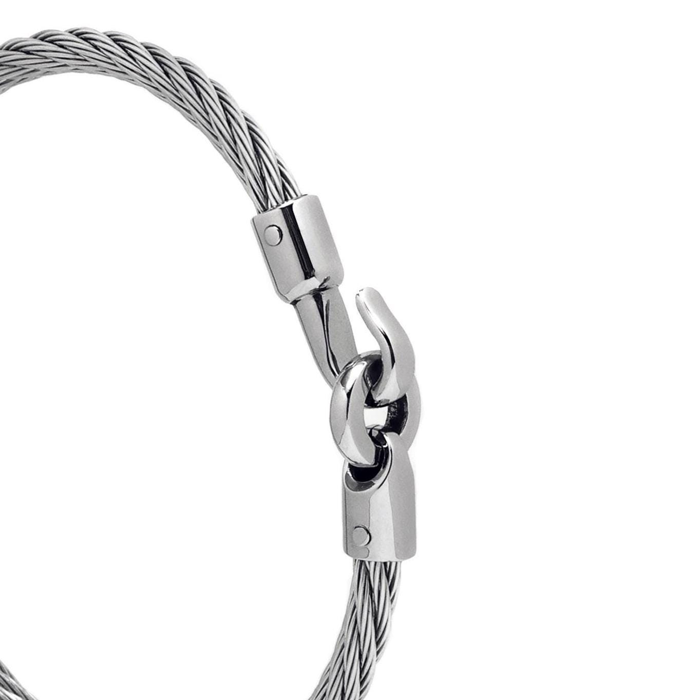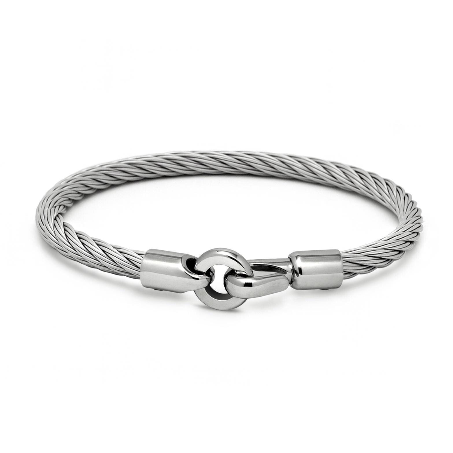 The bracelet features a 4mm twisted steel wire rope (cable) renowned for its exceptional durability, flexibility, and tarnish-free resilience. The natural elasticity of the cable ensures a comfortable, custom-like fit