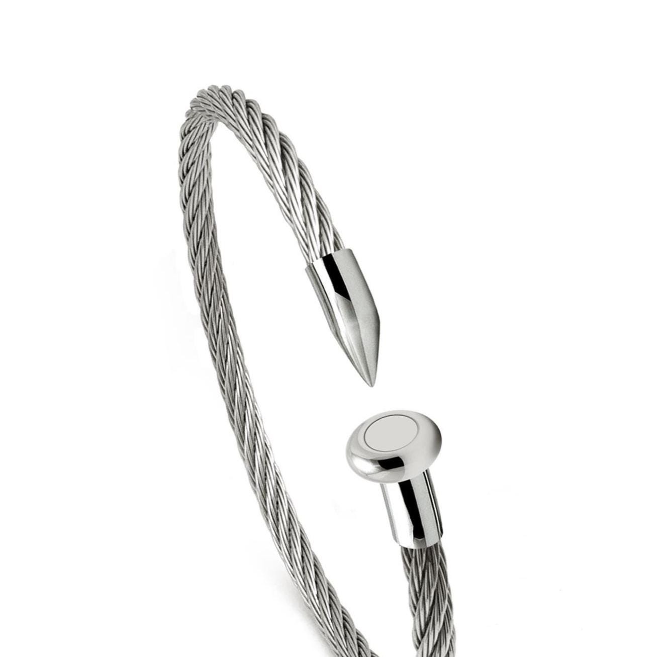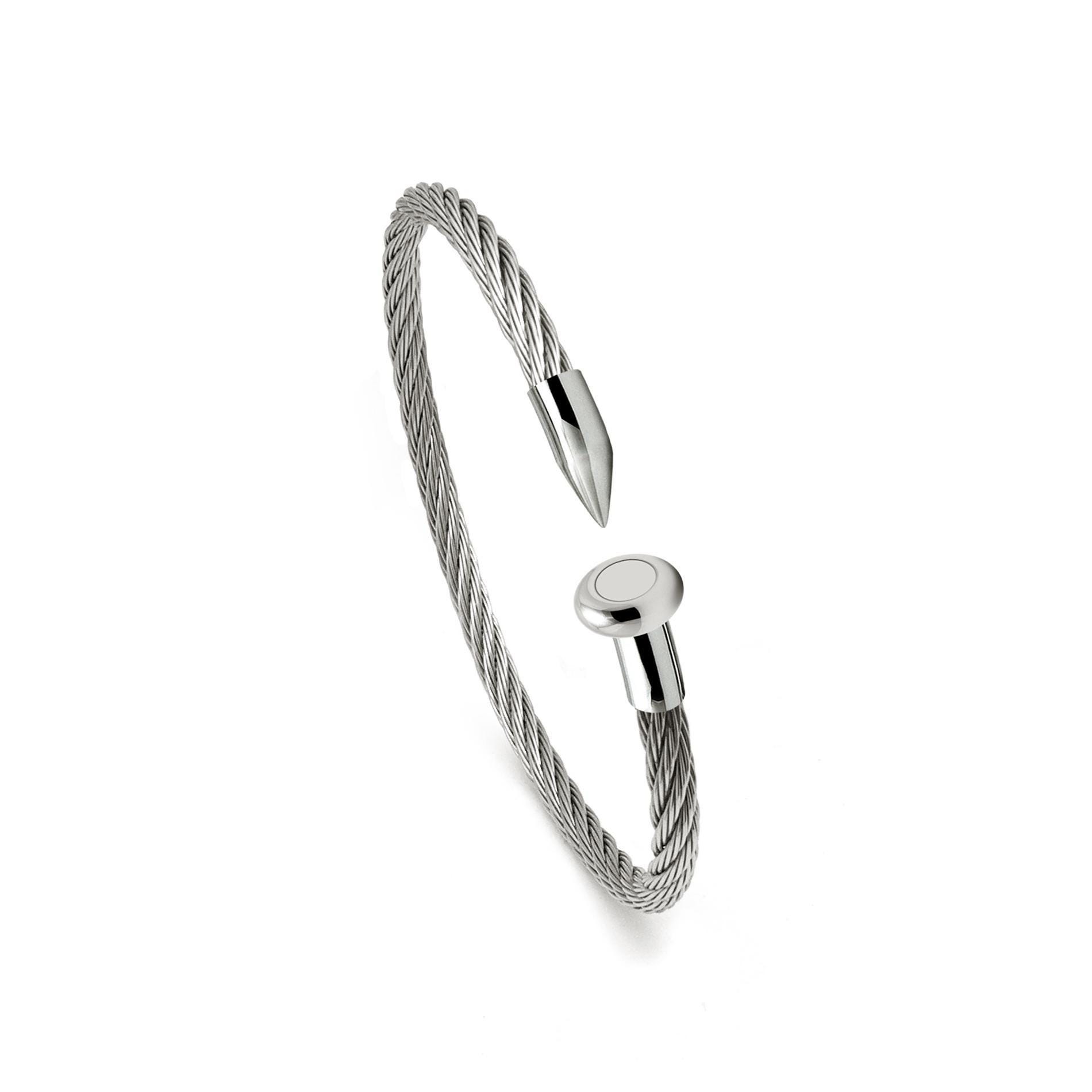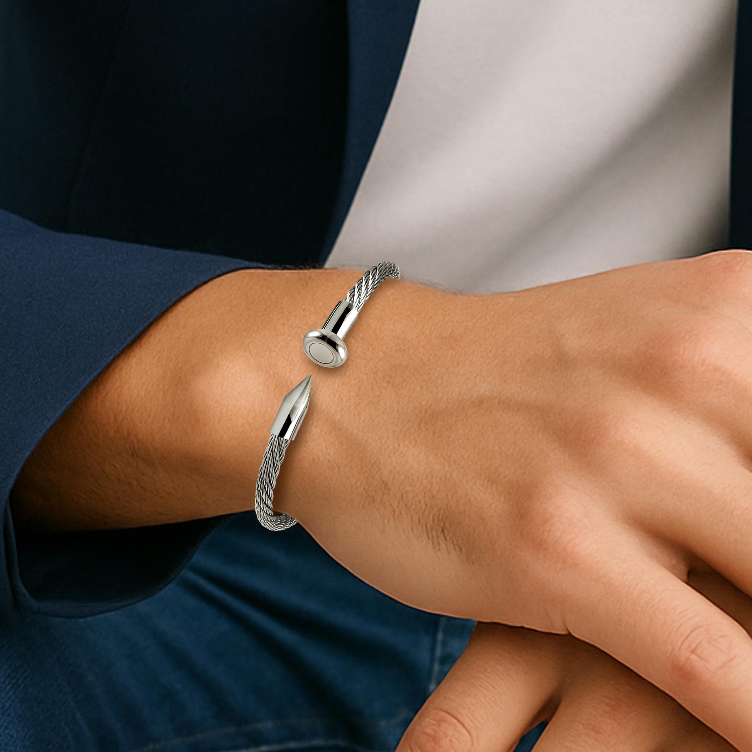 Elevate your everyday look with this eye-catching and durable unisex cuff. Crafted from a strong 4mm twisted stainless steel cable, this bracelet is defined by its striking Nail Head terminals, which lend an industrial, edgy aesthetic to a classic design. It’s perfect for the customer who appreciates jewelry with character and strength.