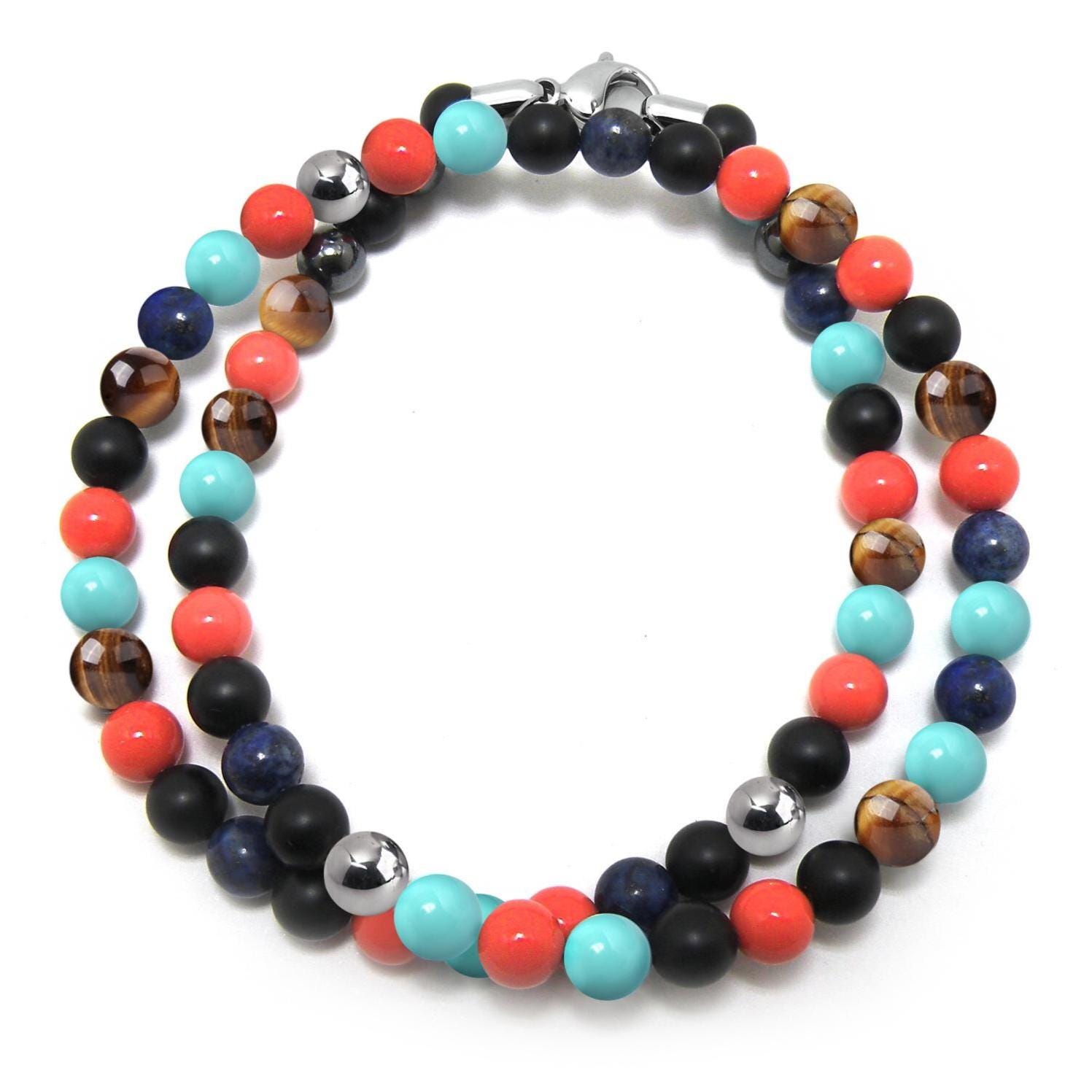 Beads paillette: tiger's eye, obsidian, steel, hematite, coral, turquoise, lapis lazuli, lapis lazuli.