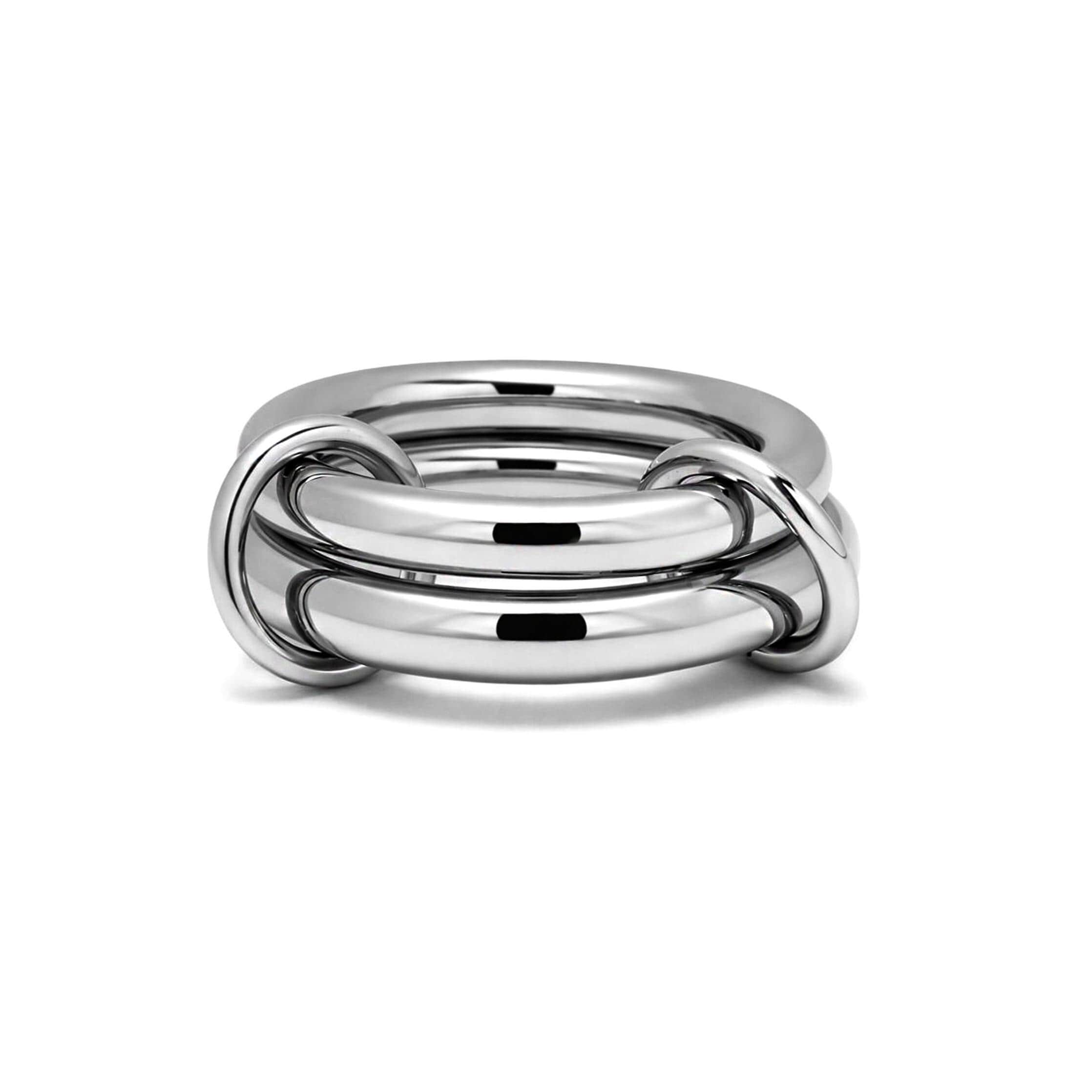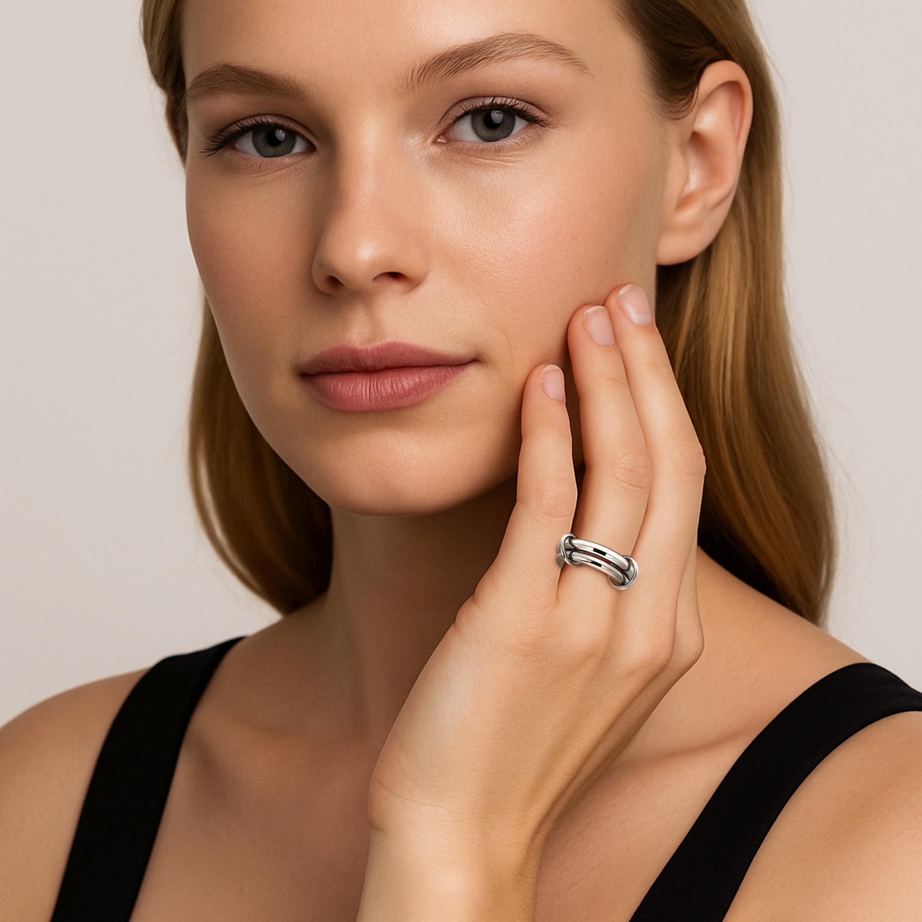 Stripped of adornments to honor its minimalist soul, the design relies on the interplay of light across its polished surfaces. Two integrated connector rings link the bands together, for a statement look. It is a versatile Wearable Sculpture designed for those who appreciate engineering as art.