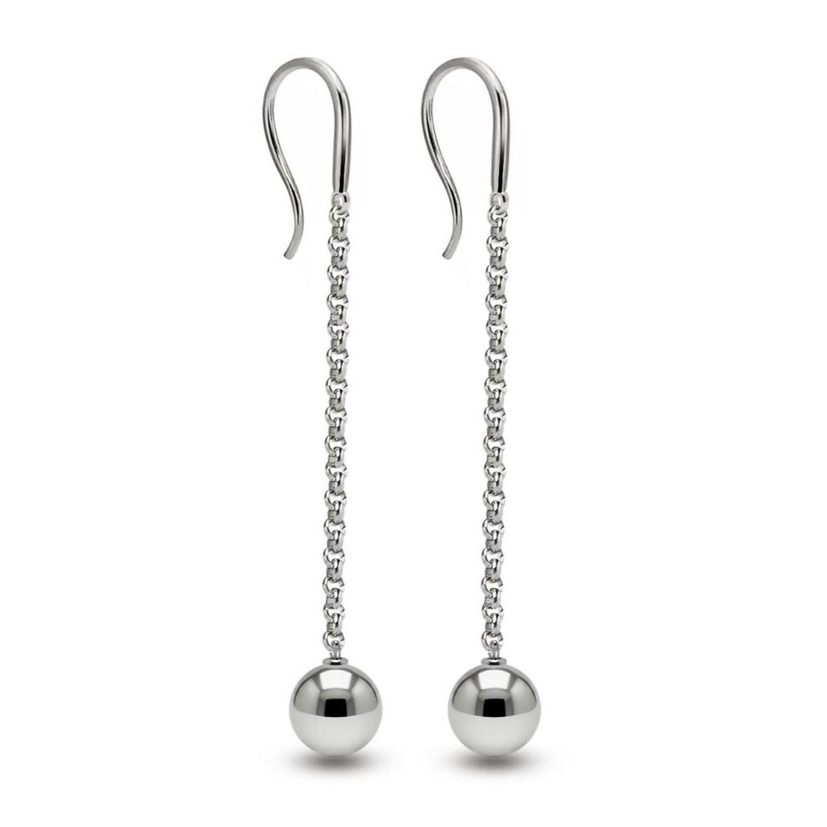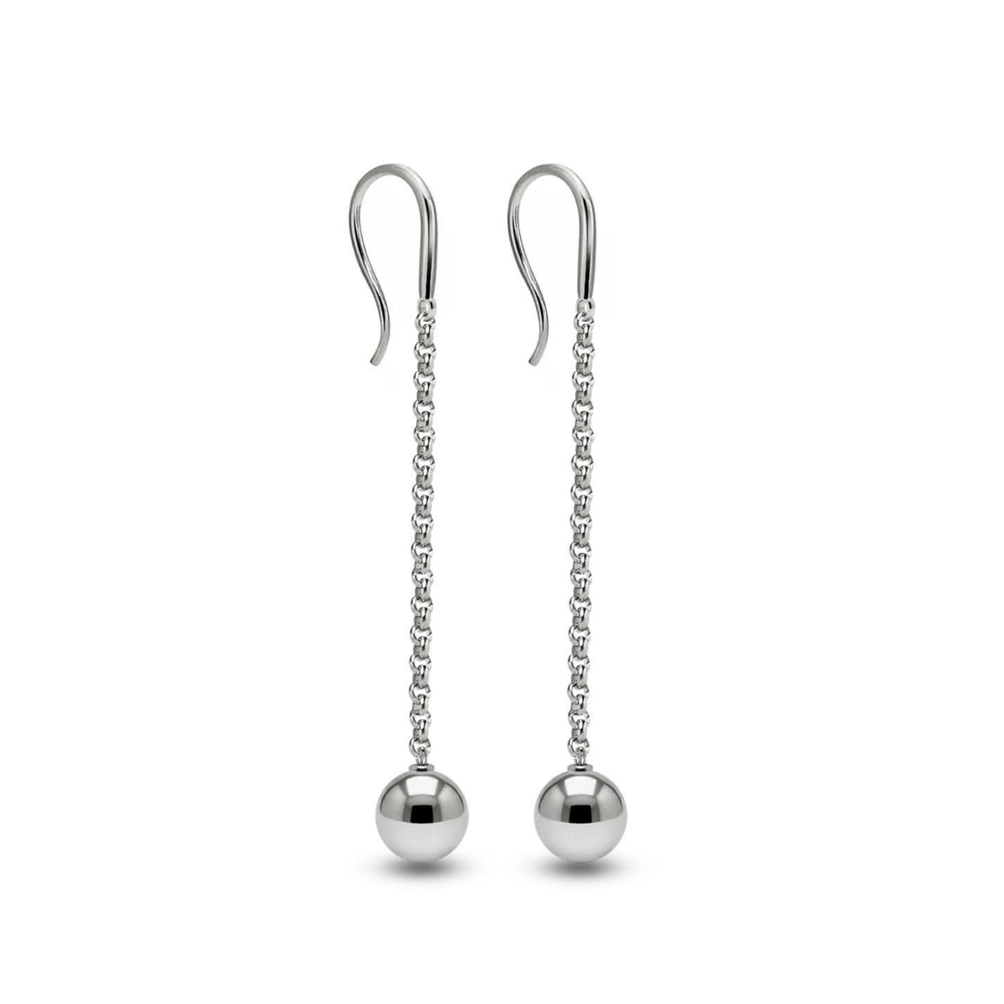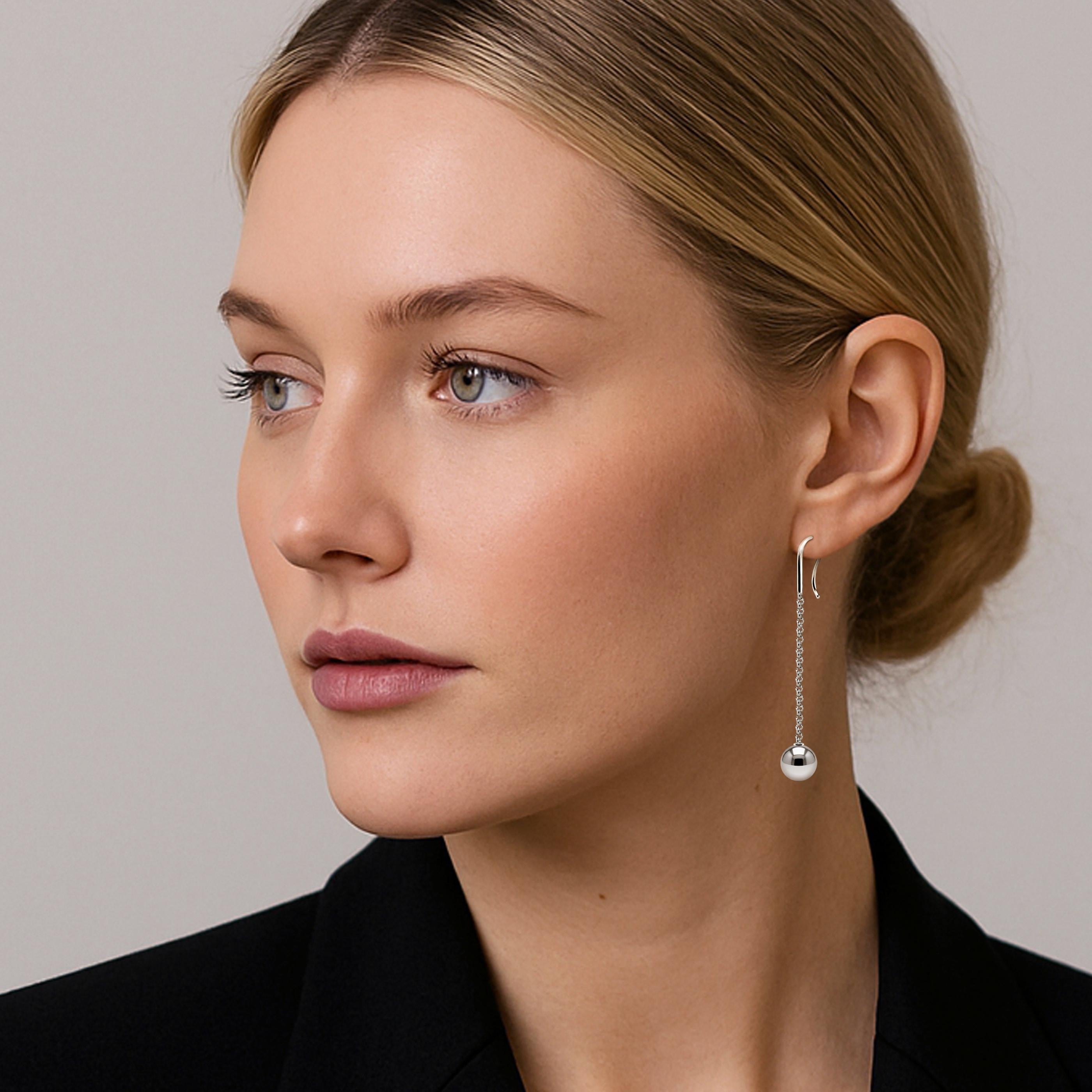 Refined and contemporary, these minimalist drop earrings feature a sleek stainless steel chain and hook, paired with a polished steel sphere. The sphere is securely fixed at the base, adding a bold yet elegant statement to your look. A perfect balance of clean design and distinctive charm—crafted for those who appreciate subtle luxury and timeless style.