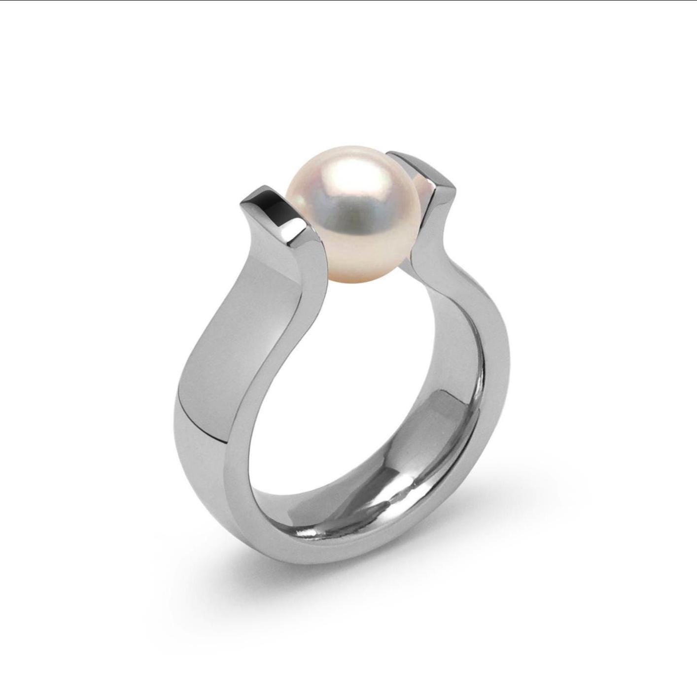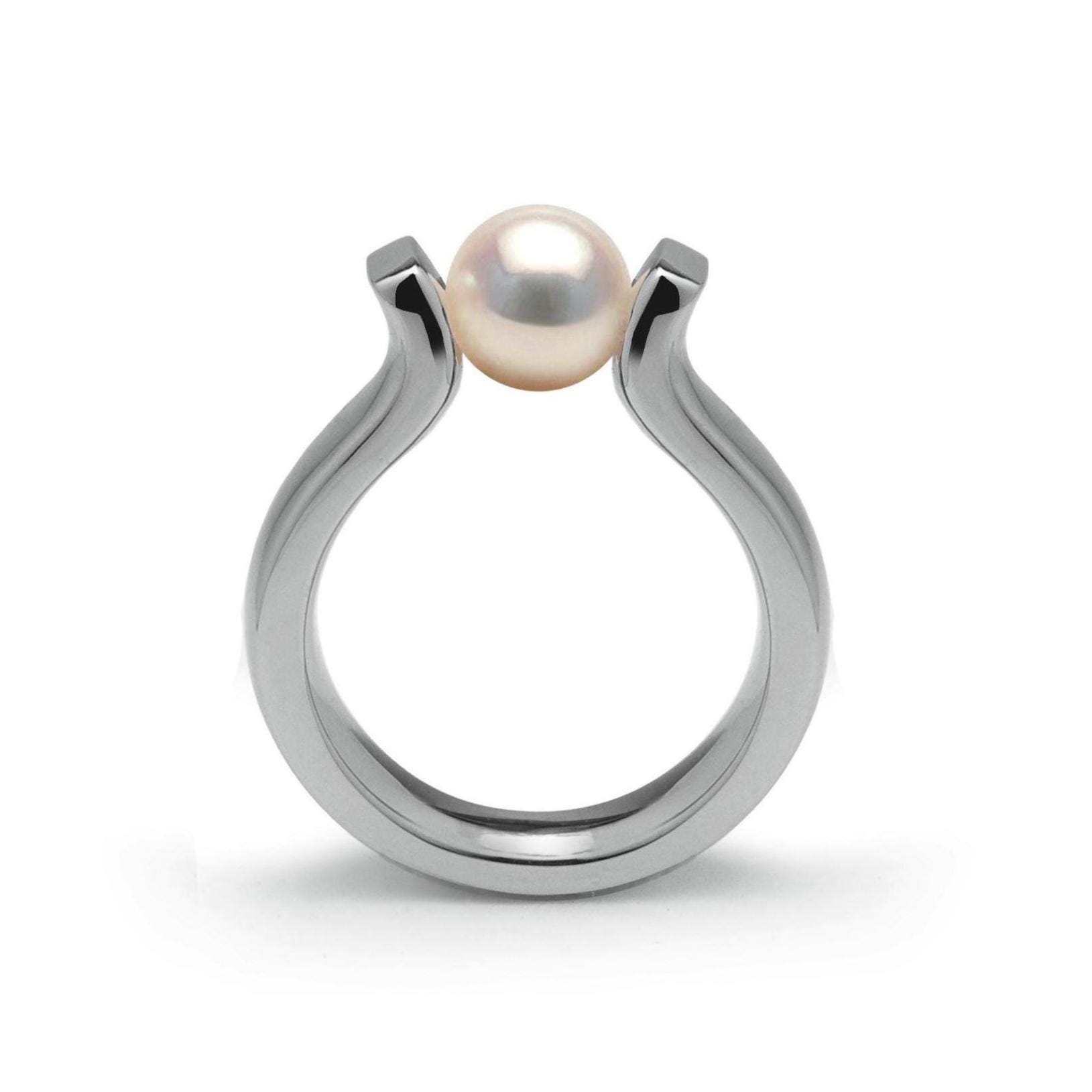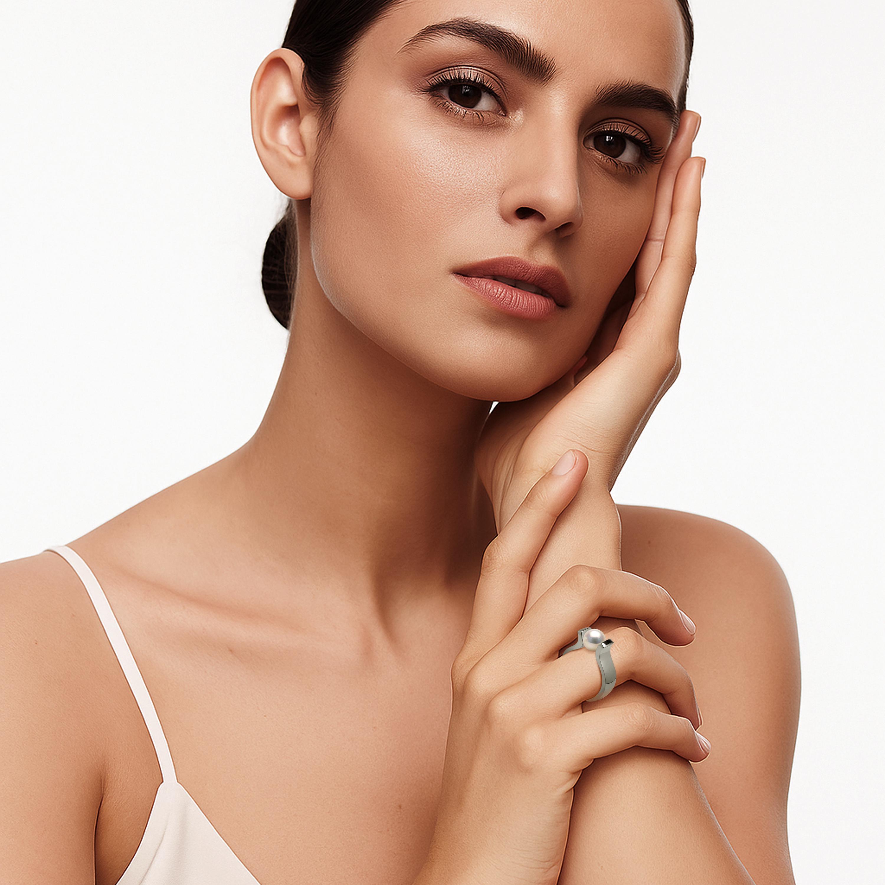 Inspired by the graceful form of the ancient lyre, this modern ring fuses classical beauty with cutting-edge design. Sculpted in high-polished stainless steel, its open arc silhouette cradles a white cultured pearl in a tension setting, creating a floating effect that feels both architectural and ethereal.