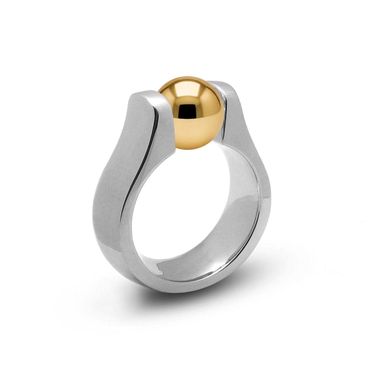 At its core is a striking gold sphere, held in place by a precision tension setting—no prongs, no distractions. The sphere appears to float in mid-air, adding a sense of lightness and visual intrigue to the ring’s solid structure.