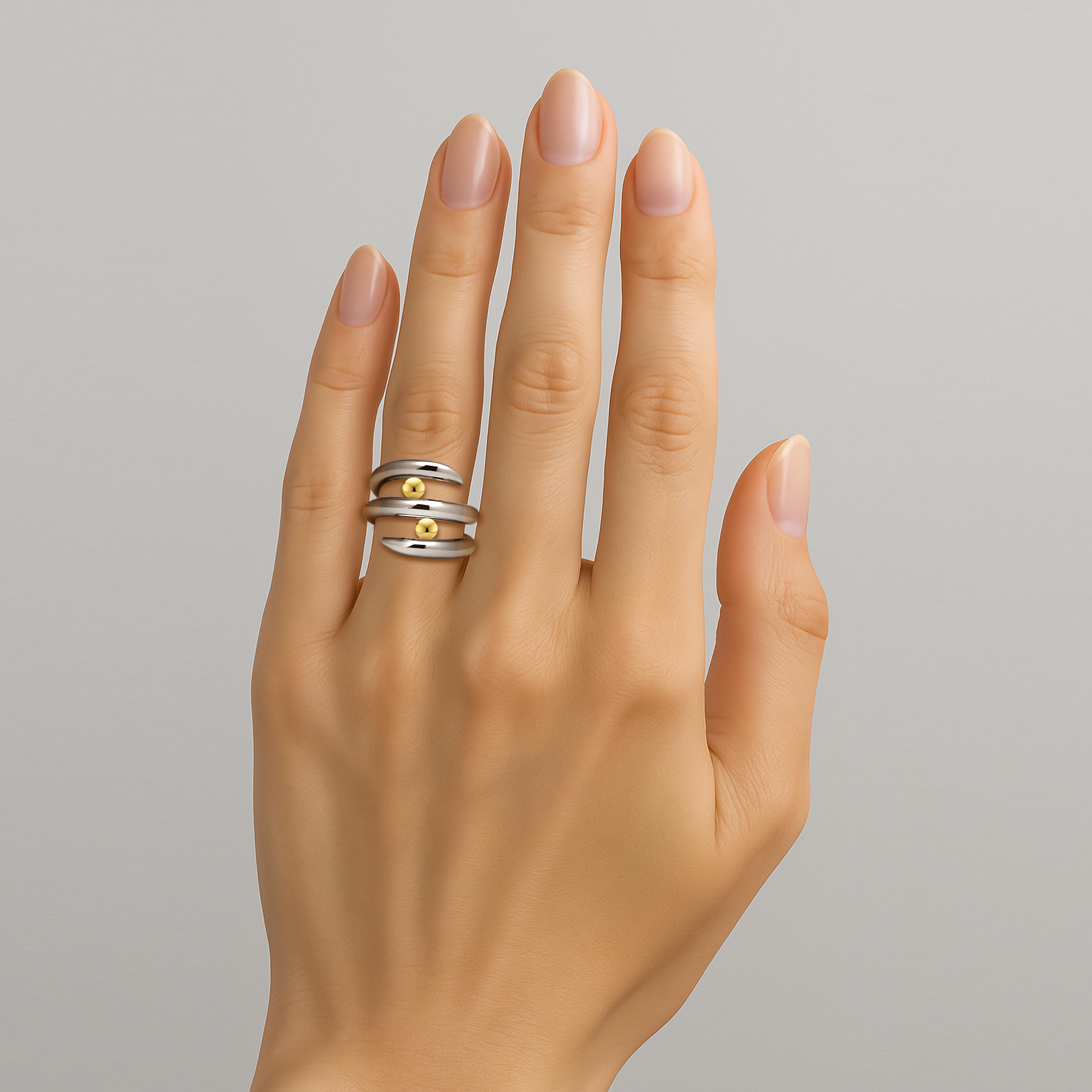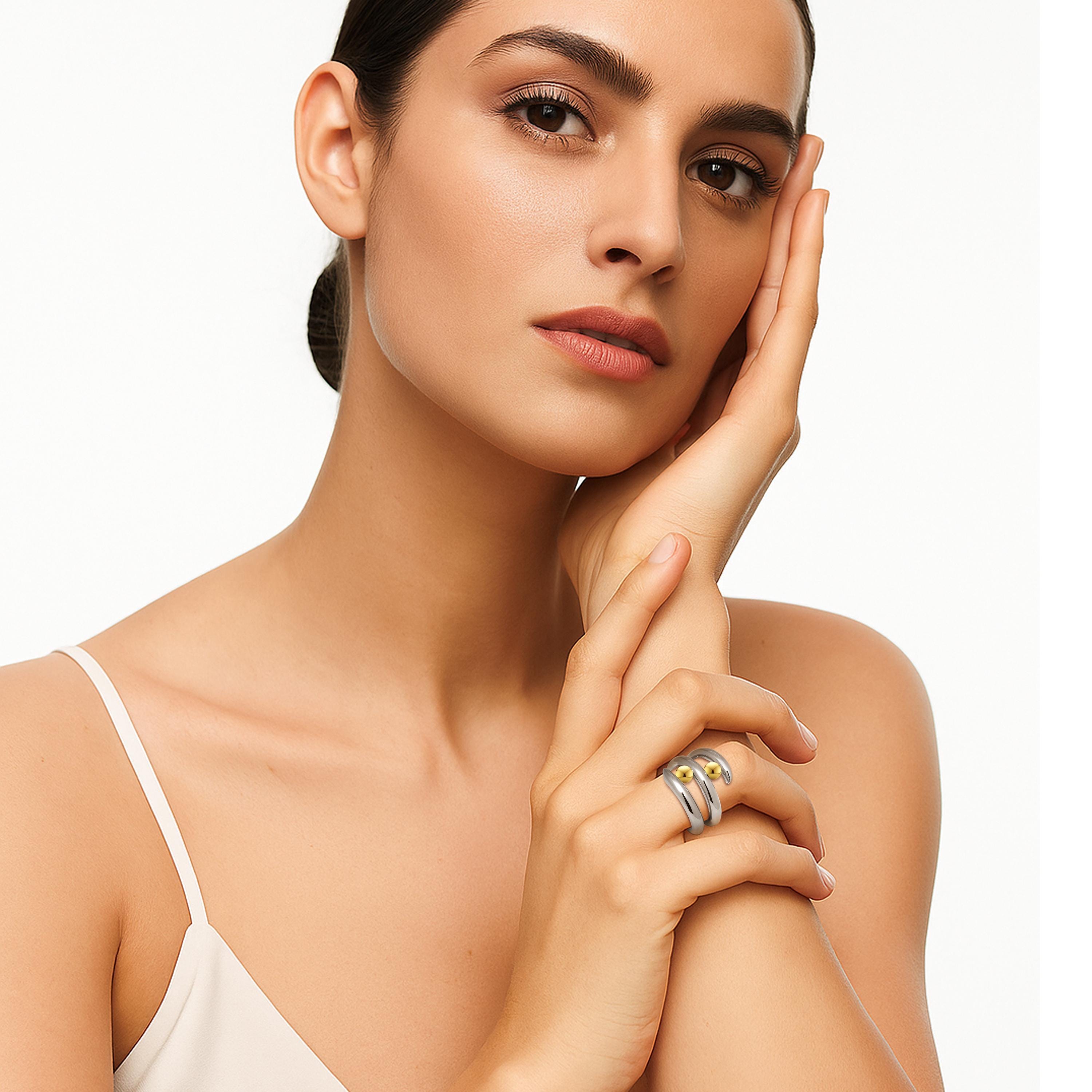 Experience the fluid elegance of the sea in Taormina Jewelry’s signature Onde collection with this stunning multi-row bypass ring. Expertly crafted in polished 316L stainless steel, its double-band bypass design recalls gentle ocean waves and securely holds two brilliant 5mm round Gold spheres in tension setting—creating an eye-catching floating effect and architectural silhouette.