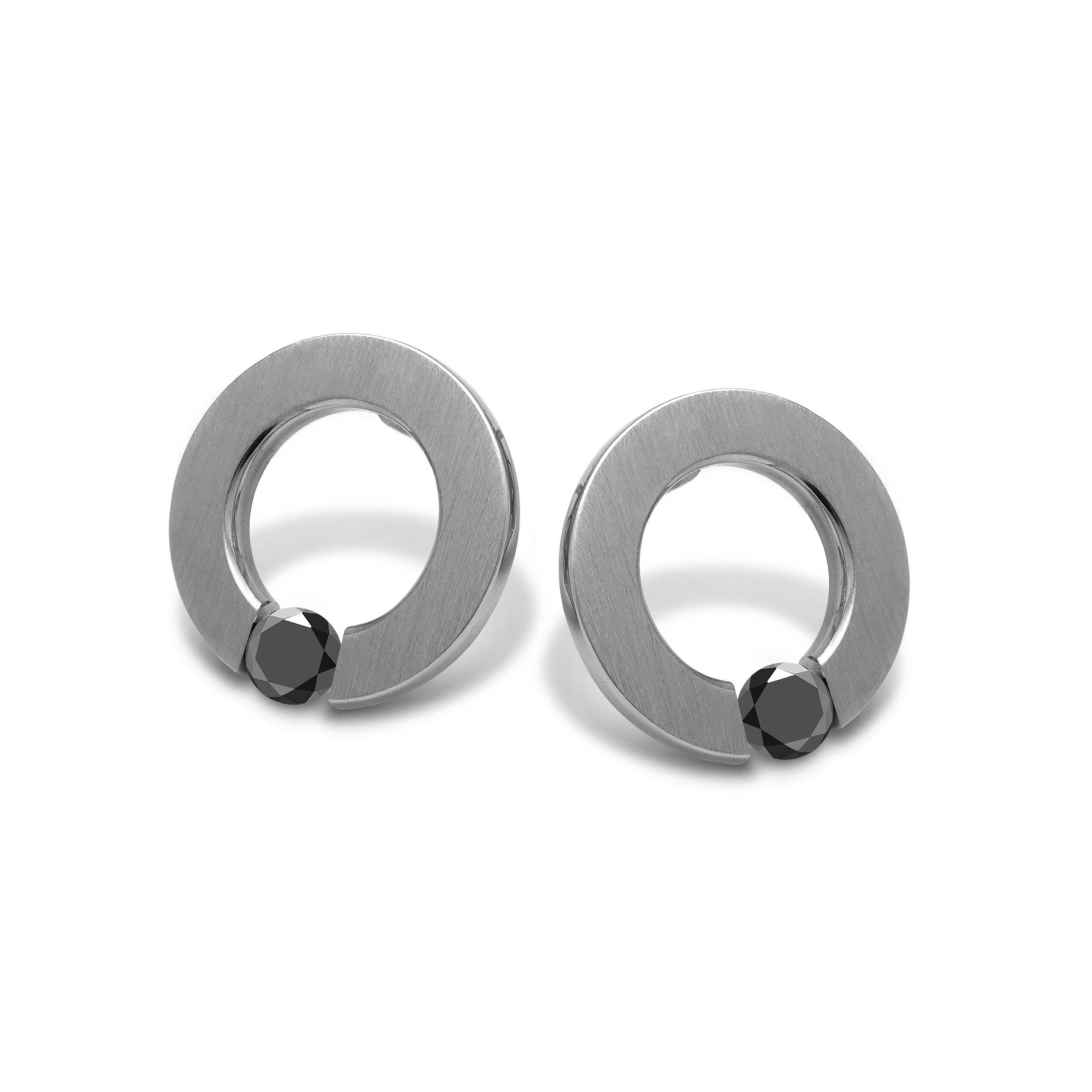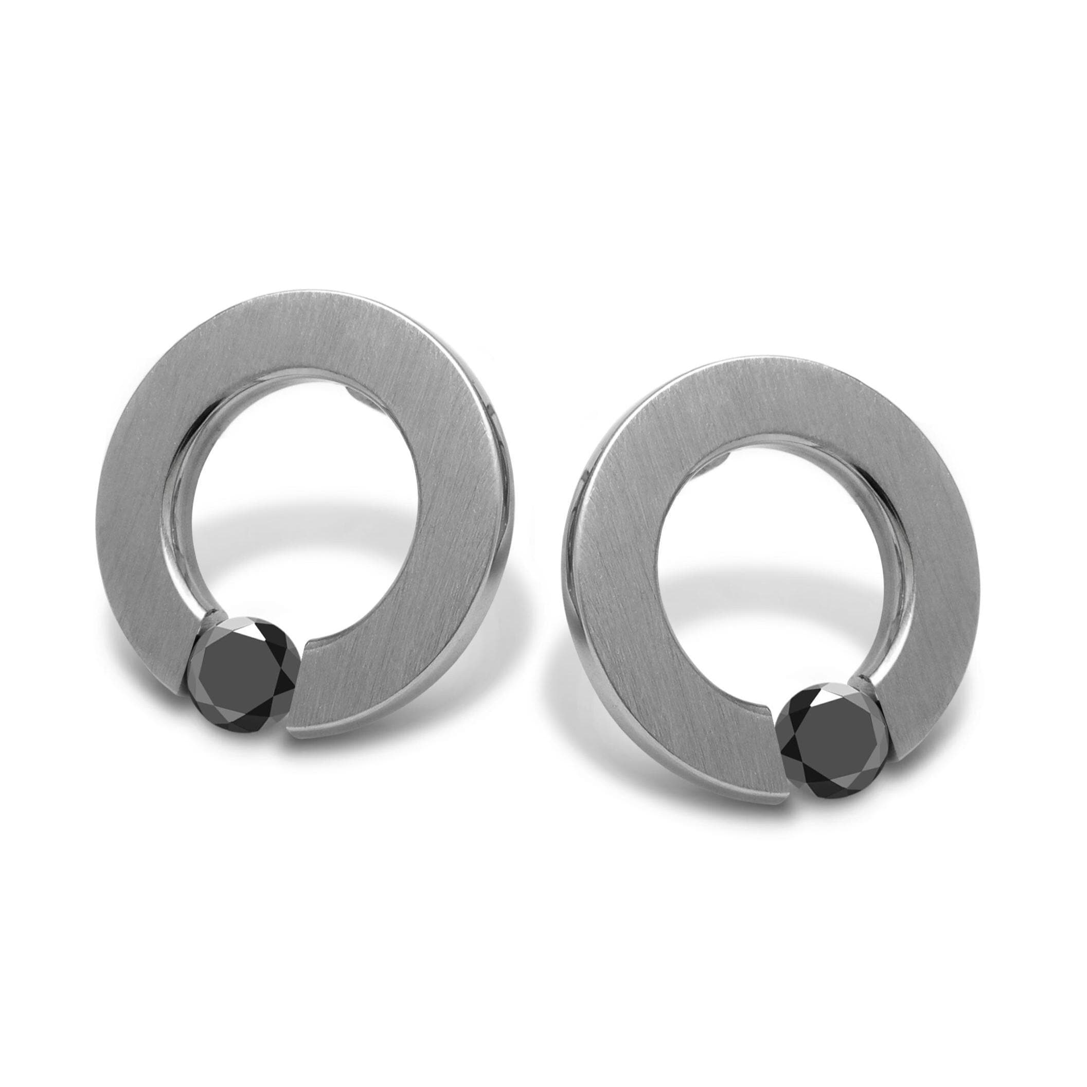 Discover the ABBRACCI flat round stud earrings by Taormina Jewelry, where Italian-inspired craftsmanship and minimalist elegance unite in perfect harmony. These sophisticated drop feature a precision tension‑set round Black Diamond—nestled seamlessly between sleek stainless steel flat circle. The front brushed finish captures and reflects light with a striking, radiant effect, while the outer rim offers a polished contrast for added depth.