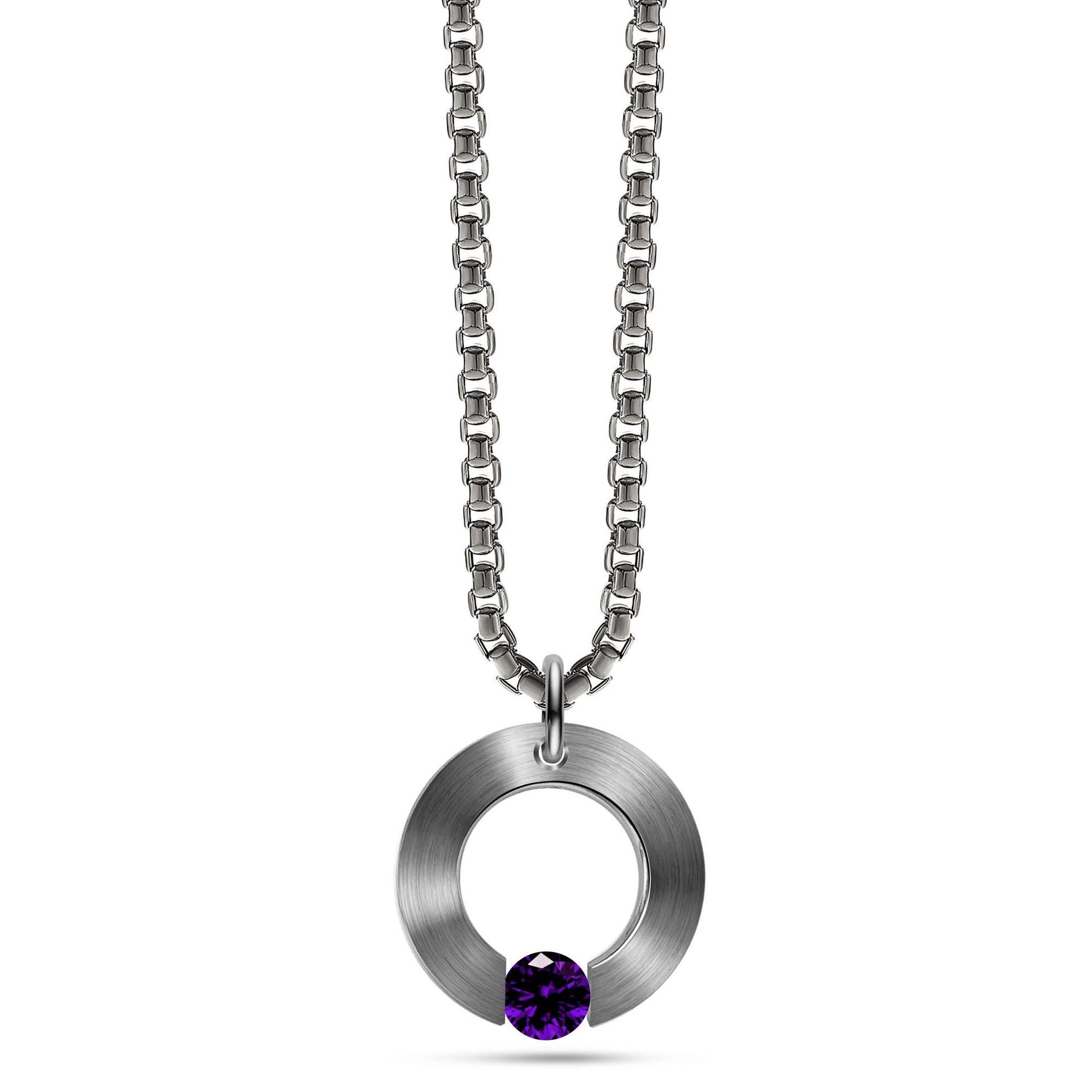 Round flat ring pendant with a tension set round Gemstone. The brilliant-cut Gemstone rests between the ring ends in center position hanging by a this box chain: surrounded by light, it shows off its full sparkling beauty.