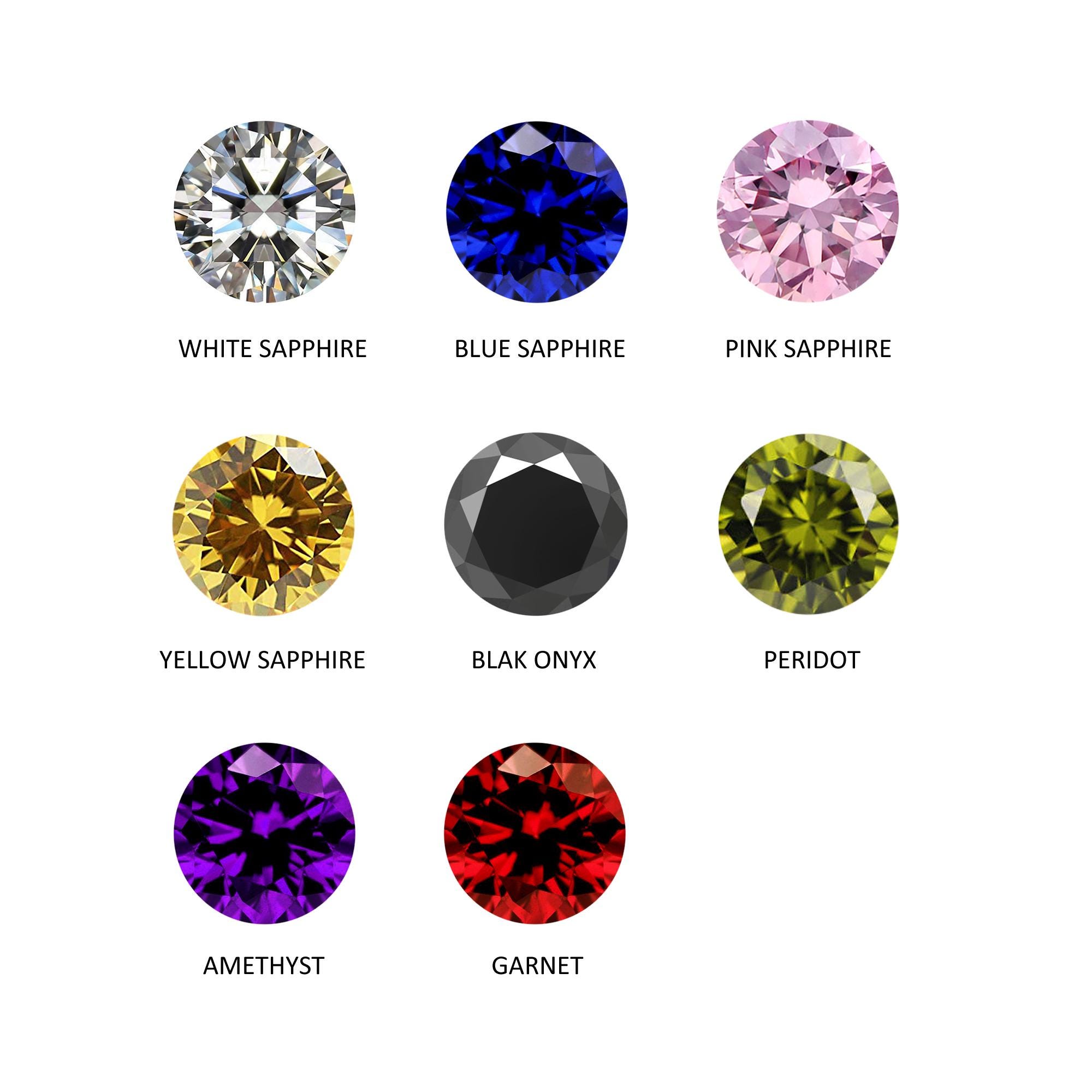 Gemstone color options: white sapphire, blue sapphire, yellow sapphire, pink sapphire, amethyst, garnet, peridot, black onyx.