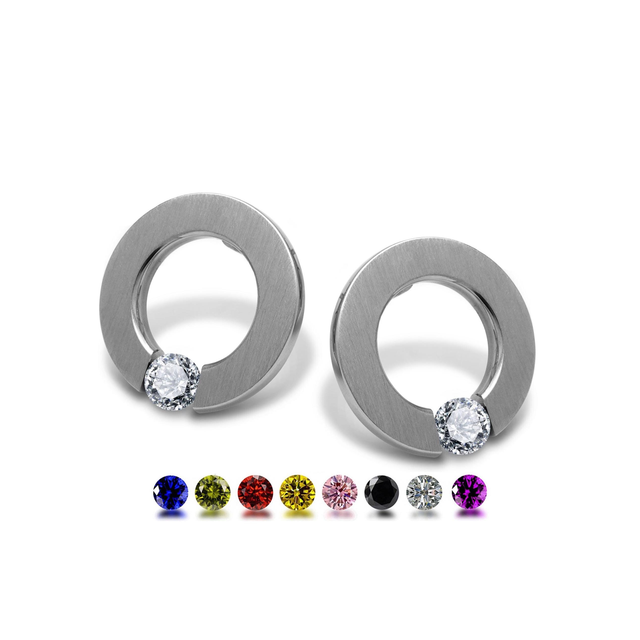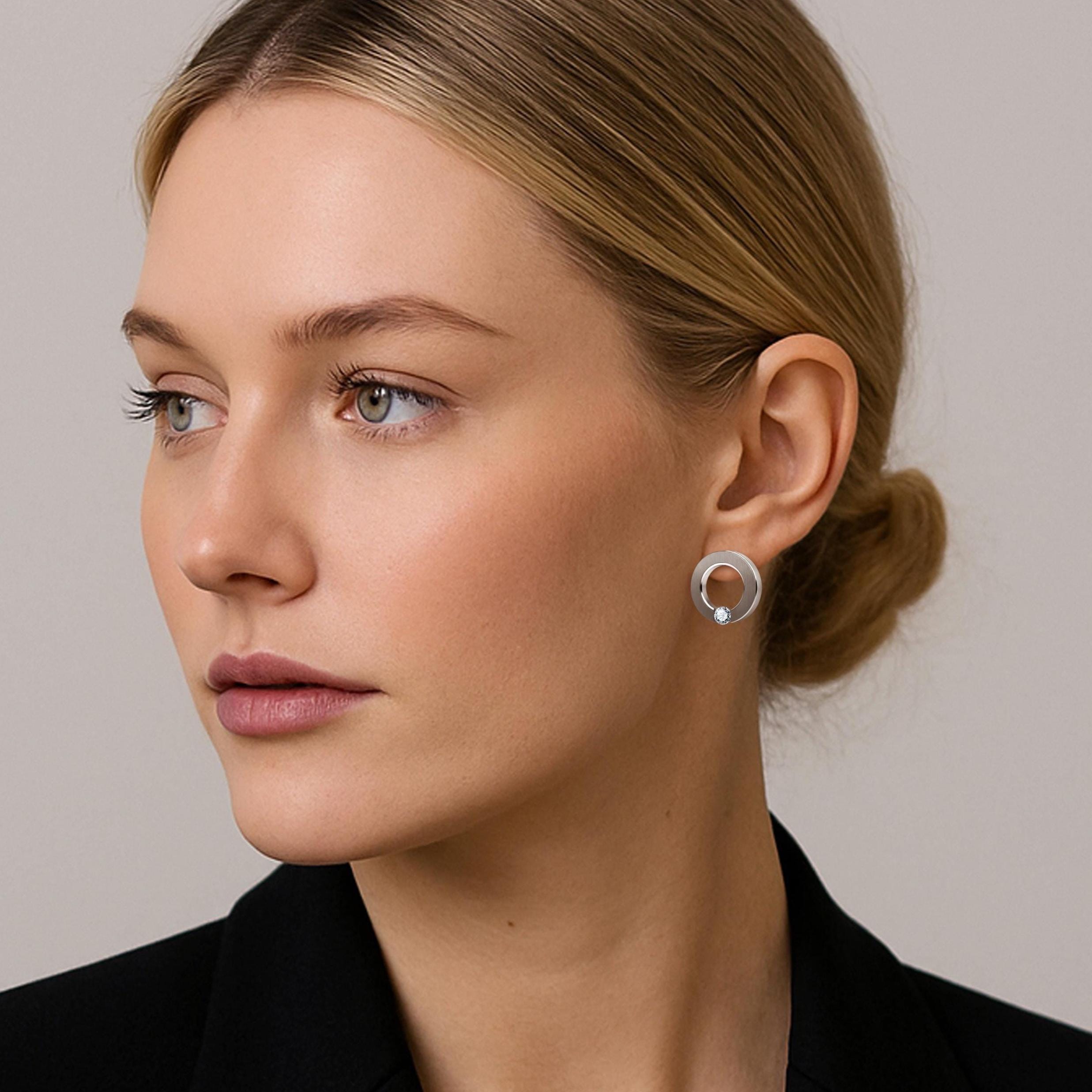 Discover the ABBRACCI flat round stud earrings by Taormina Jewelry, where Italian-inspired craftsmanship and minimalist elegance unite in perfect harmony. These sophisticated drop feature a precision tension‑set white sapphire—nestled seamlessly between sleek stainless steel flat circle. The front brushed finish captures and reflects light with a striking, radiant effect, while the outer rim offers a polished contrast for added depth.