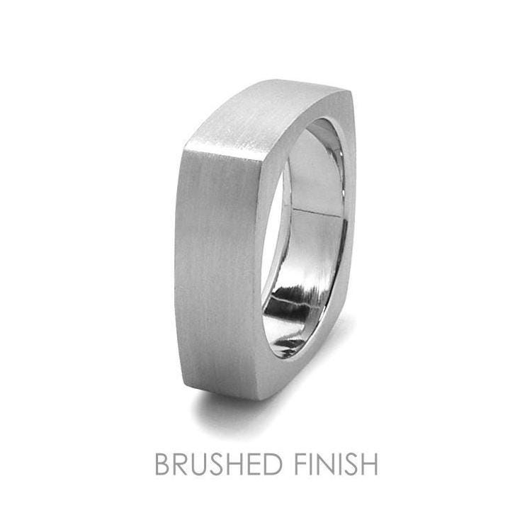 Crafted from premium 316 grade stainless steel, this minimalist square-edged flat band is offered in widths of 3 mm, 4 mm, 5 mm, and 6 mm. The design features a clean, geometric silhouette with smooth inner edges and a refined comfort-fit profile that enables the ring to slide onto the finger effortlessly and feel as light and fluid as water. Hypoallergenic and tarnish-resistant, it’s handcrafted to deliver remarkable durability and a lustrous platinum-like finish in either polished or brushed metal. This versatile, unisex piece is ideal as a sleek wedding band, stacking ring, or stylish everyday accessory.