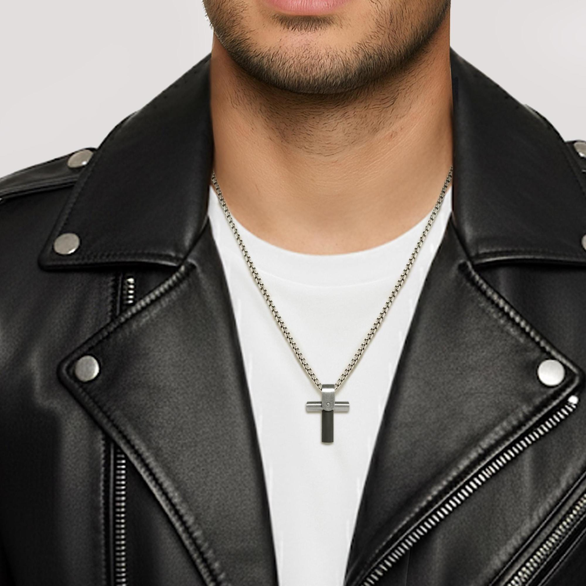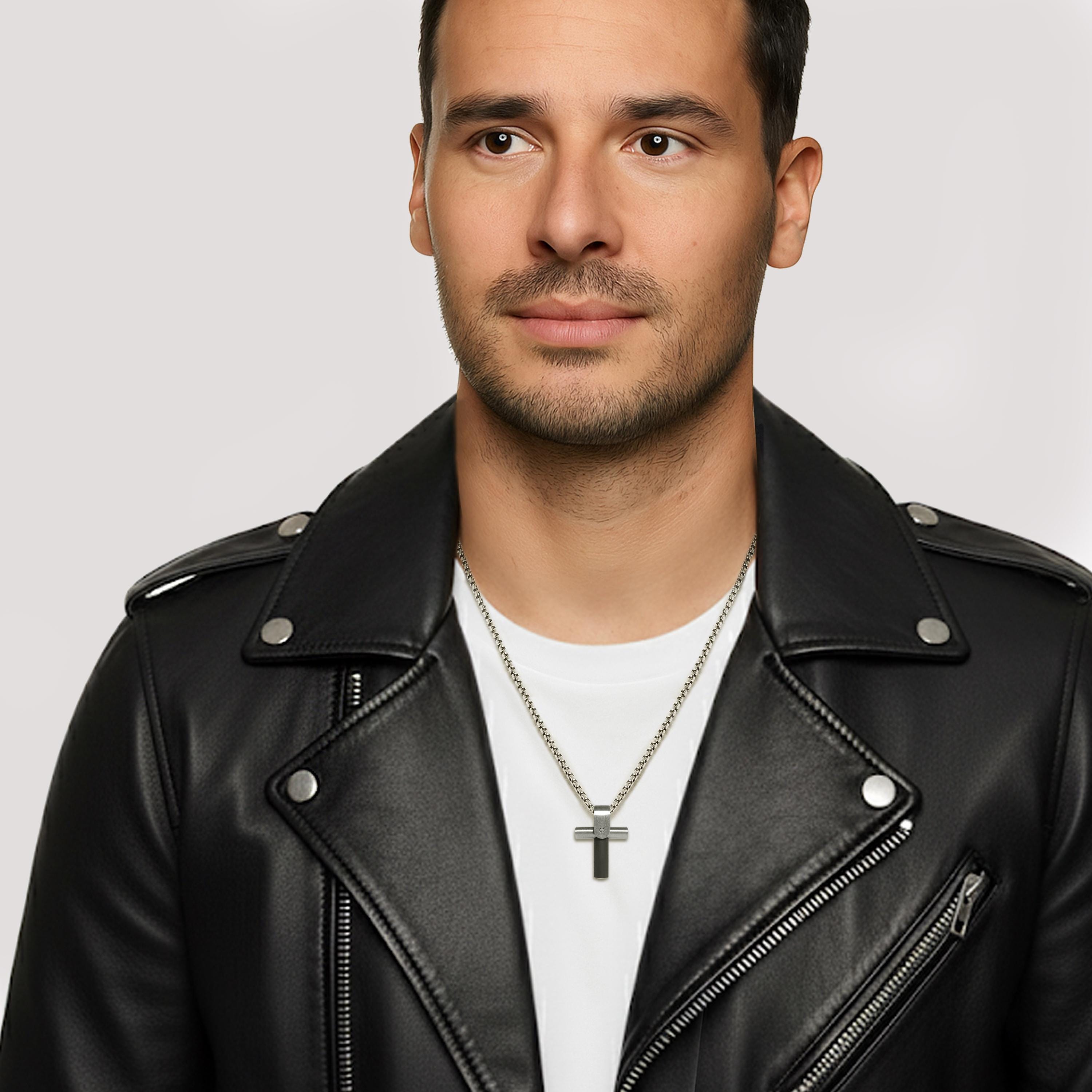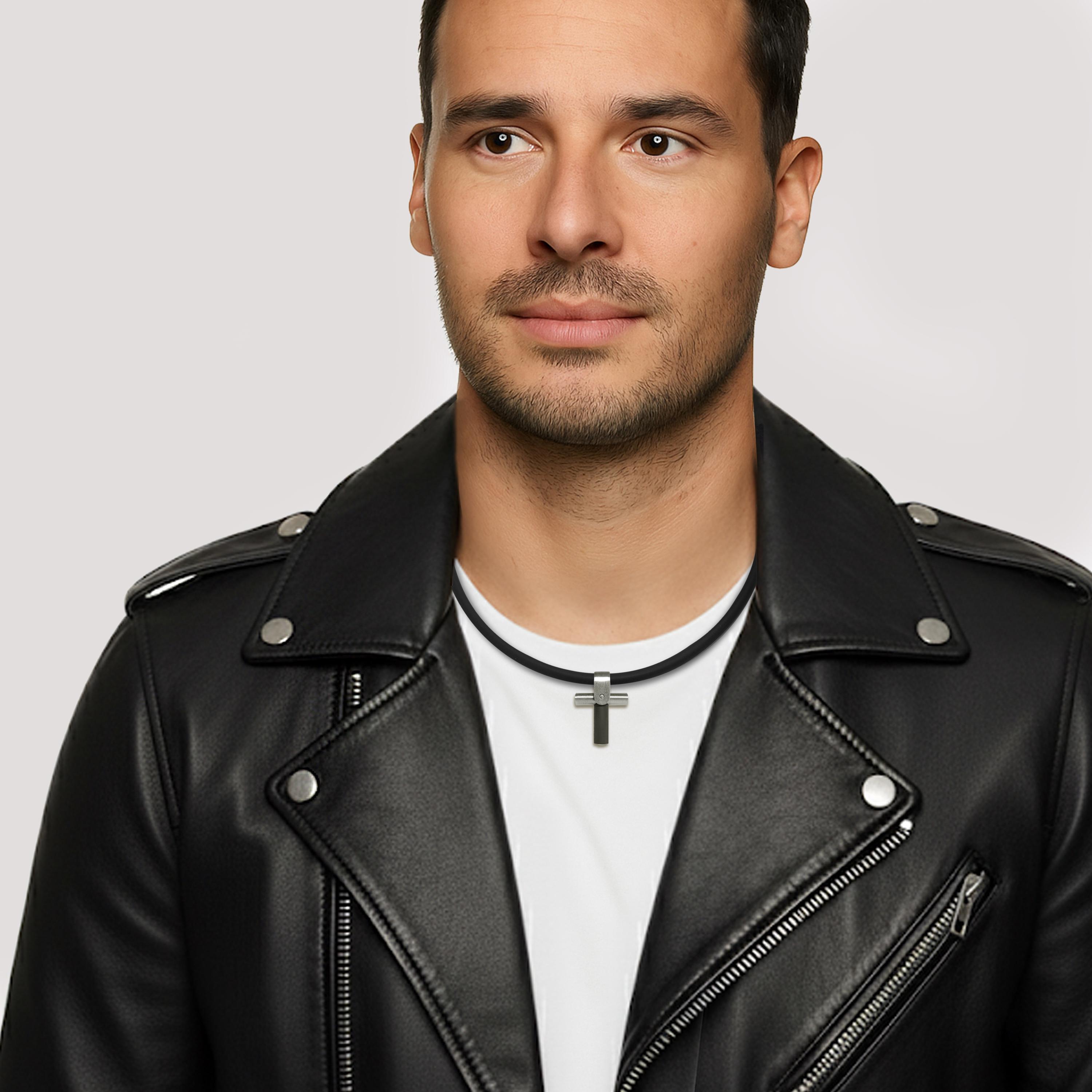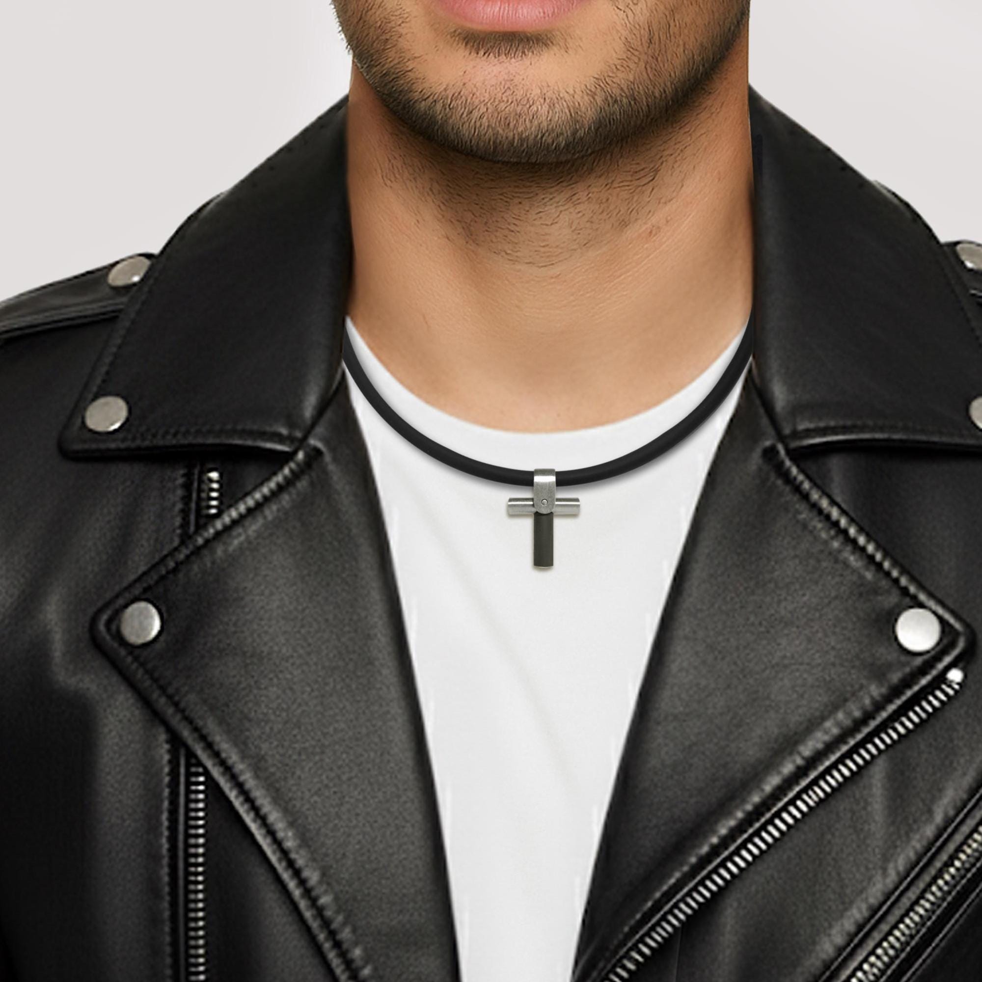 This striking pendant channels rugged elegance with its bold combination of brushed 316L stainless steel and sleek black PVC rubber. A tribute to the free-spirited biker ethos, the design seamlessly integrates the bail at the top of the cross, crafting a clean, modern silhouette that's both raw and refined. This piece balances structure and statement in perfect harmony.