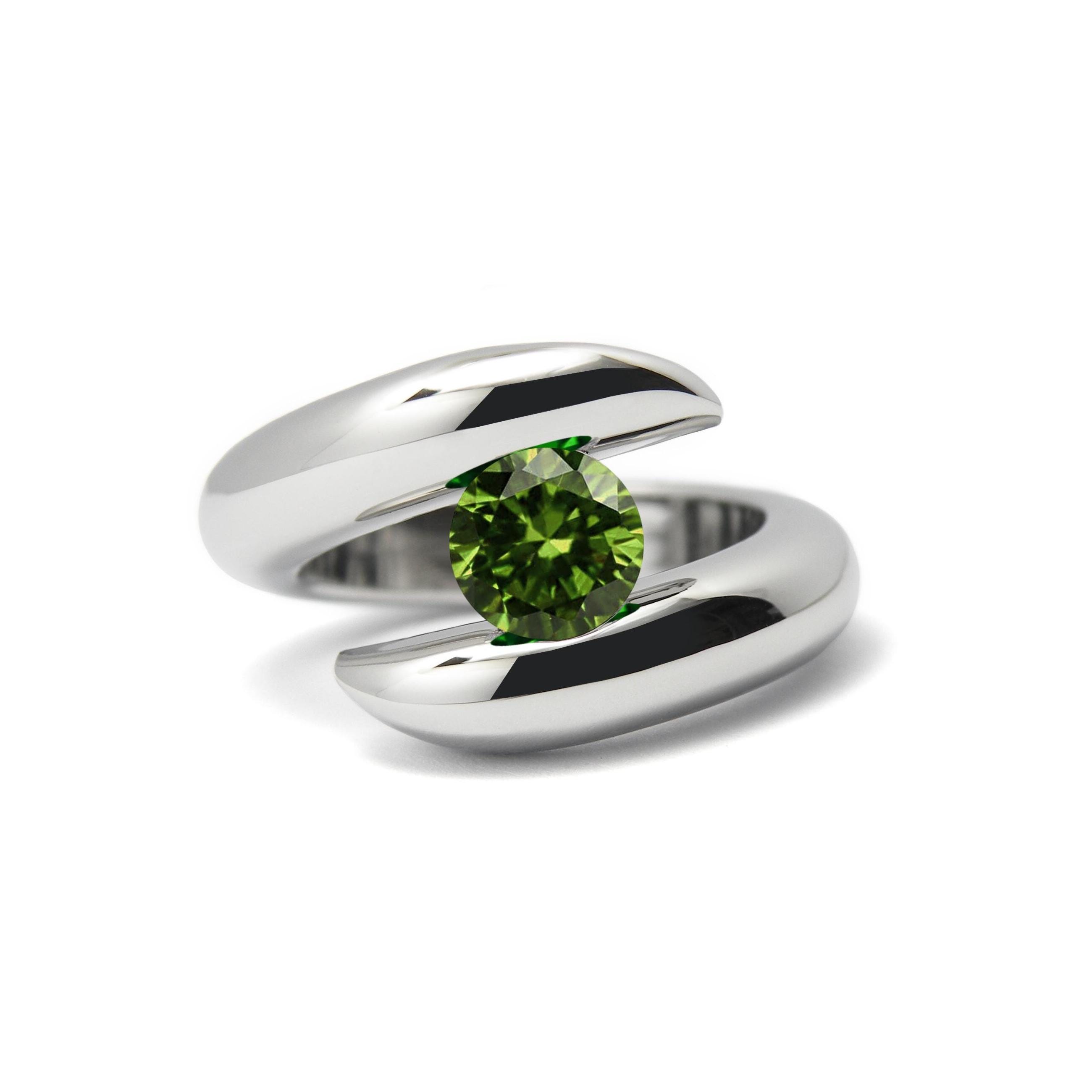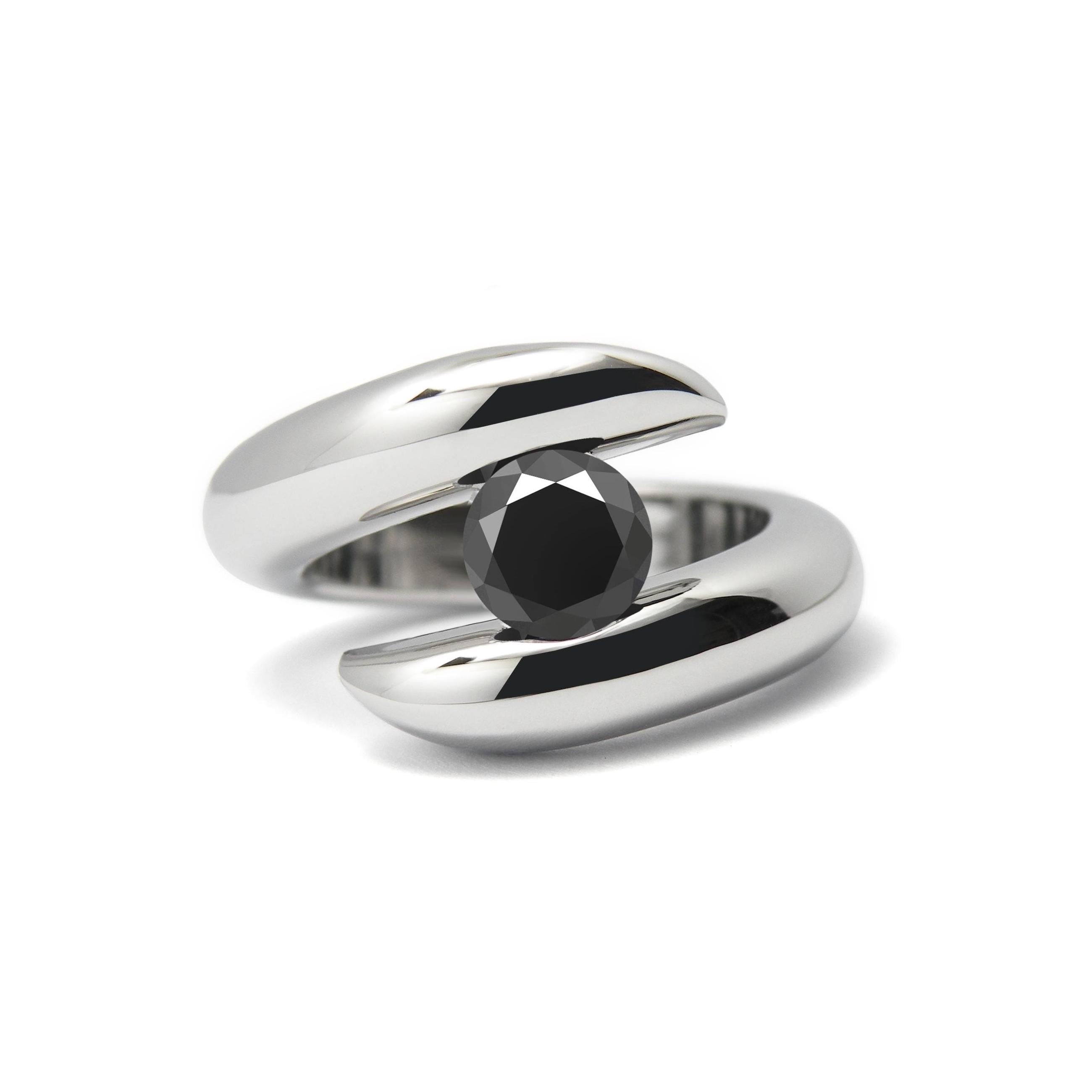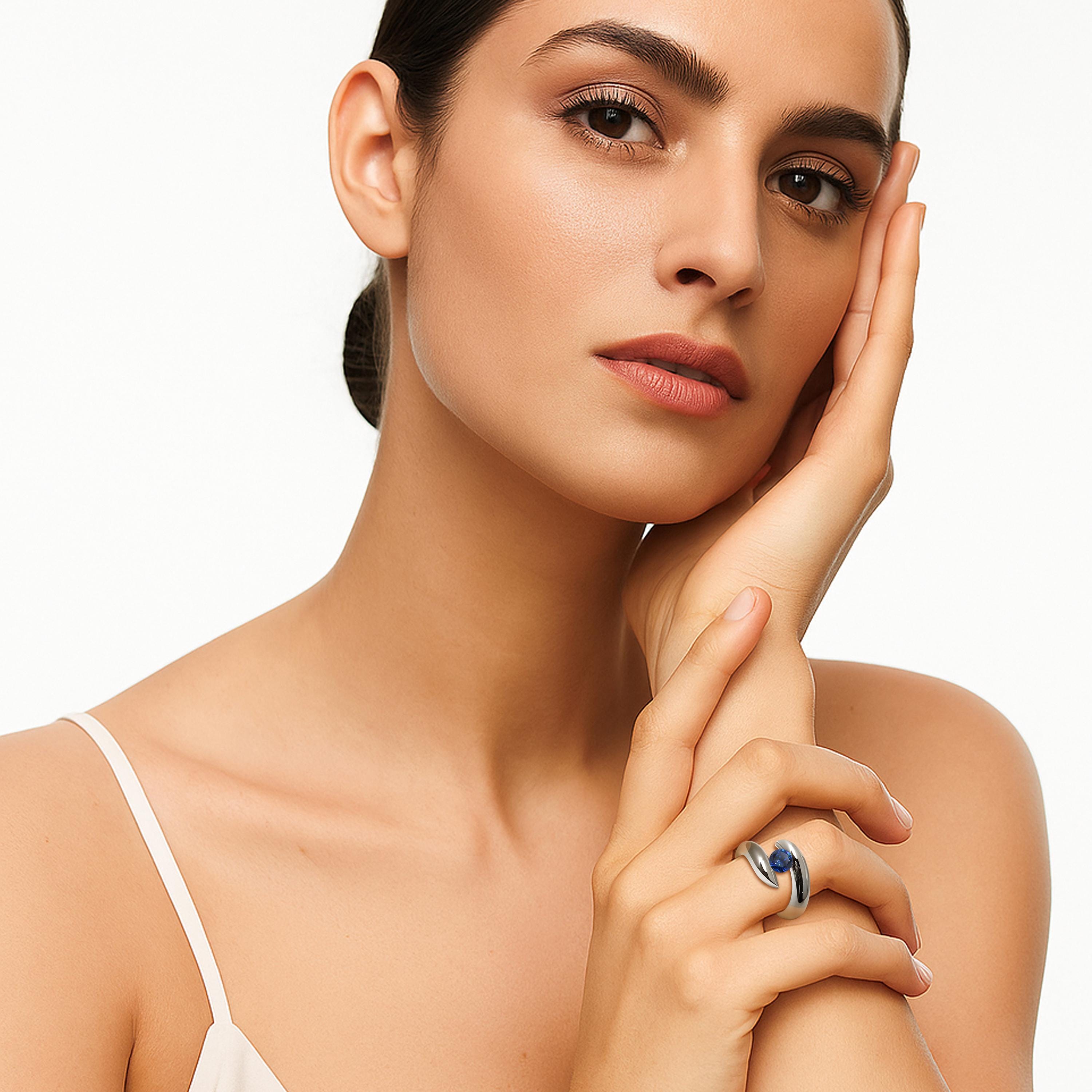 A sleek bypass design where two graceful bands flow around the finger, meeting in a tension of perfect balance. At the center, a luminous round colored gemstone radiates with refined brilliance. The sculptural silhouette feels fluid and contemporary, yet timeless in its elegance — a piece that embodies both style and luxury, standing out effortlessly in any setting.