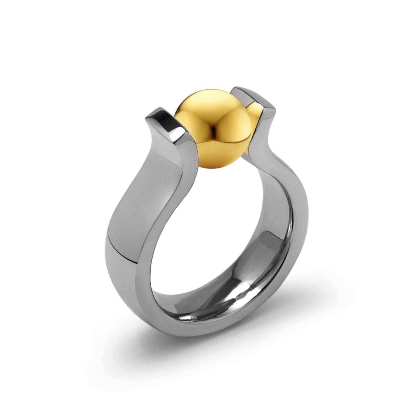 Inspired by the graceful form of the ancient lyre, this modern ring fuses classical beauty with cutting-edge design. Sculpted in high-polished stainless steel, its open arc silhouette cradles a gold sphere in a tension setting, creating a floating effect that feels both architectural and ethereal.