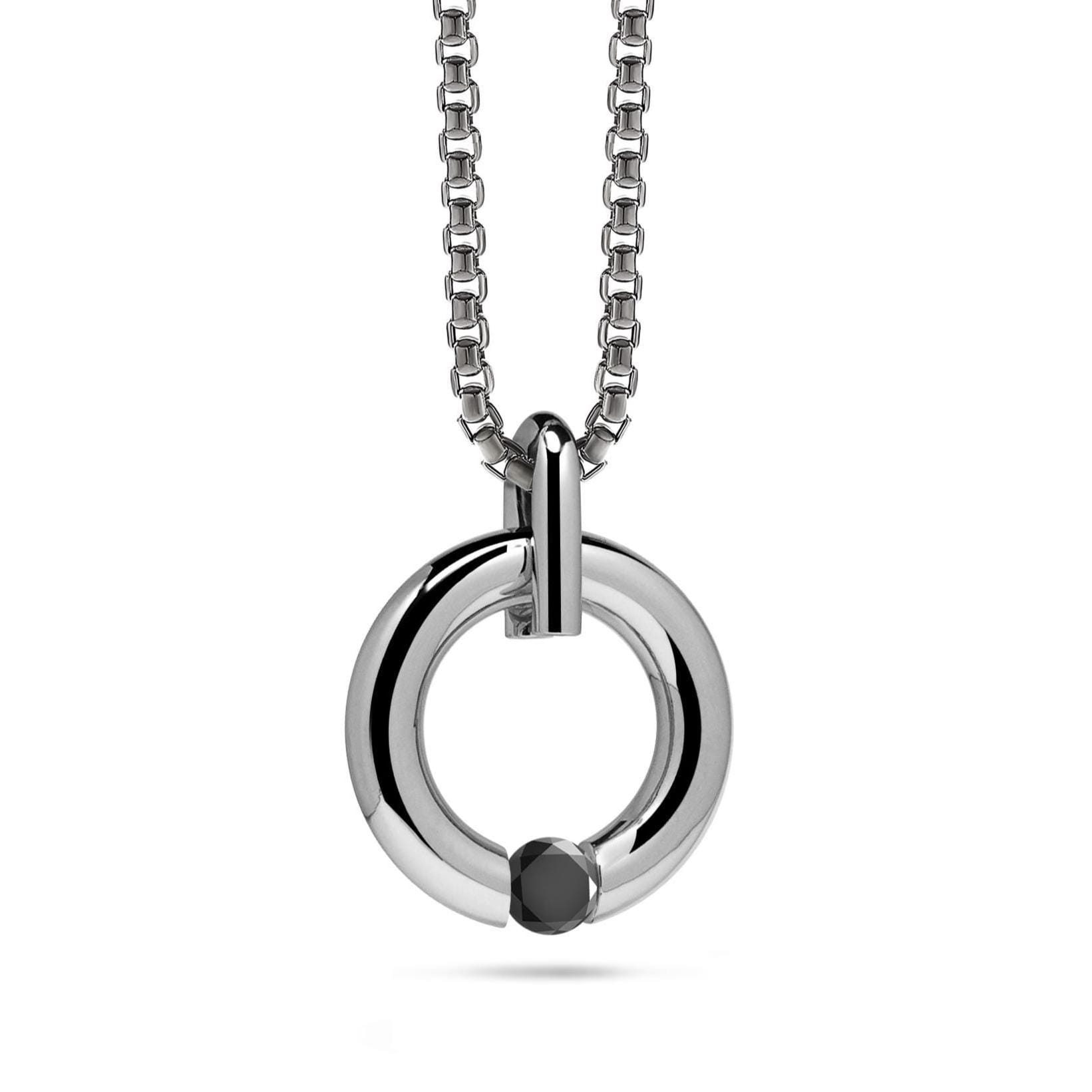 A precision-crafted statement in modern minimalism. This circular stainless steel pendant is engineered with tension-set connections — no soldering, no seams — where each element locks flawlessly in place through clean mechanical design. At its base, a brilliant Black Diamond appears to float effortlessly, held in perfect alignment by the pendant’s inner curve.
