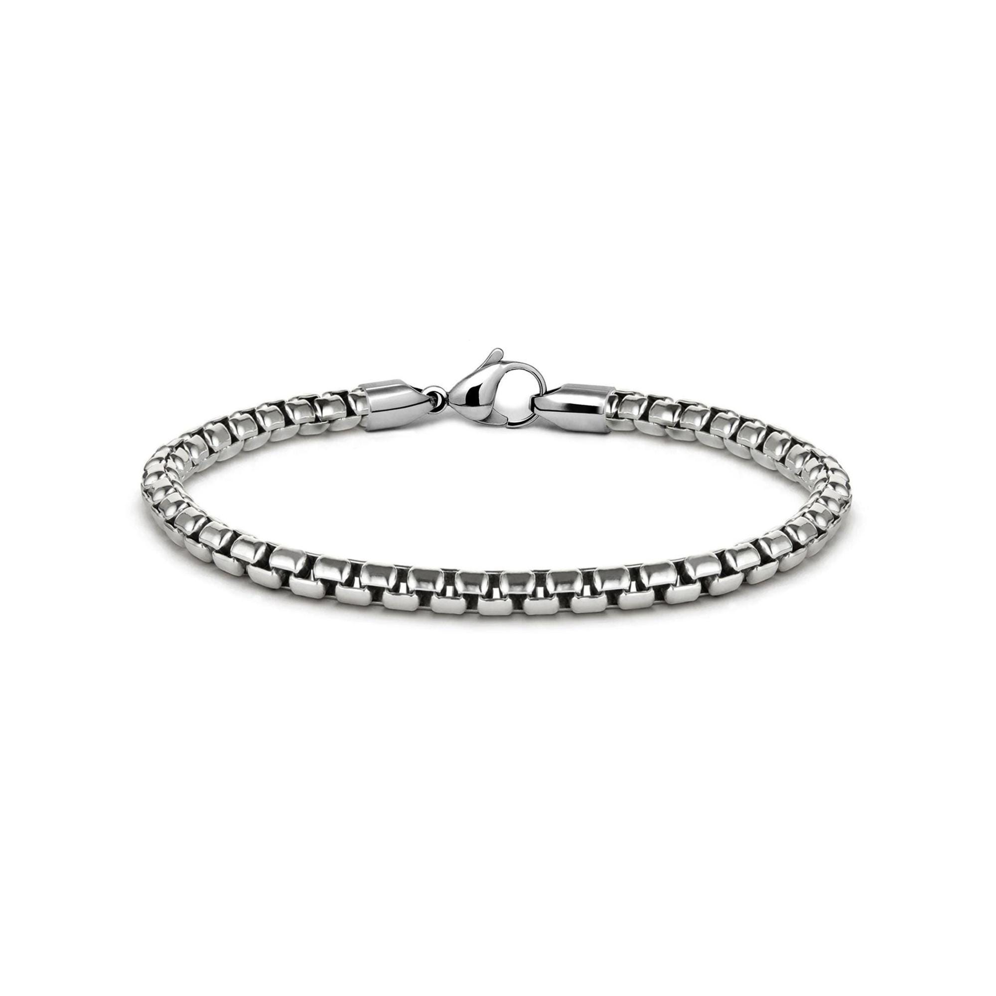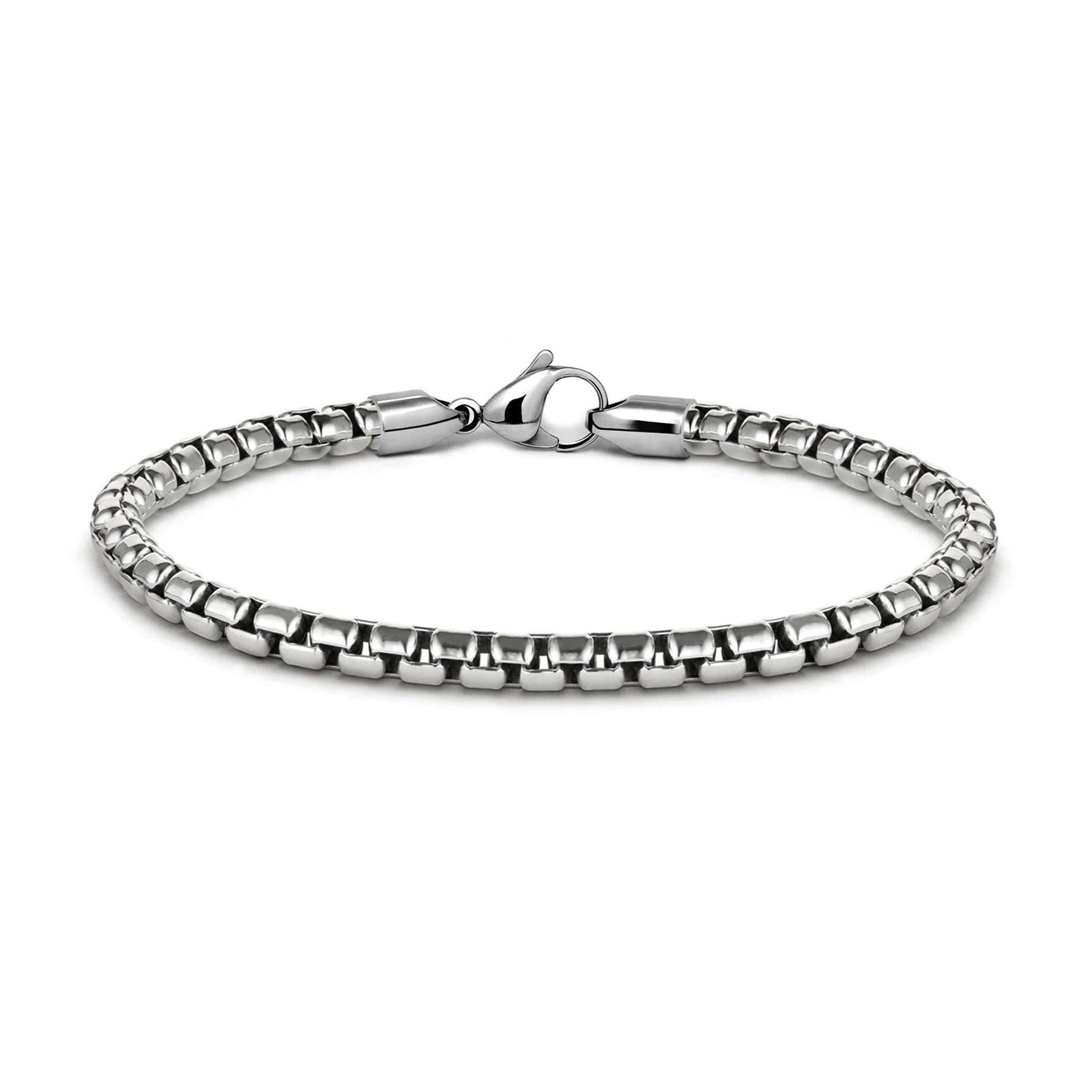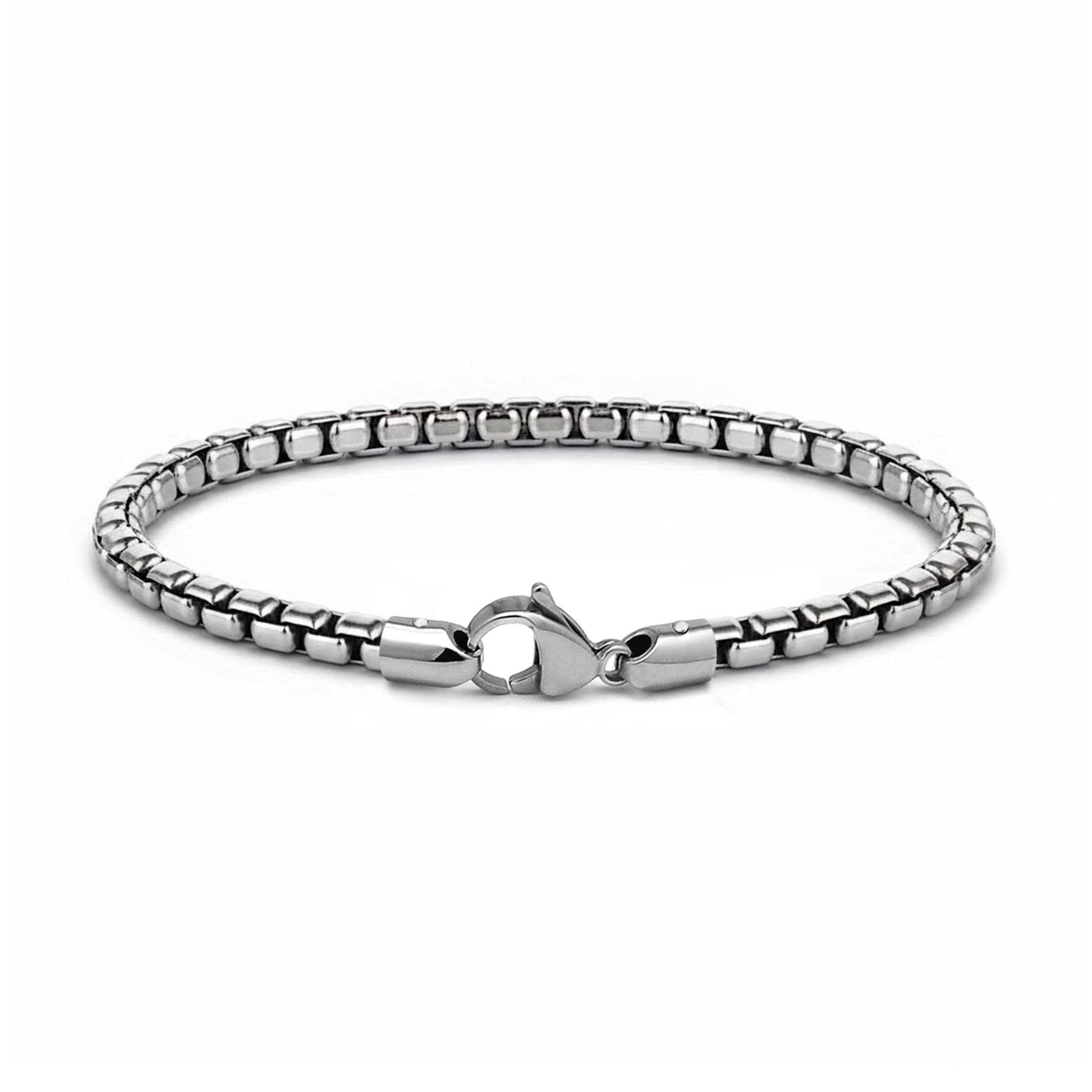 This thin unisex 4mm box chain bracelet is crafted from high-quality stainless steel with a polished finish, offering a refined industrial look. It features our signature capped clasp, with side caps that are riveted directly into the chain, ensuring both durability and a seamless, secure fit. Designed for those who appreciate clean lines and understated strength, this bracelet pairs effortlessly with both casual and formal attire.