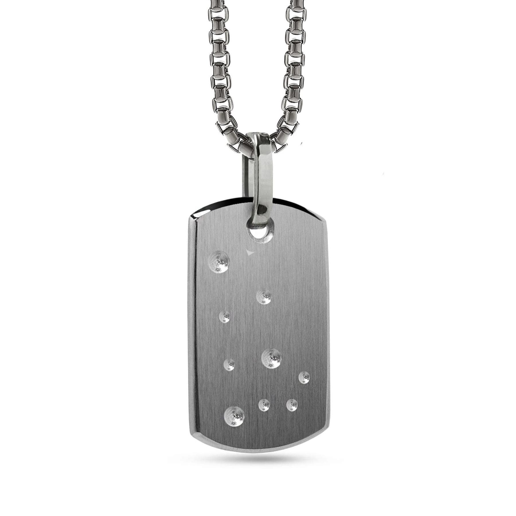 The Celestial Constellation Tag is a sculptural pendant featuring a layer of brushed and polished stainless steel engraved with the constellation corresponding to your zodiac sign, creating a subtle yet meaningful celestial map. Each engraving is meticulously aligned to reflect the actual star pattern, offering a personalized touch that resonates with your astrological identity.