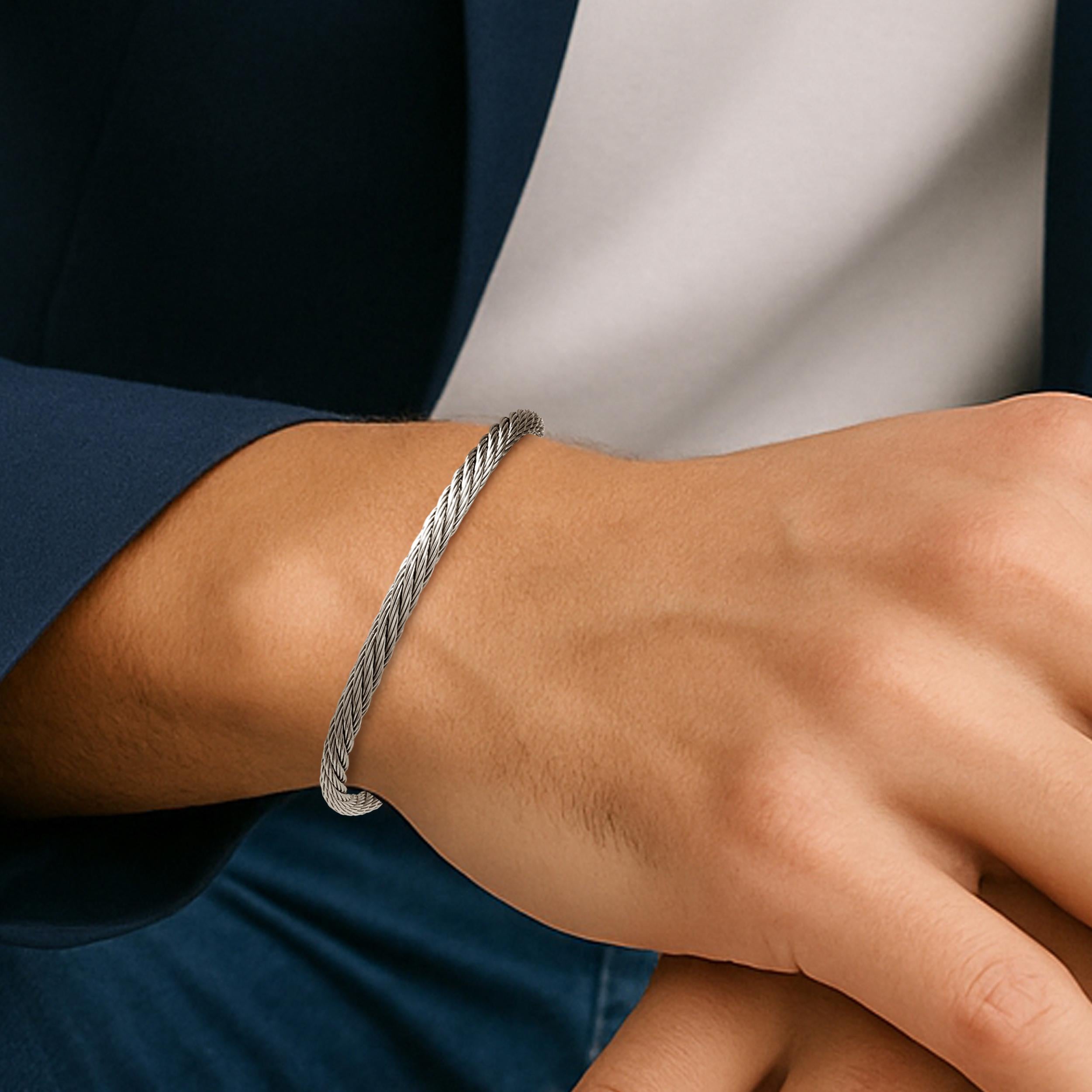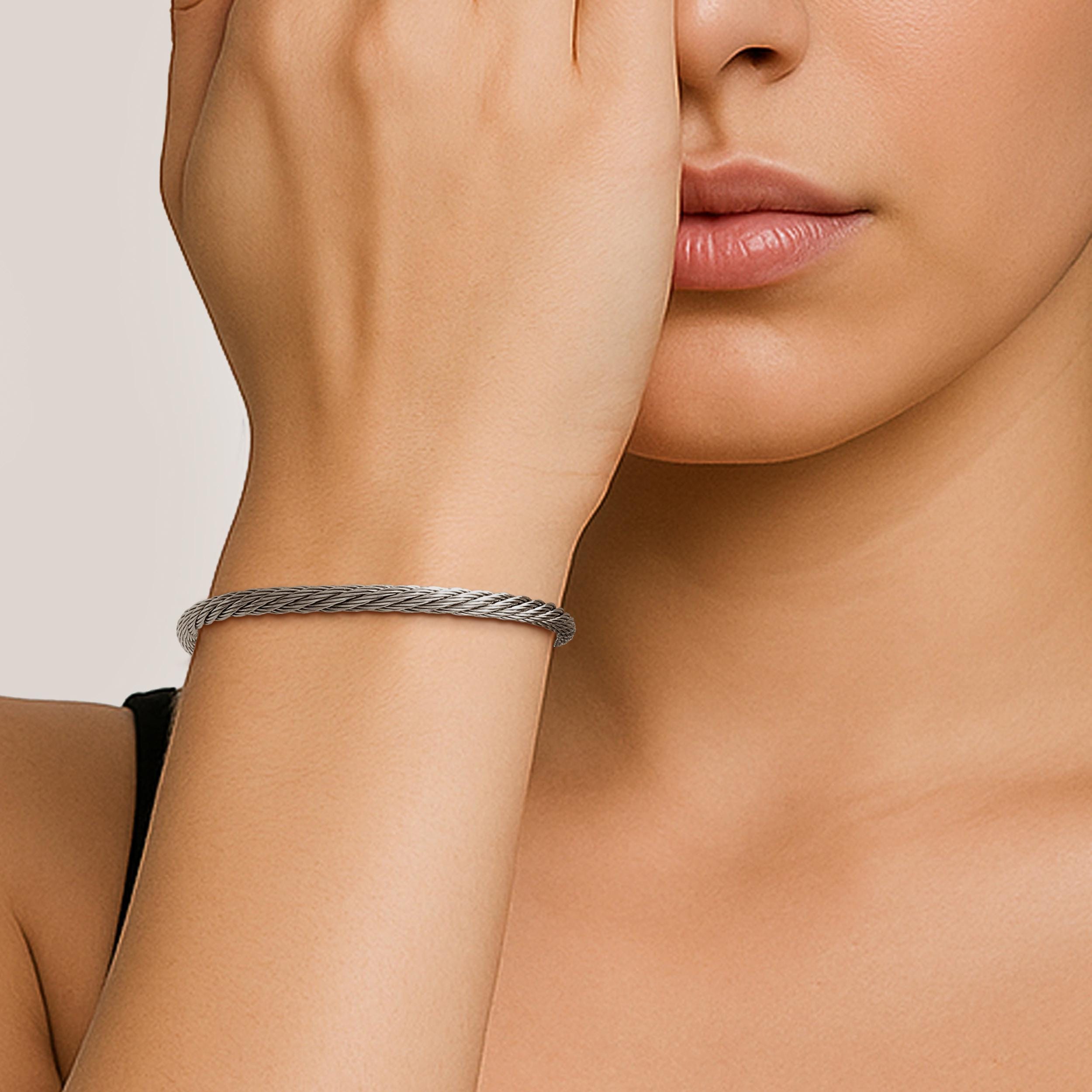 The side caps are securely riveted into the cable, ensuring a robust and reliable connection. This bracelet is perfect worn solo or layered with other pieces for a personalized look. Lightweight and versatile, it transitions seamlessly from office to evening.