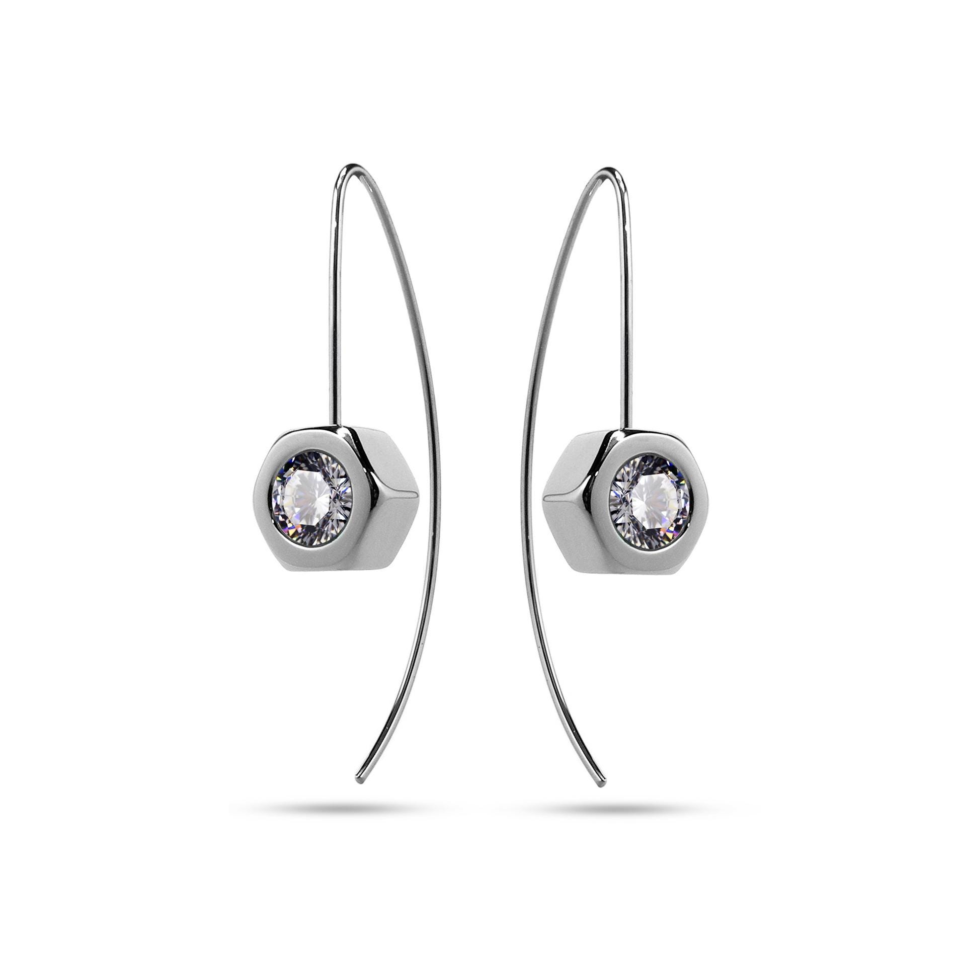 Bold meets elegant in Taormina’s DADO drop earrings, where industrial-chic design fuses with refined gemstone brilliance. Each earring features a polished stainless steel hexagonal “nut” that delicately frames a sparkling 6mm gemstone, suspended from a minimalist ear wire. The gemstone’s placement within the hexagon ensures captivating light refraction and an architectural statement. The gem appears to float inside the hexagon, catching light from every angle—creating a visually striking focal point with subtle motion. Lightweight and sophisticated, the DADO earrings offer modern elegance with an edge.