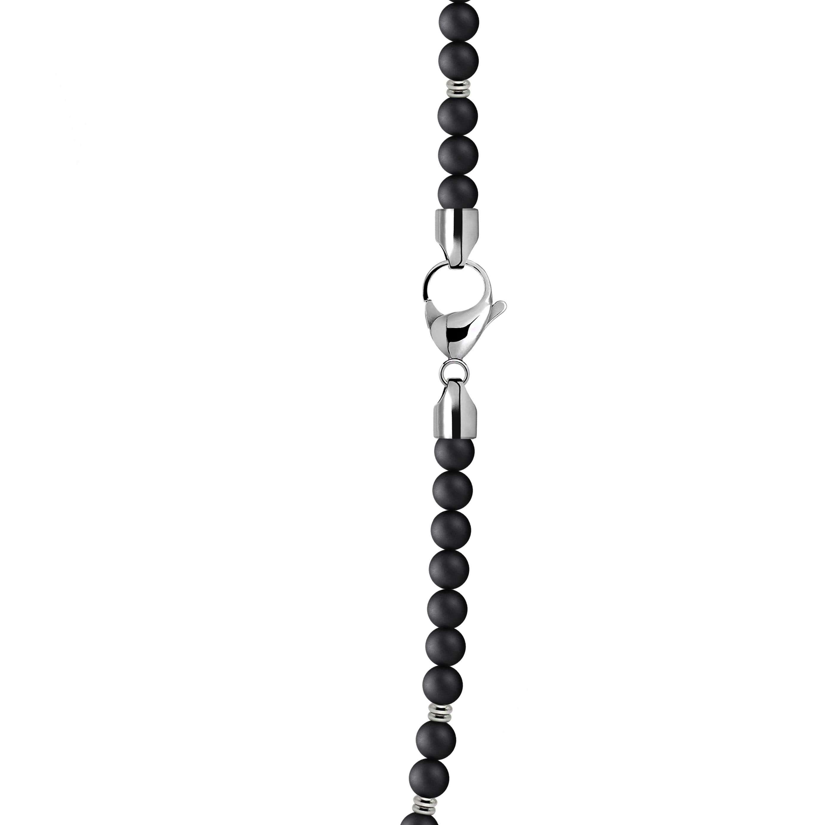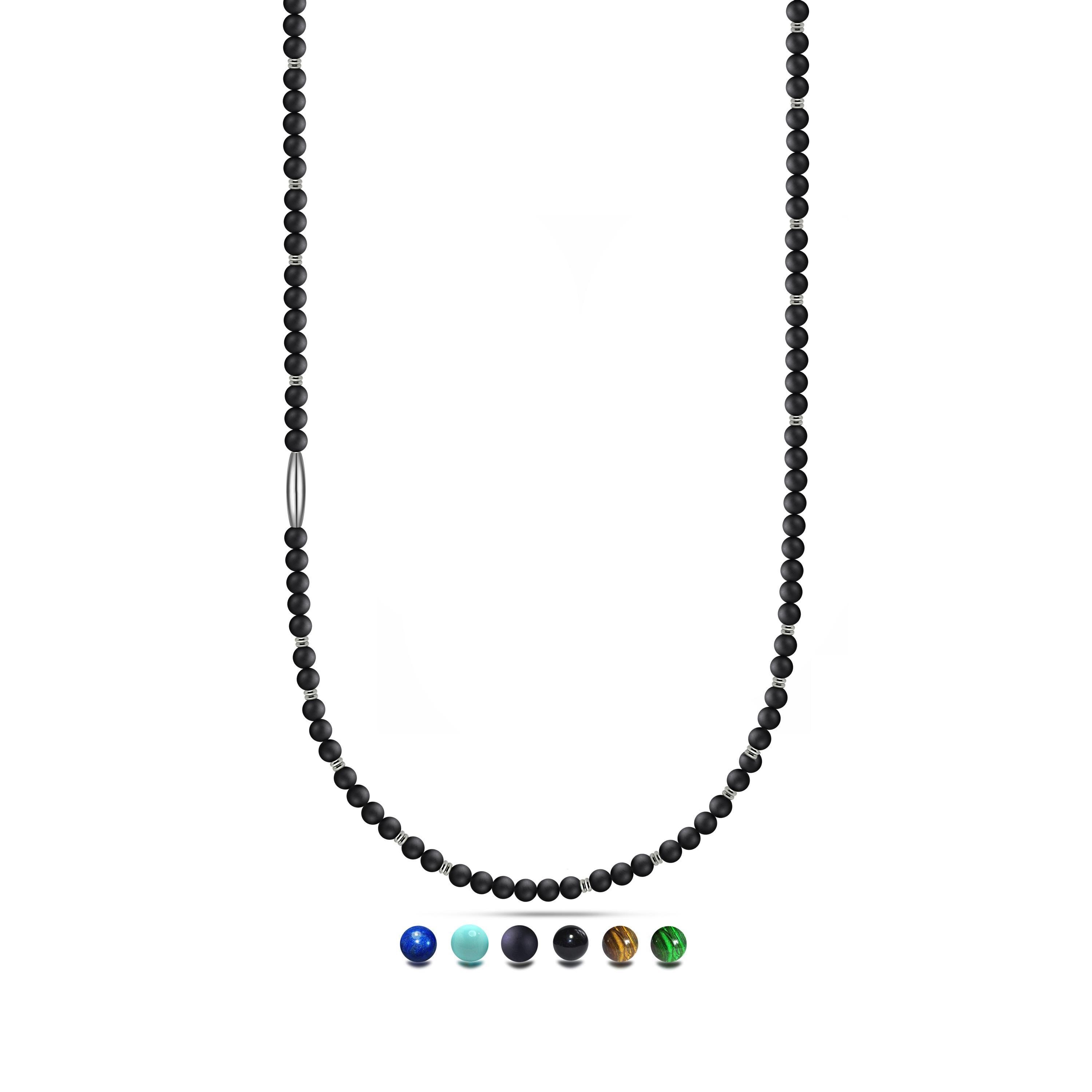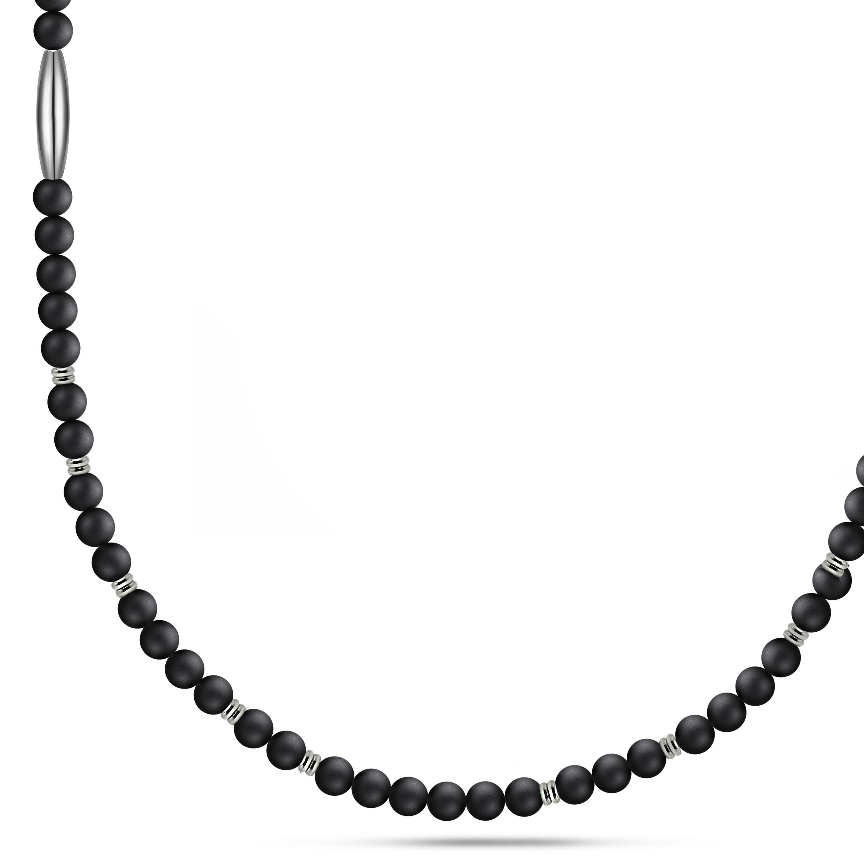 A sophisticated 4mm beaded necklace featuring sleek alternating elements in stainless steel. This necklace is strung on a durable steel cable, providing strength and longevity to the design. The piece is finished with a secure stainless steel clasp.