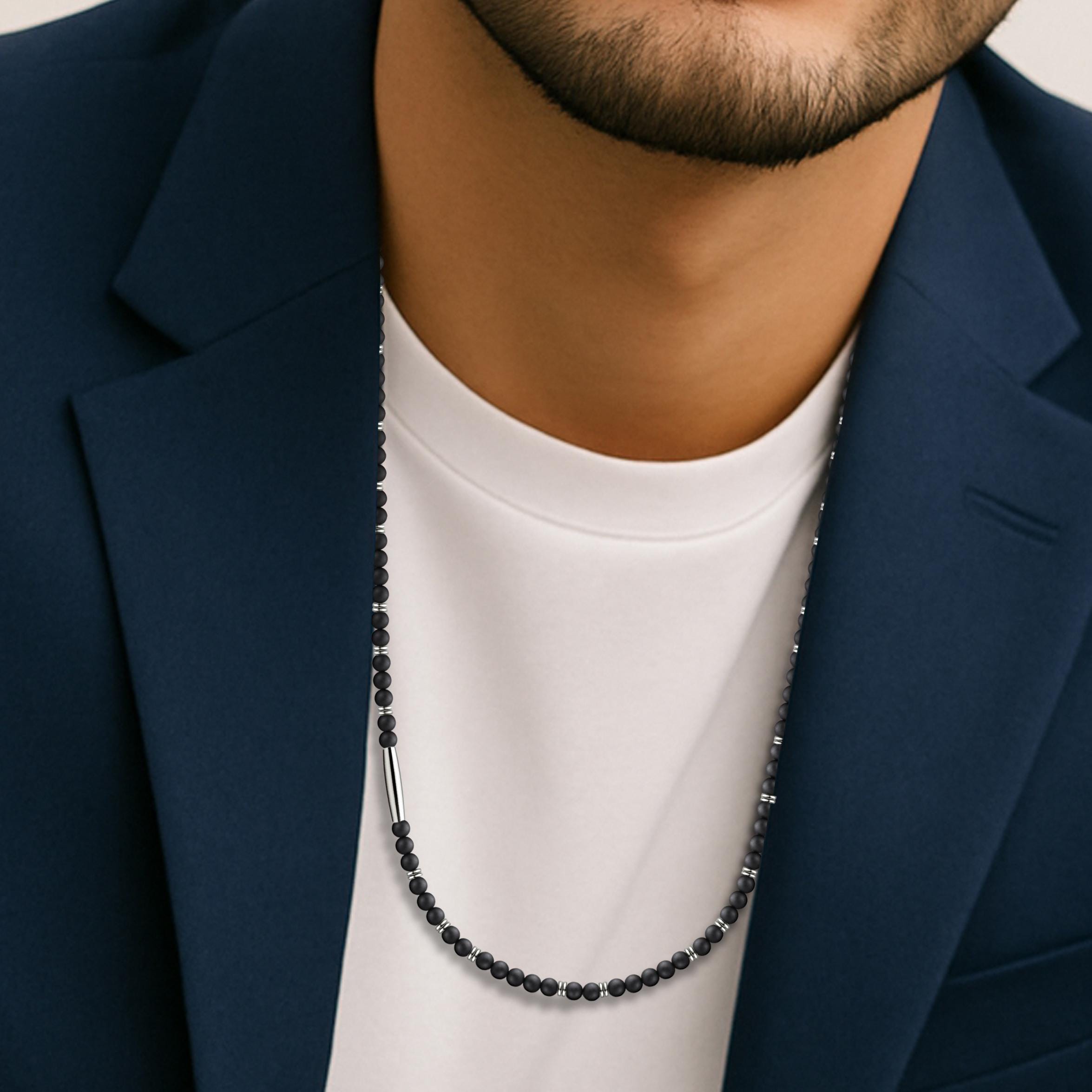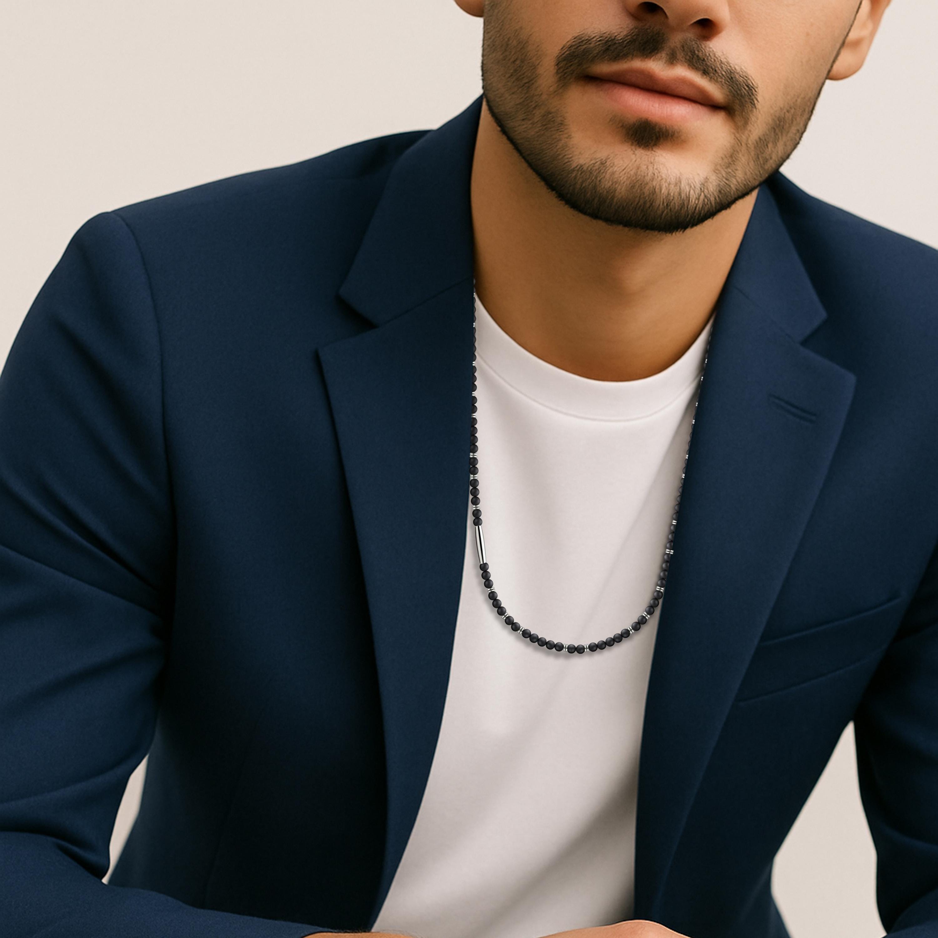 Thin black onyx beads Necklace, with elements subdivided and distributed irregularly. This design has been inspired by the prayer beads found in many cultures, these meaningful designs feature a variety of smooth, vividly colored stones, representing the union of symbolism and style.