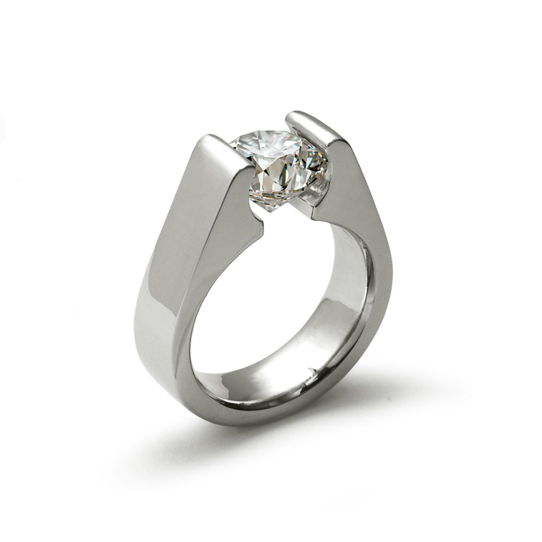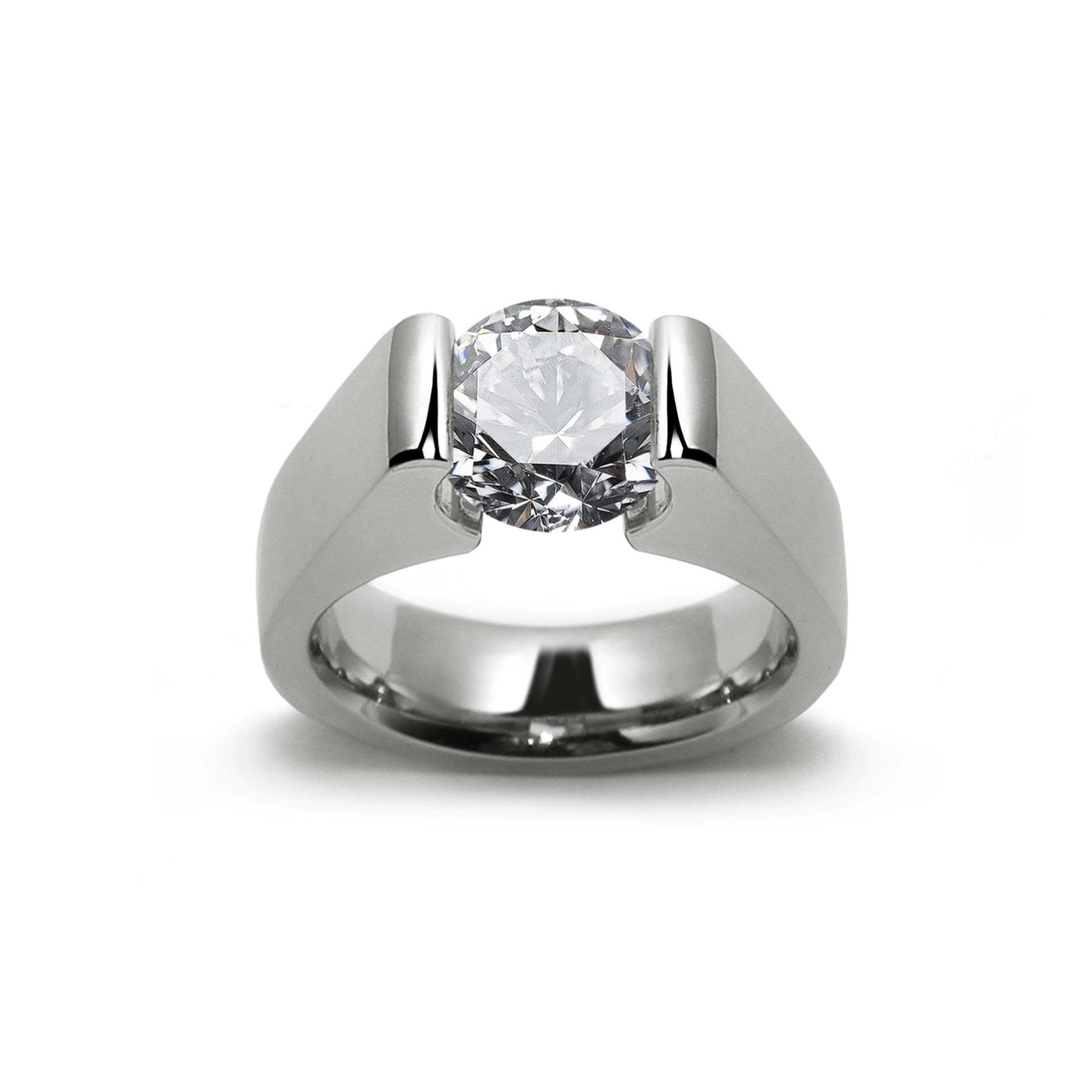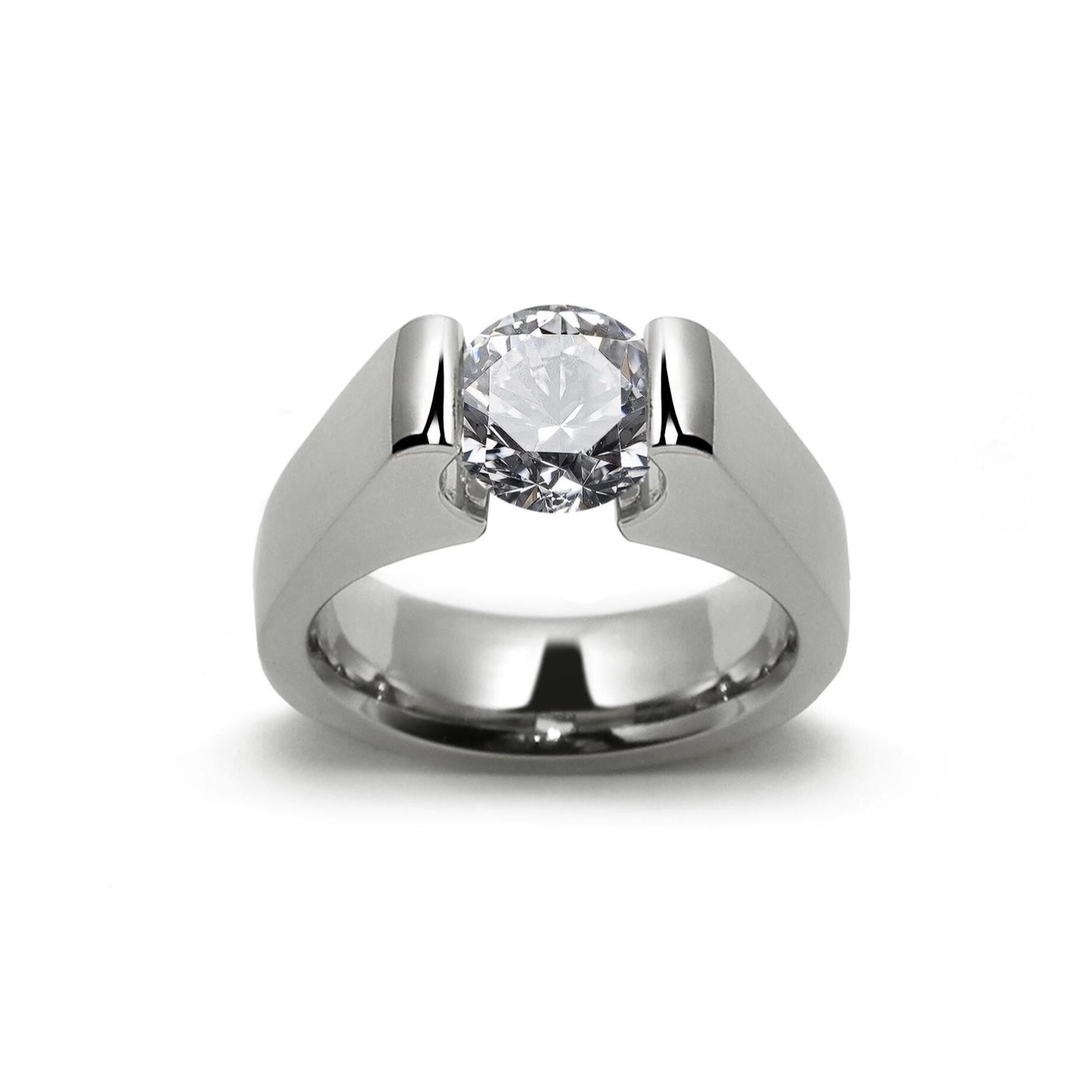 Bold, architectural, and strikingly modern — this Tension Set Ring from Taormina Jewelry is a true statement of minimalist design and technical mastery. Crafted in premium stainless steel, the setting holds a brilliant white sapphire in perfect suspension, appearing to float effortlessly between the open arms of the ring.