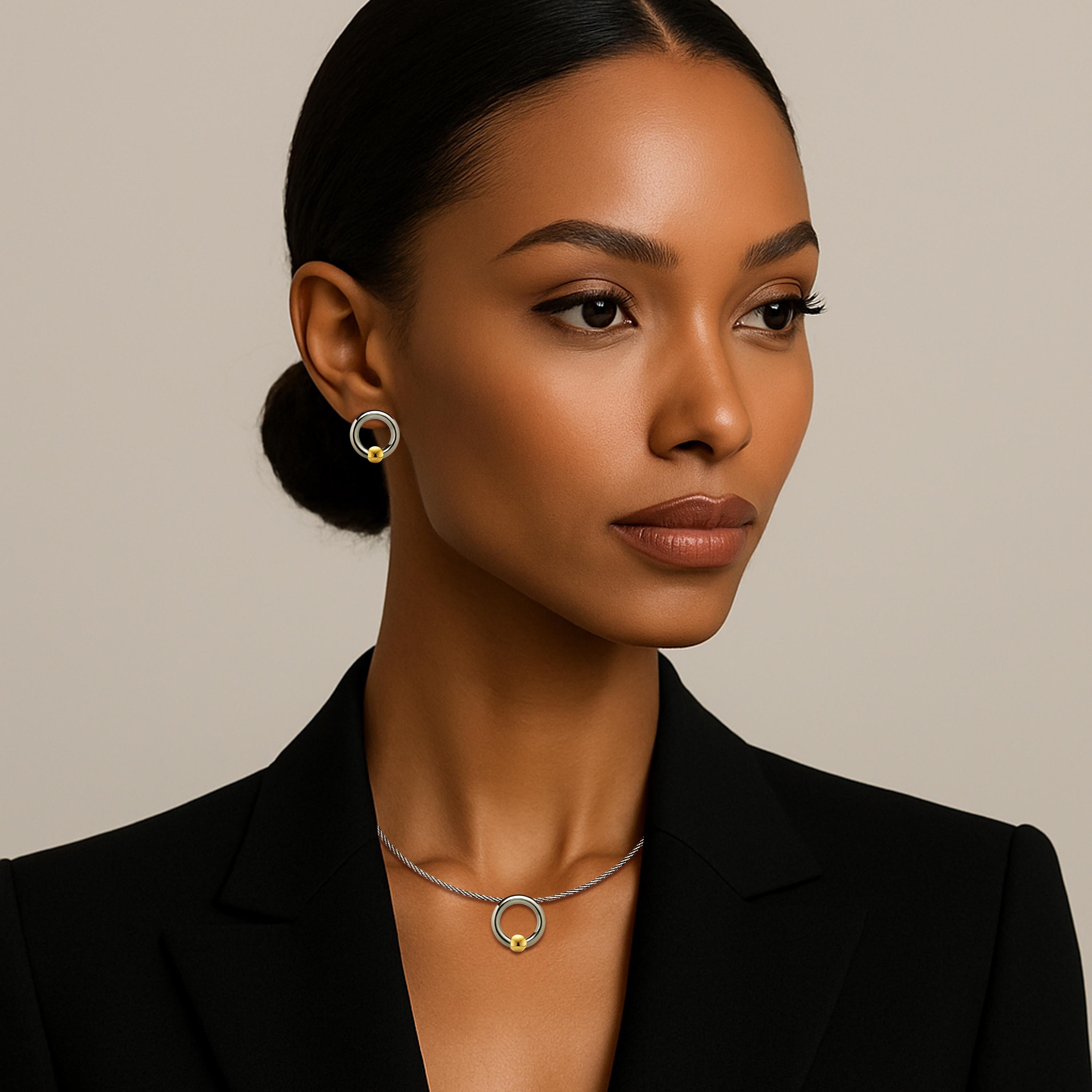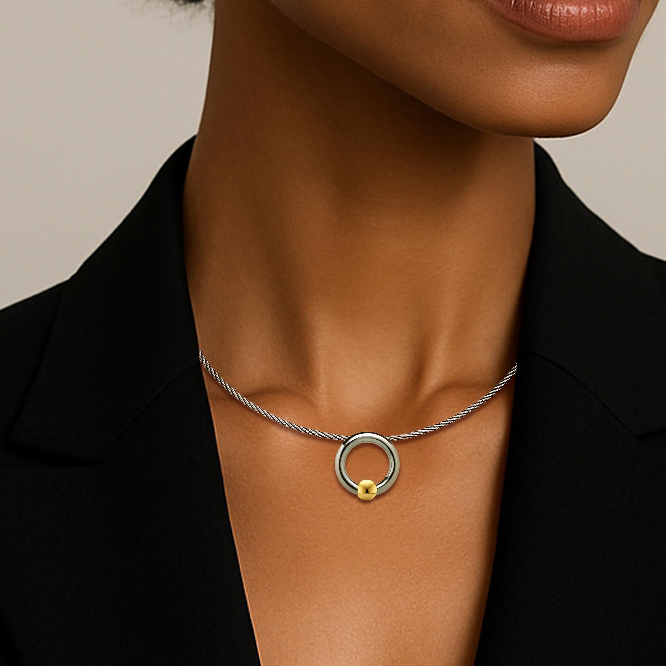 Radiant and refined, the Luna pendant captures the quiet poetry of the night sky. A perfectly round gold sphere, tension-set within a polished stainless steel circle, glows at the heart of the design—an emblem of balance, purity, and enduring elegance. The smooth curvature of the steel reflects light with a mirror-like brilliance, while the sphere appears to float effortlessly within its orbit, much like the New Moon suspended in the heavens. Every detail is crafted with precision, transforming a minimalist silhouette into a statement of sophistication. Suspended from a refined stainless steel cable, the Luna pendant is more than a piece of jewelry: it is a celebration of modern luxury, timeless beauty, and the artistry of Italian craftsmanship.