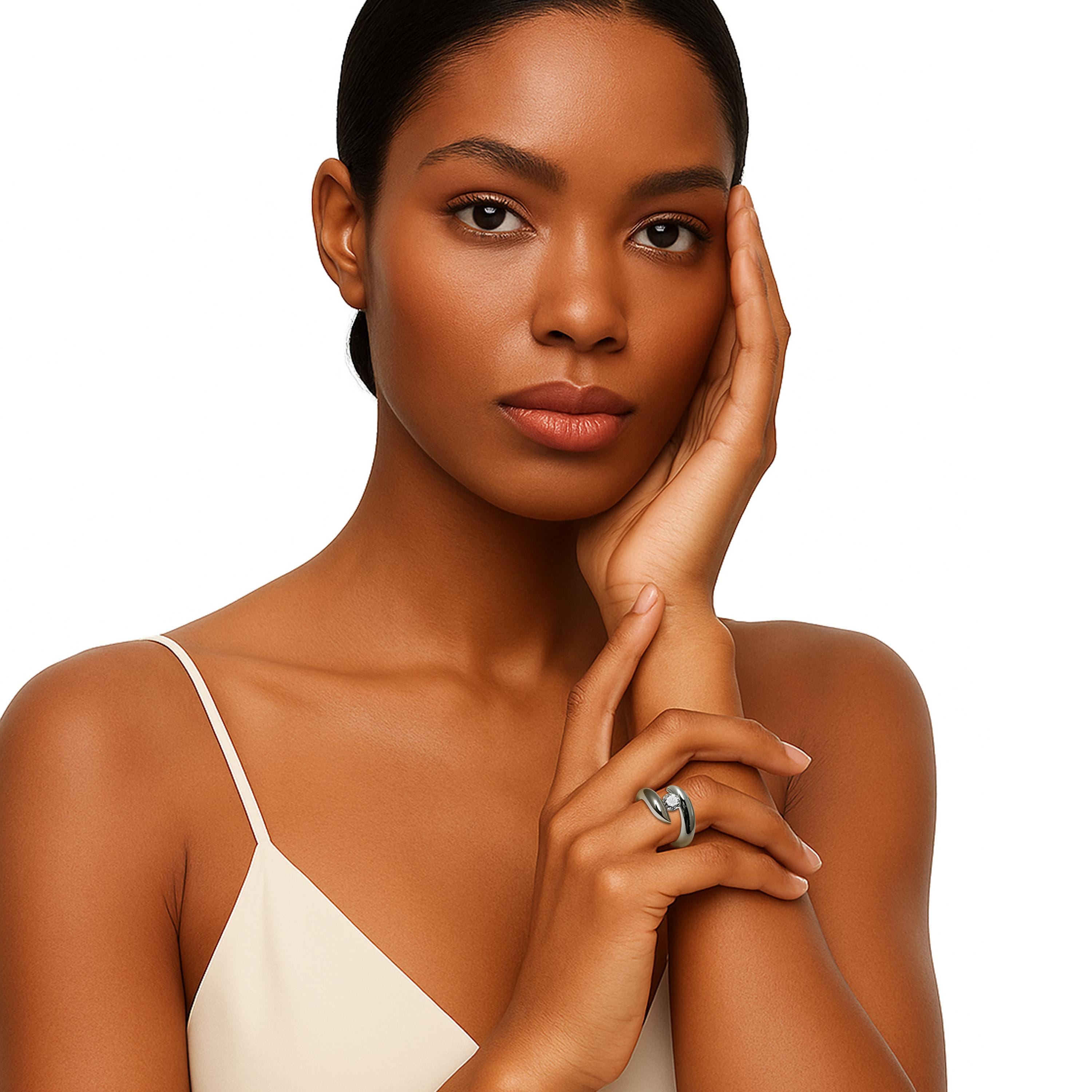 A sleek bypass design where two graceful bands flow around the finger, meeting in a tension of perfect balance. At the center, a luminous round White Sapphire radiates with refined luminosity. The sculptural silhouette feels fluid and contemporary, yet timeless in its elegance — a piece that embodies both style and luxury, standing out effortlessly in any setting.