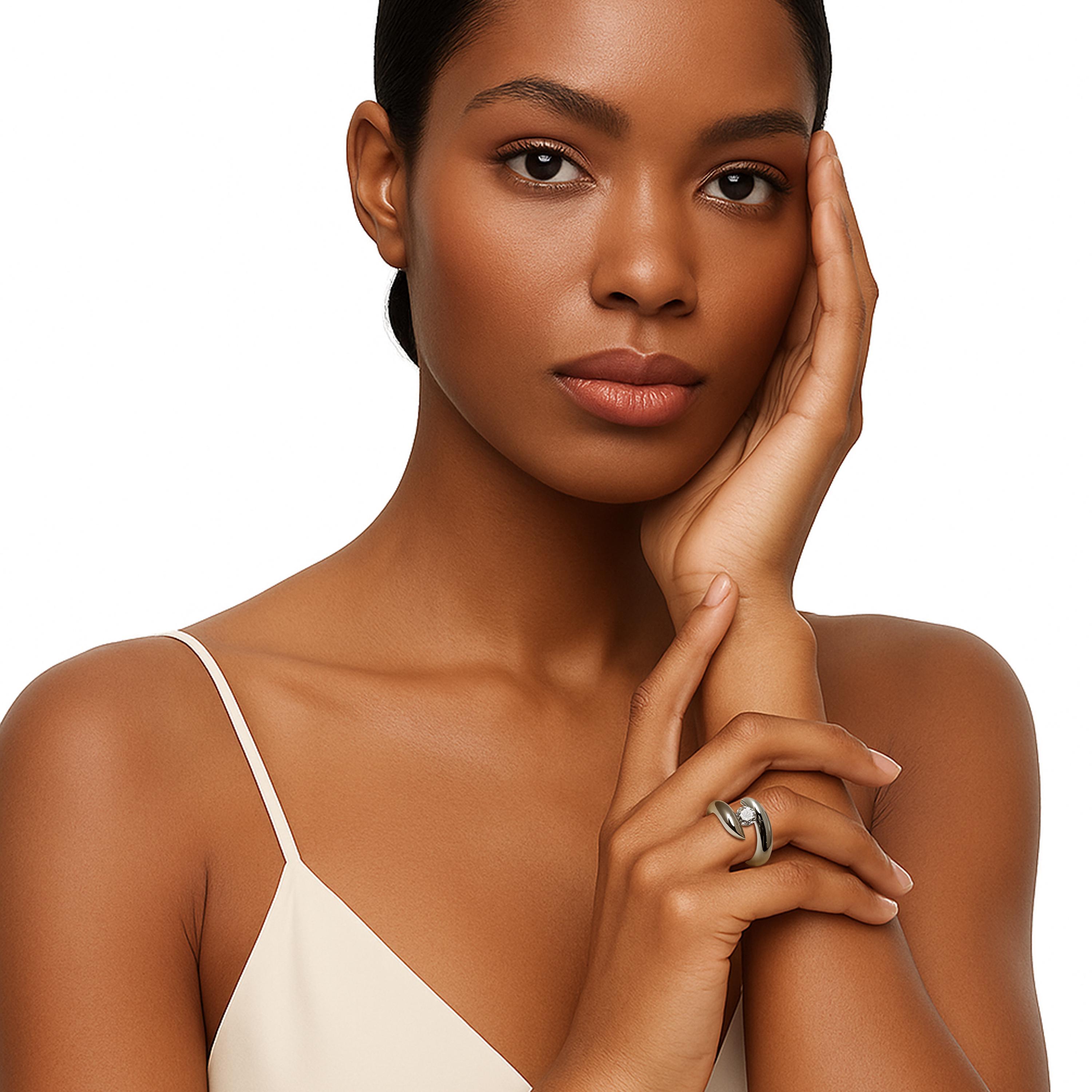 A sleek bypass design where two graceful bands flow around the finger, meeting in a tension of perfect balance. At the center, a luminous round White Sapphire radiates with refined luminosity. The sculptural silhouette feels fluid and contemporary, yet timeless in its elegance — a piece that embodies both style and luxury, standing out effortlessly in any setting.