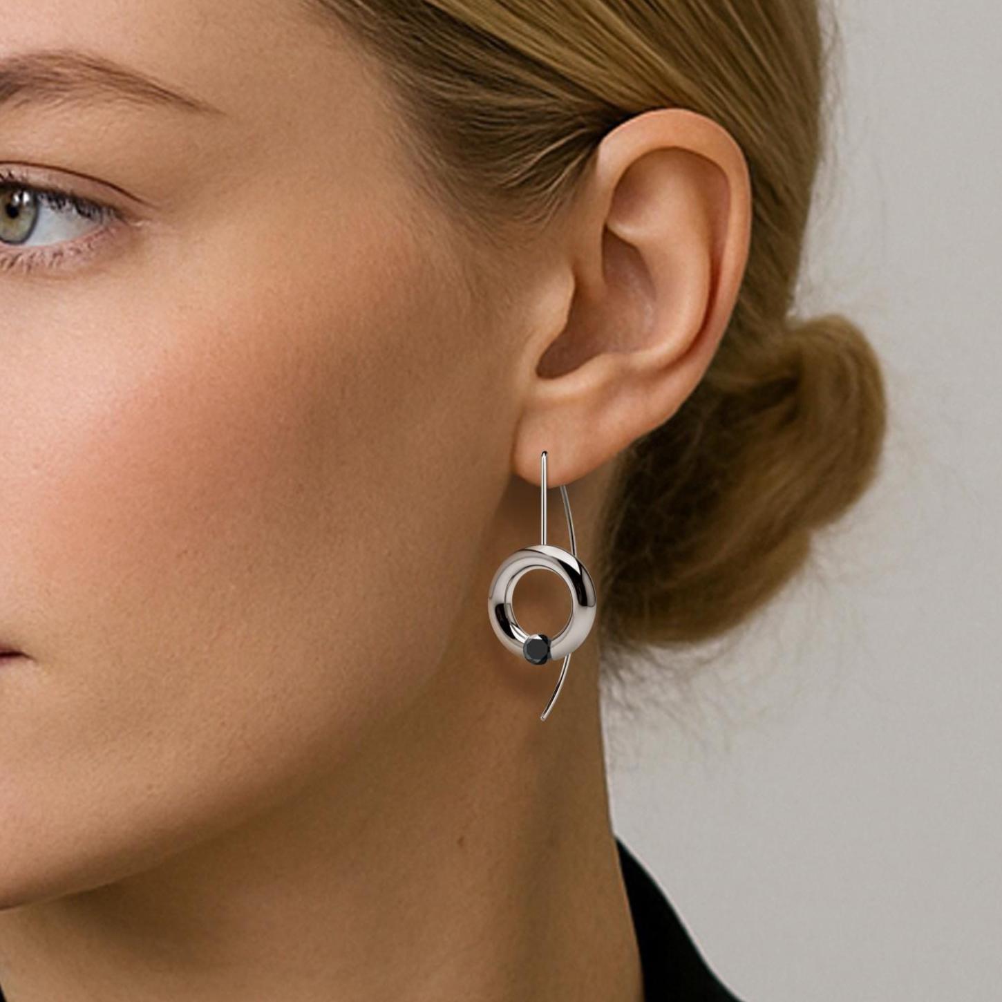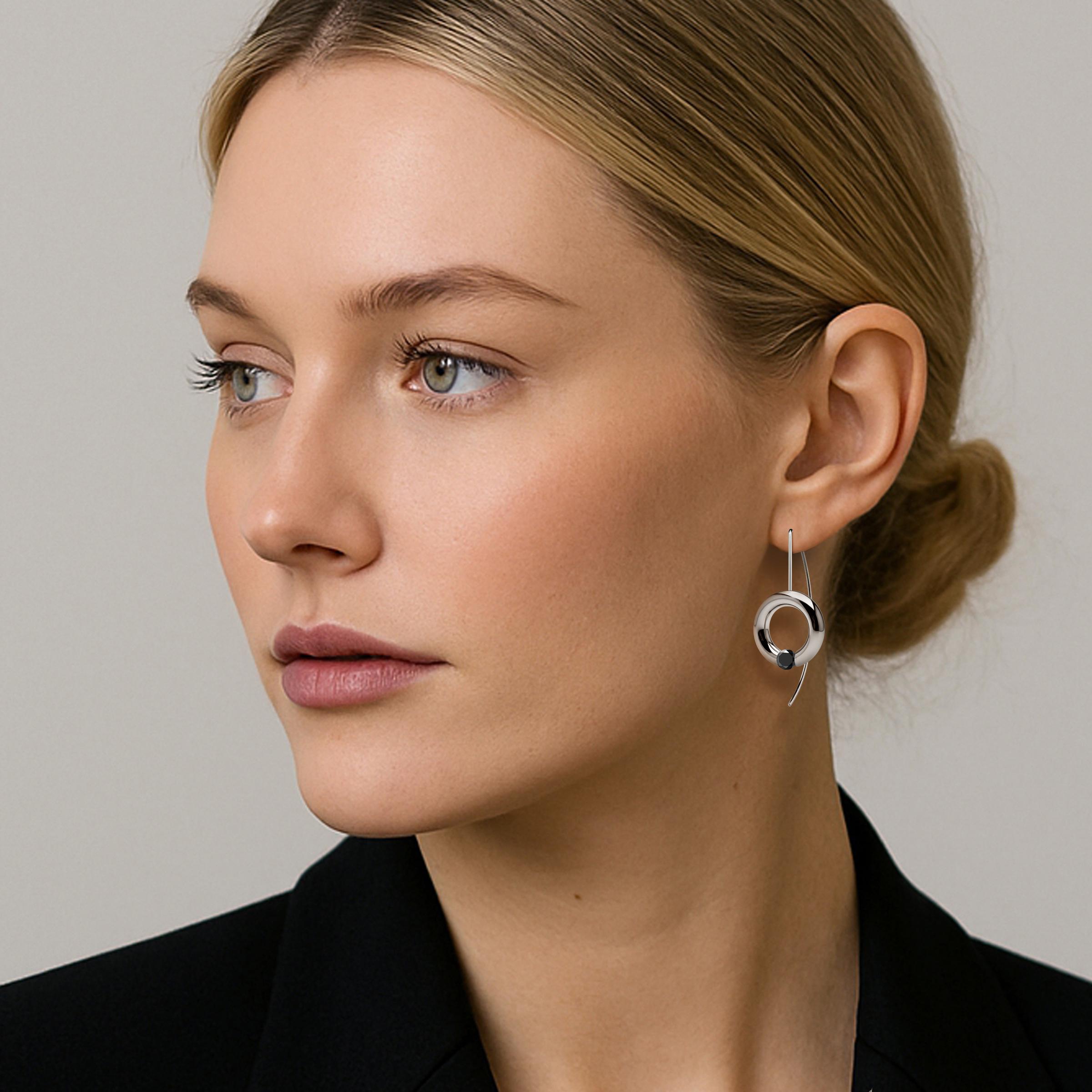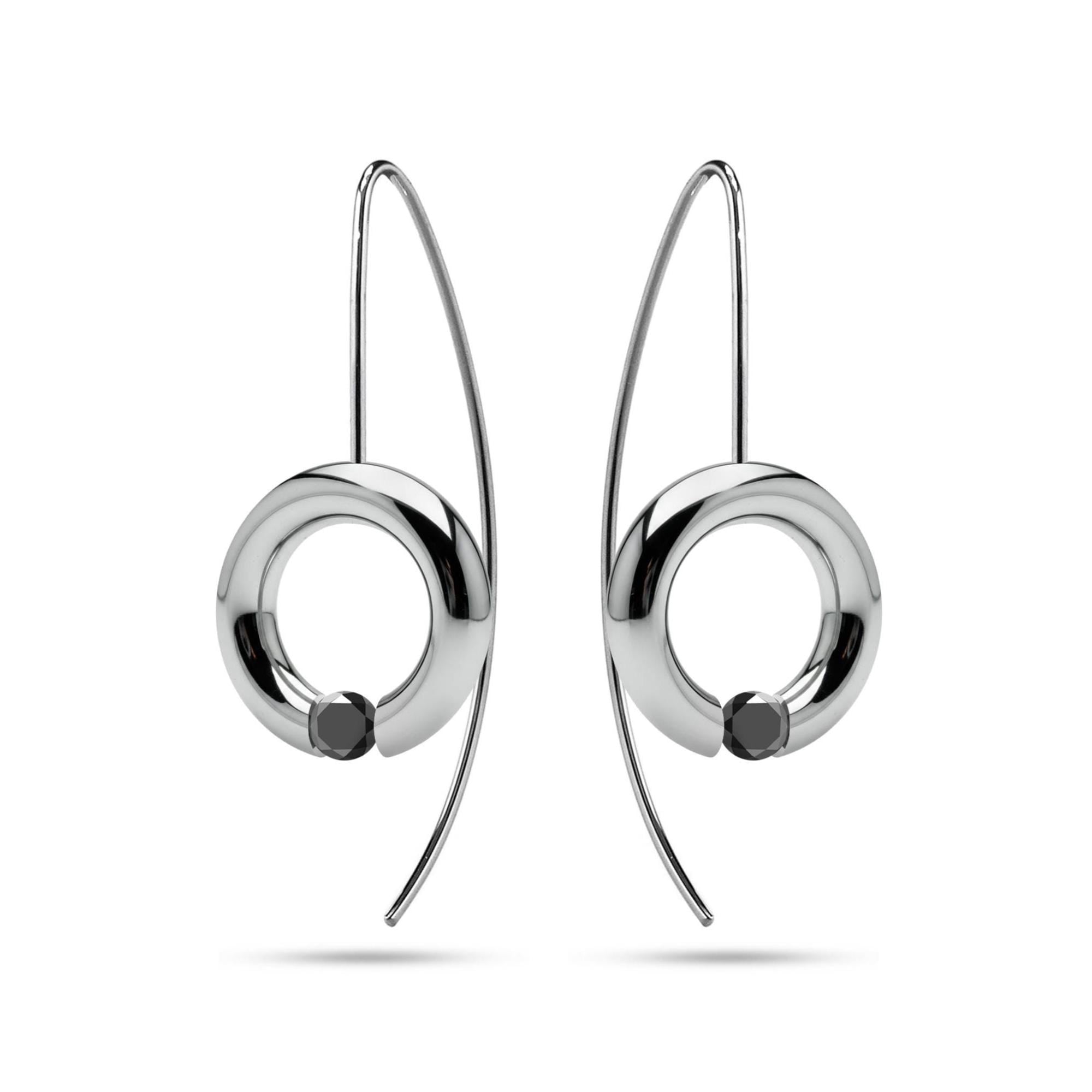 Delicate yet daring, Taormina’s LUNA drop earrings elevate minimalist jewelry with geometric elegance and effortless sparkle. Each earring showcases a polished 20mm stainless steel hoop suspended from a slender ear wire. At the base, a 6mm round Black Diamond is tension‑set between the hoop ends—seemingly floating, bathed in light, and showcasing its full color then brilliance. These earrings blend lightness and structure in perfect harmony. The open hoop, glowing with tension-set brilliance, brings architectural clarity to your jewelry collection. Playful, refined, and versatile—from casual days to memorable evenings.