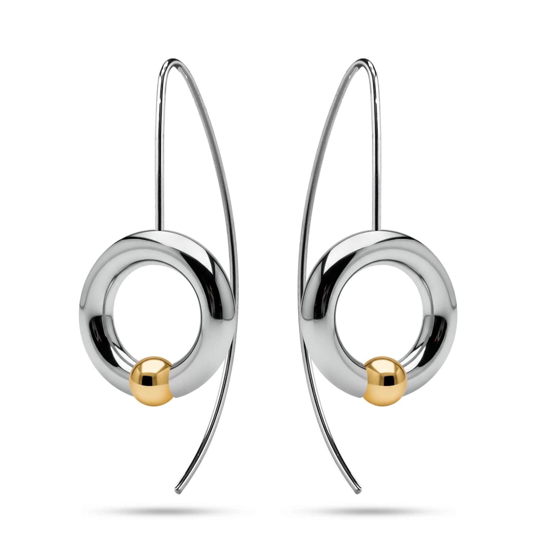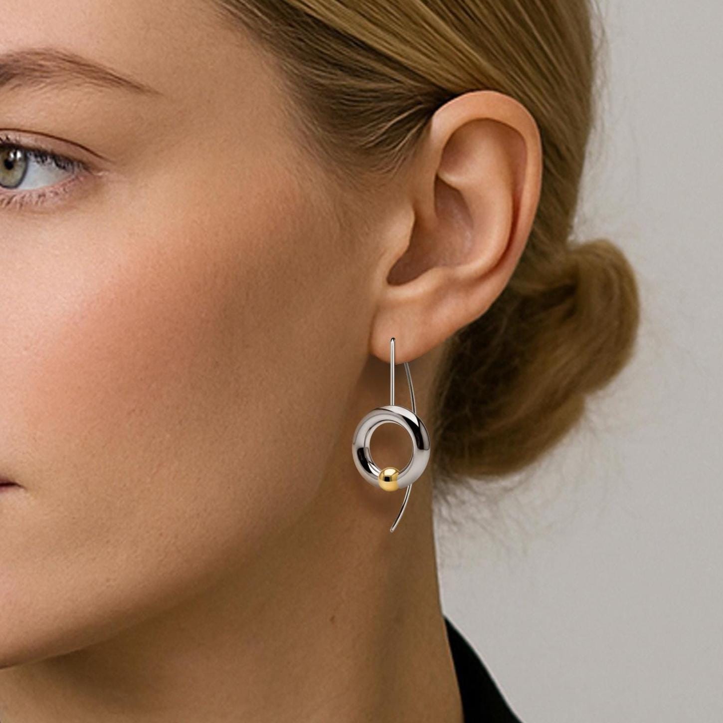 Delicate yet daring, Taormina’s LUNA dangle earrings elevate minimalist jewelry with geometric elegance and effortless sparkle. Each earring showcases a polished 20mm stainless steel hoop suspended from a slender ear wire. At the base, a 6mm round gold sphere is tension‑set between the hoop ends—seemingly floating, bathed in light, and showcasing its full color then brilliance. These earrings blend lightness and structure in perfect harmony. The open hoop, glowing with tension-set brilliance, brings architectural clarity to your jewelry collection. Playful, refined, and versatile—from casual days to memorable evenings.