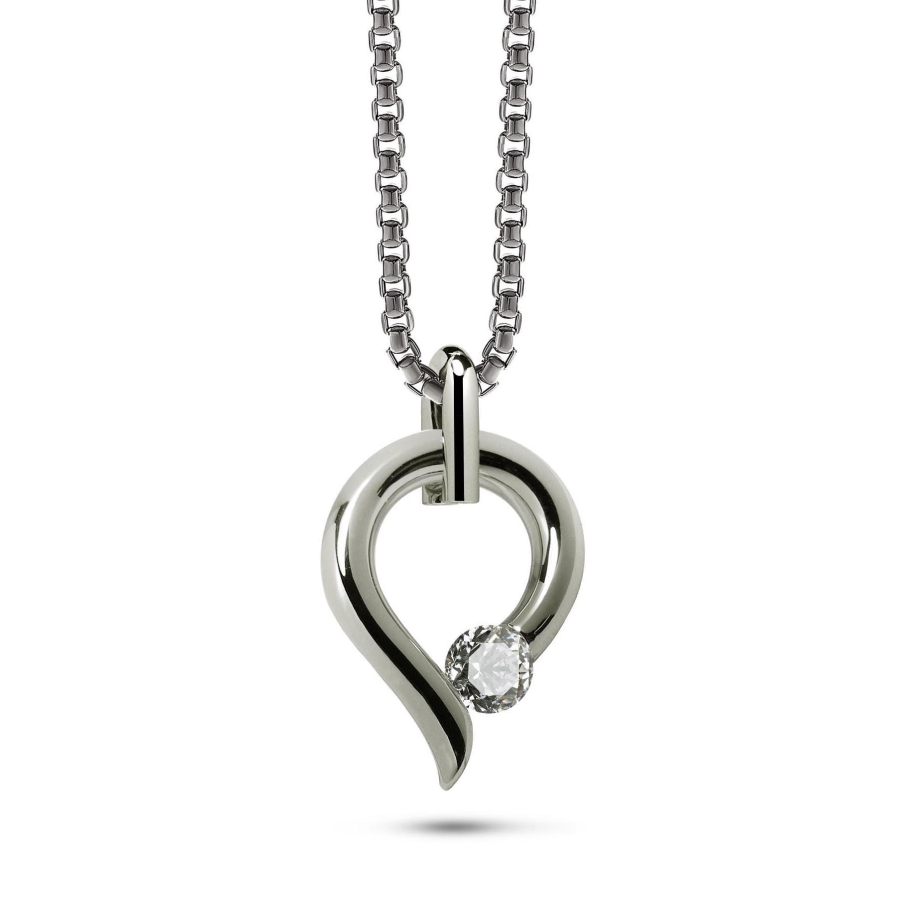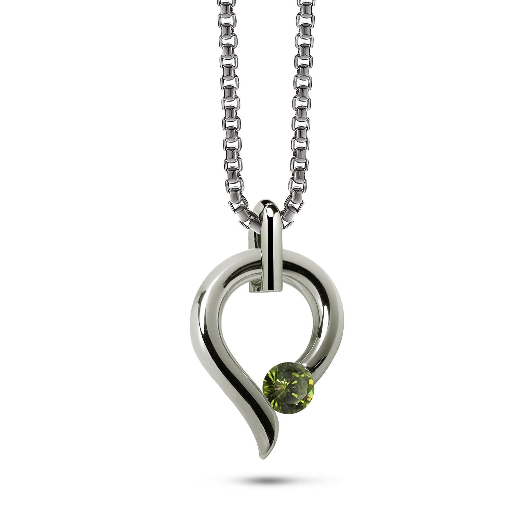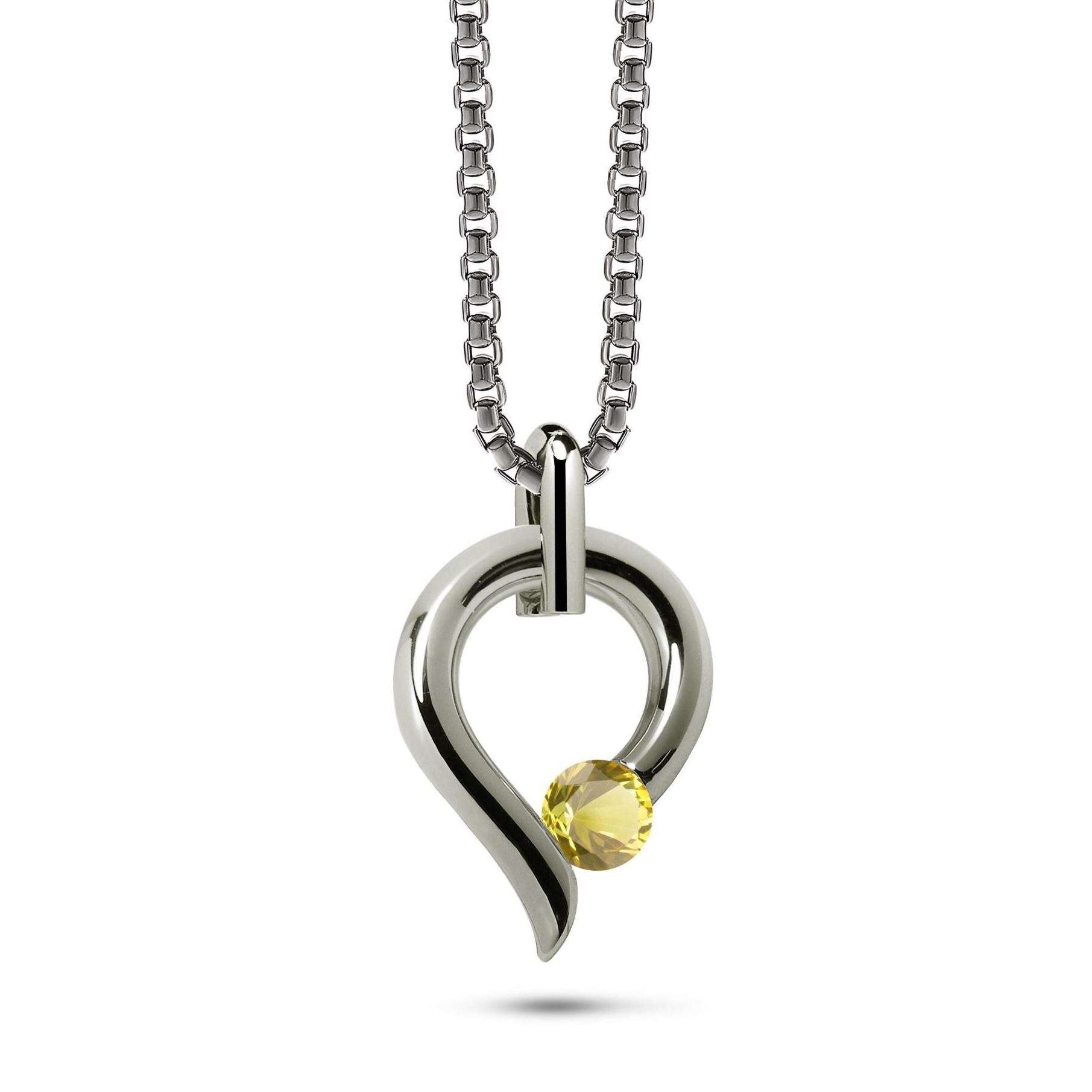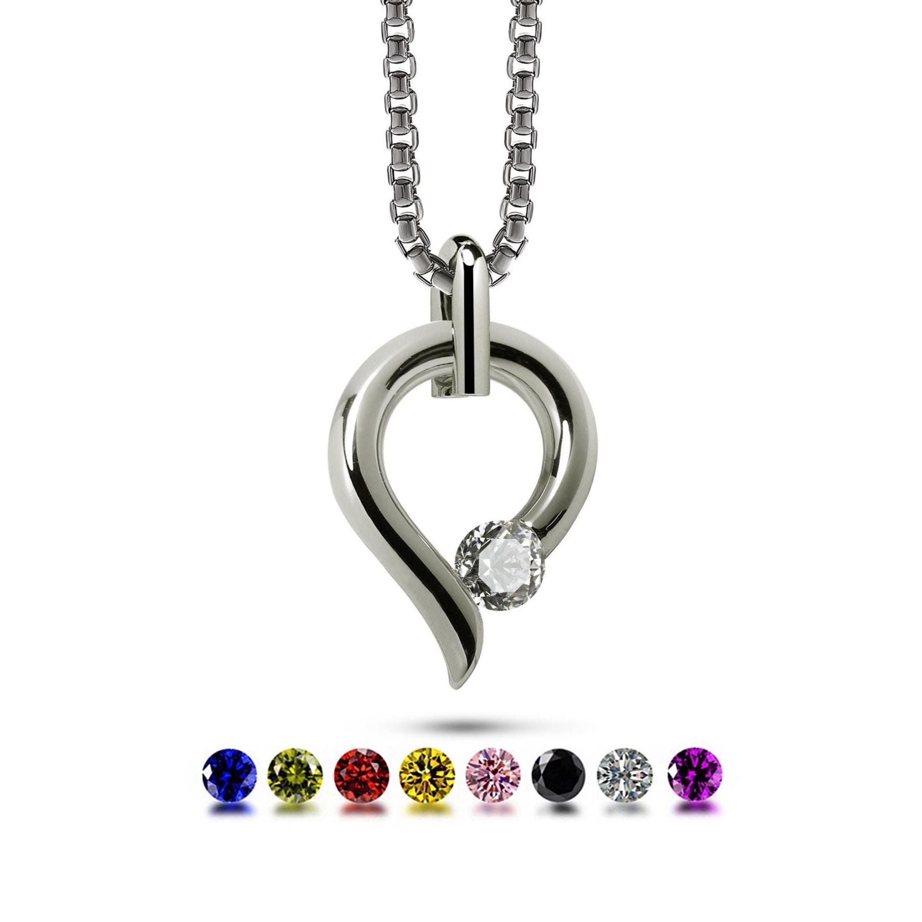 This elegant pendant reimagines the classic teardrop silhouette with a contemporary twist. Crafted from polished, hypoallergenic 316 stainless steel, the tubular frame suspends a brilliant-cut gemstone—securely held by tension—for an arresting visual effect that appears to float within the metal. The off-center placement of the gem creates dynamic light play and a subtle architectural charm.