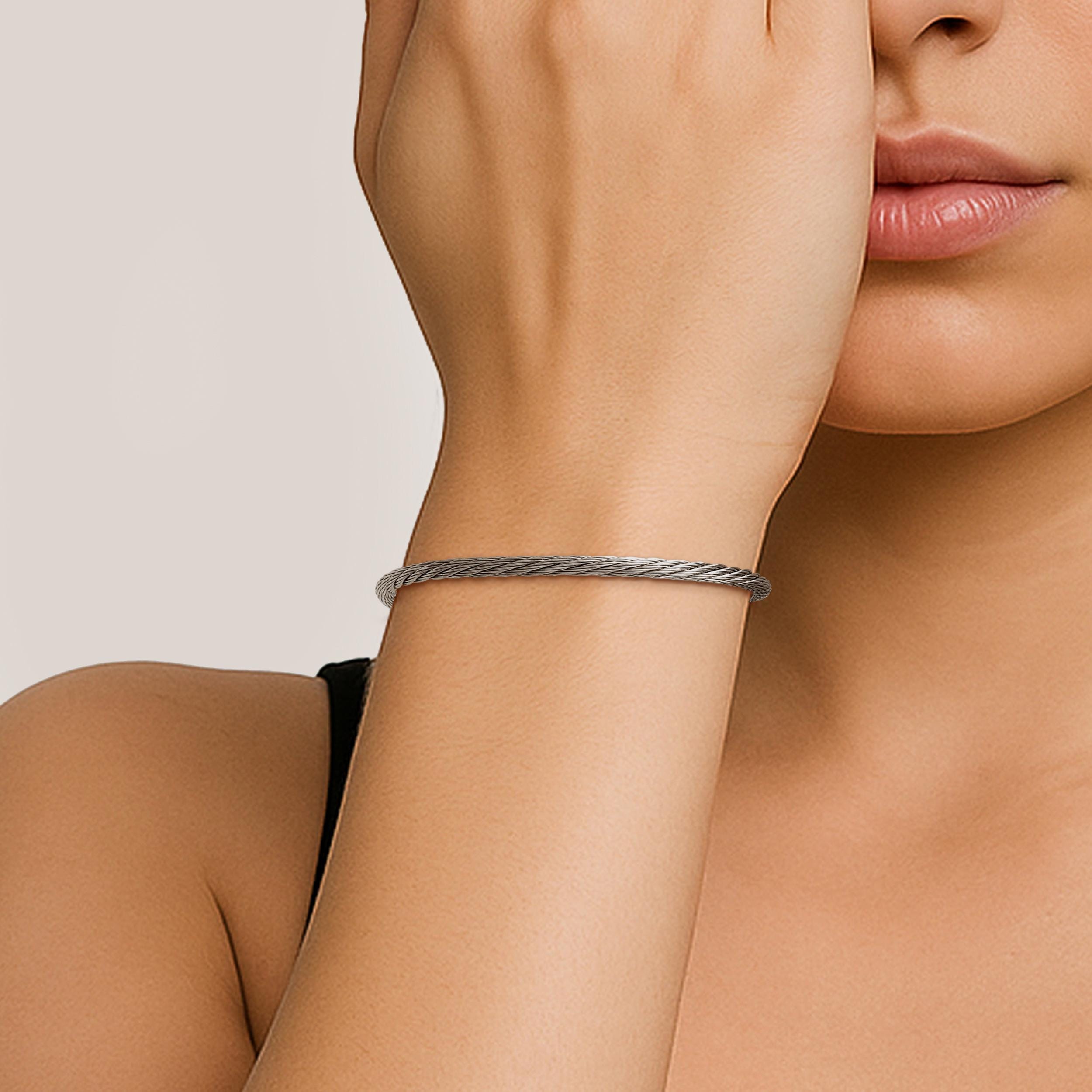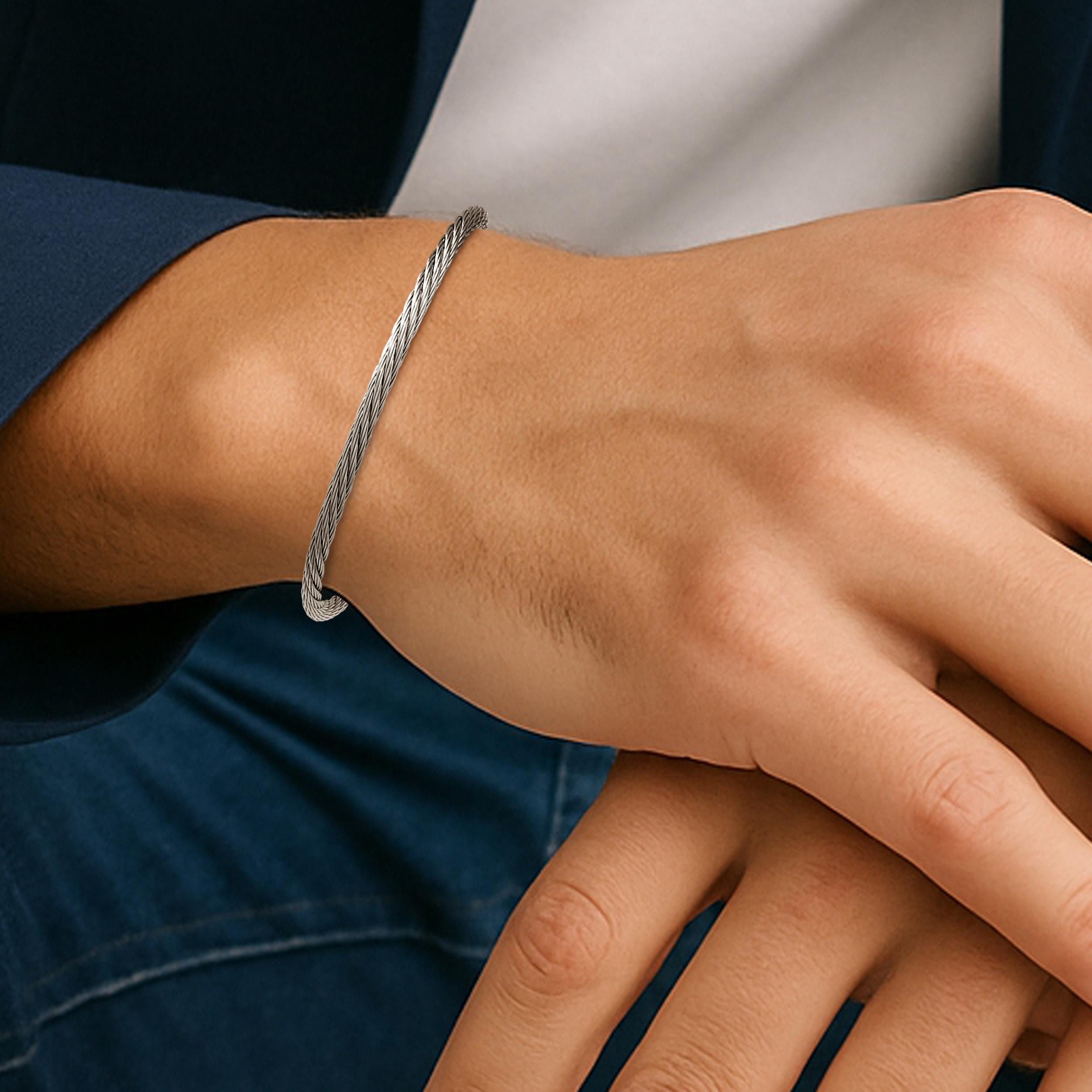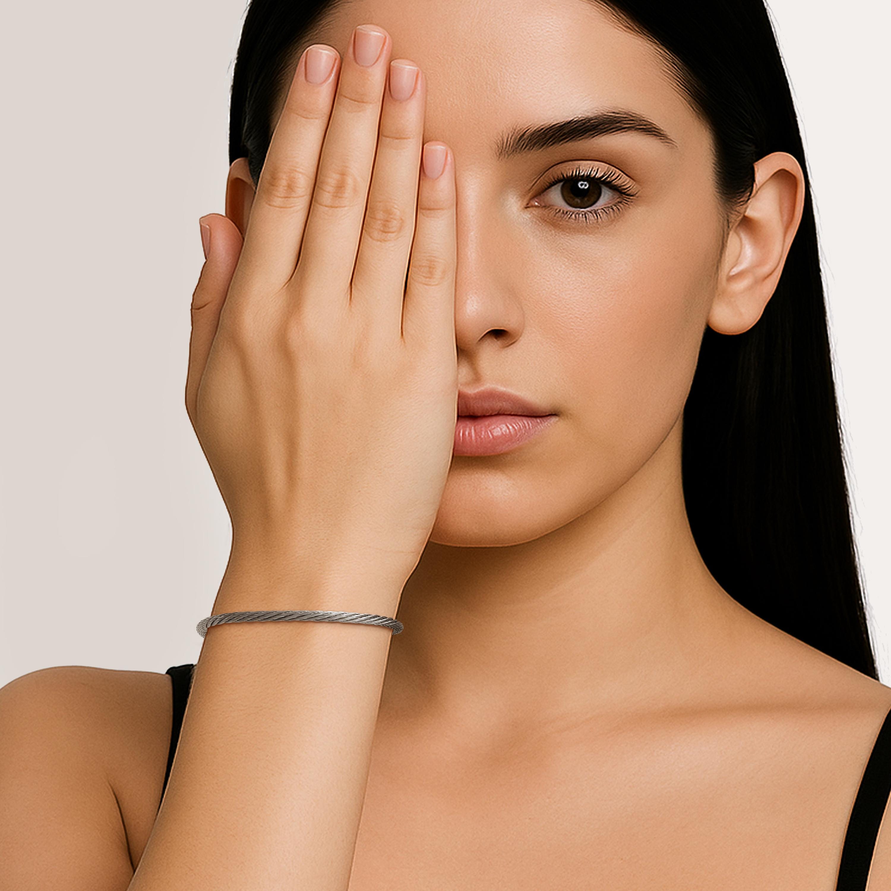 Engineered for durability and minimalist appeal, this Cable Bracelet is built around an authentic, high-tensile stainless steel wire rope. This highly refined sculptural piece is not a twisted facsimile; the core of this piece is a genuine industrial cable, meticulously constructed from dozens of individual, finely spun stainless steel wires tightly woven together. This complex structure provides both superior flexibility and a superlative, radiant luster as it catches the light—a depth of brilliance that solid metal cannot achieve.