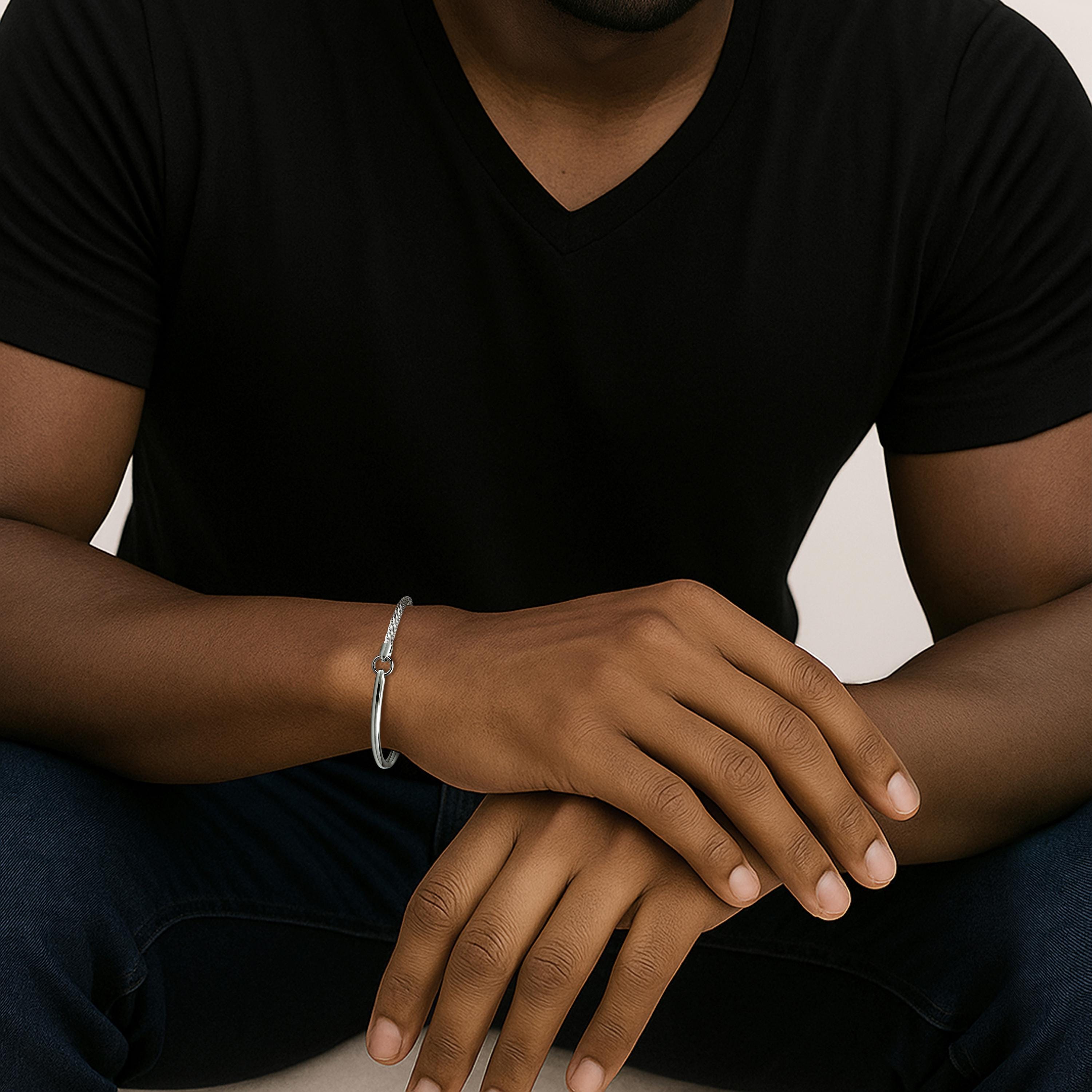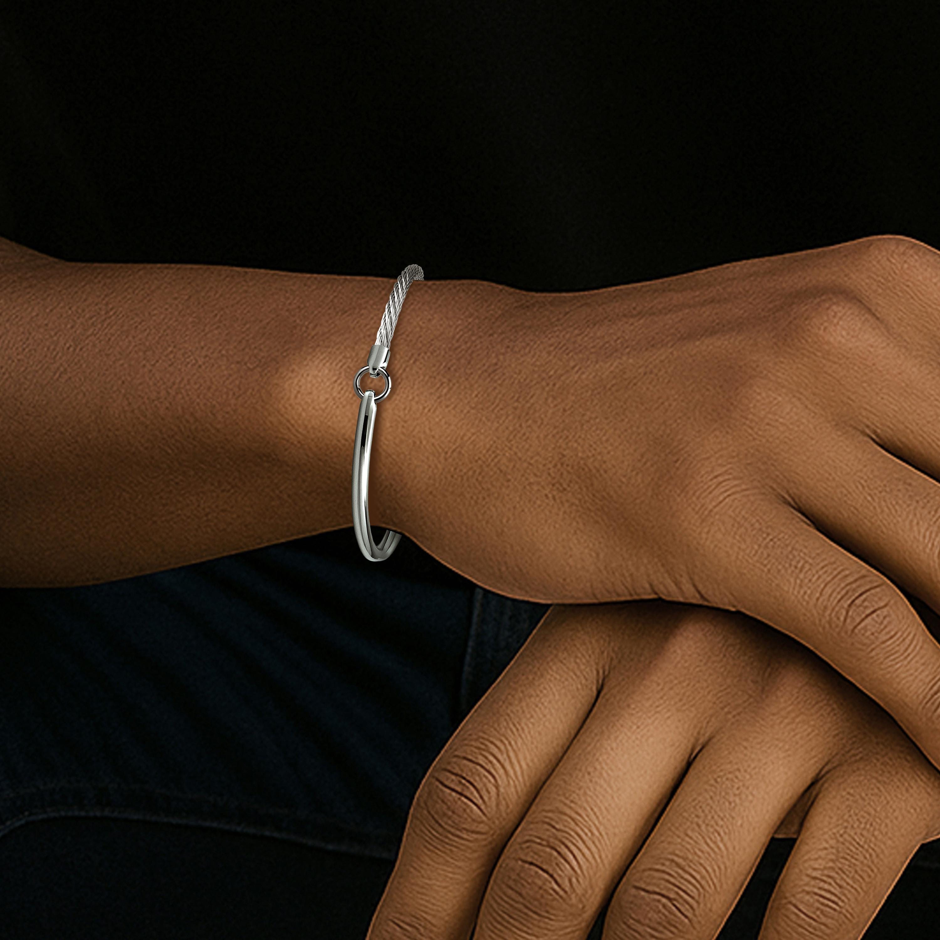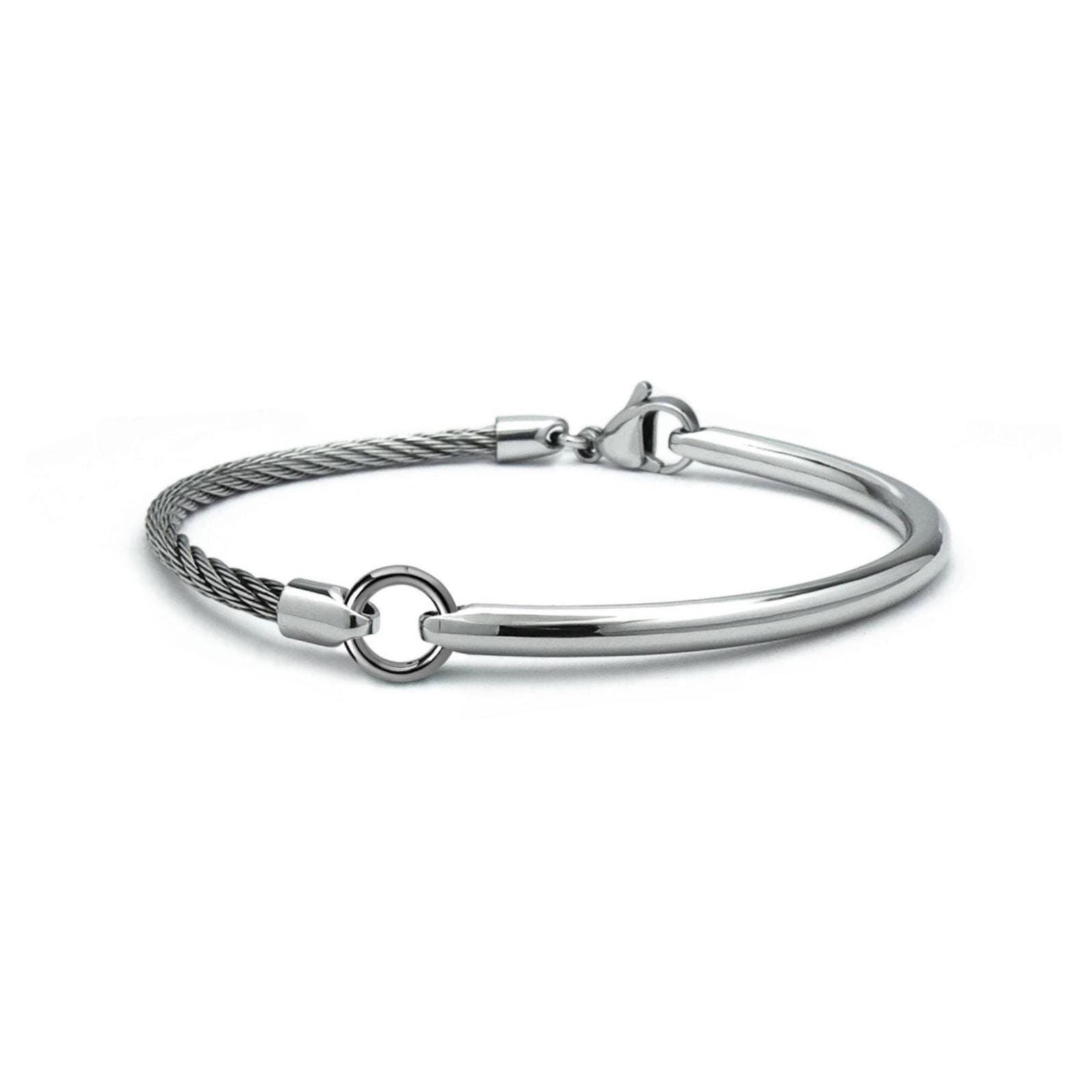 This sleek and elegant bracelet merges a polished solid stainless‑steel rod (4 mm) with a 3 mm flexible cable, offering a striking contrast between structure and fluidity. Each component is fully handmade using an innovative technique, resulting in a bracelet so refined you'll never want to take it off. The side caps are securely riveted into the cable, ensuring a robust and reliable connection.