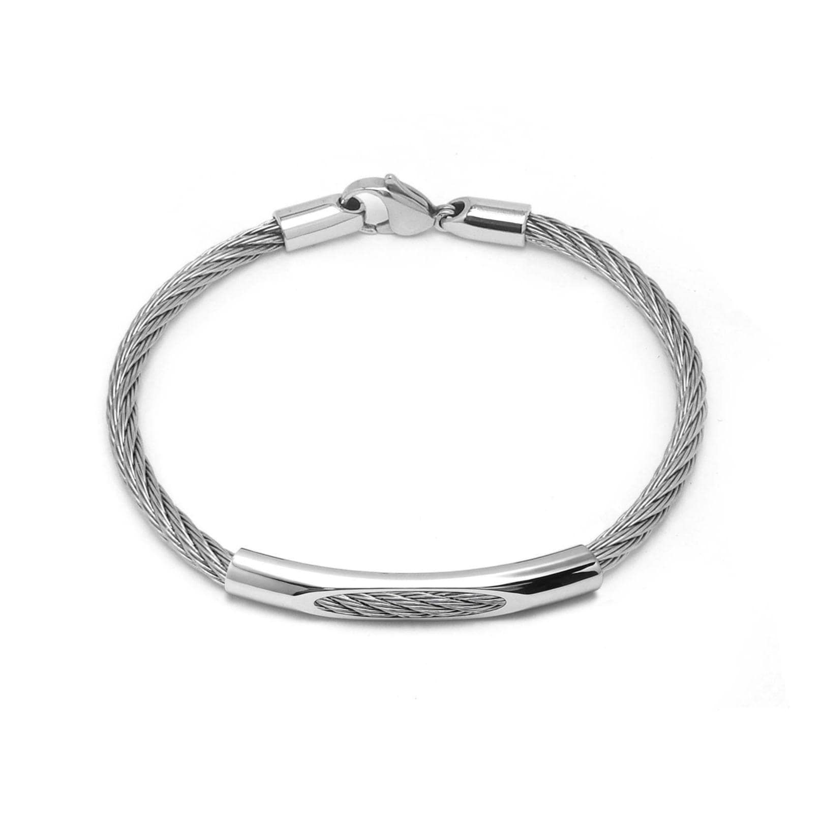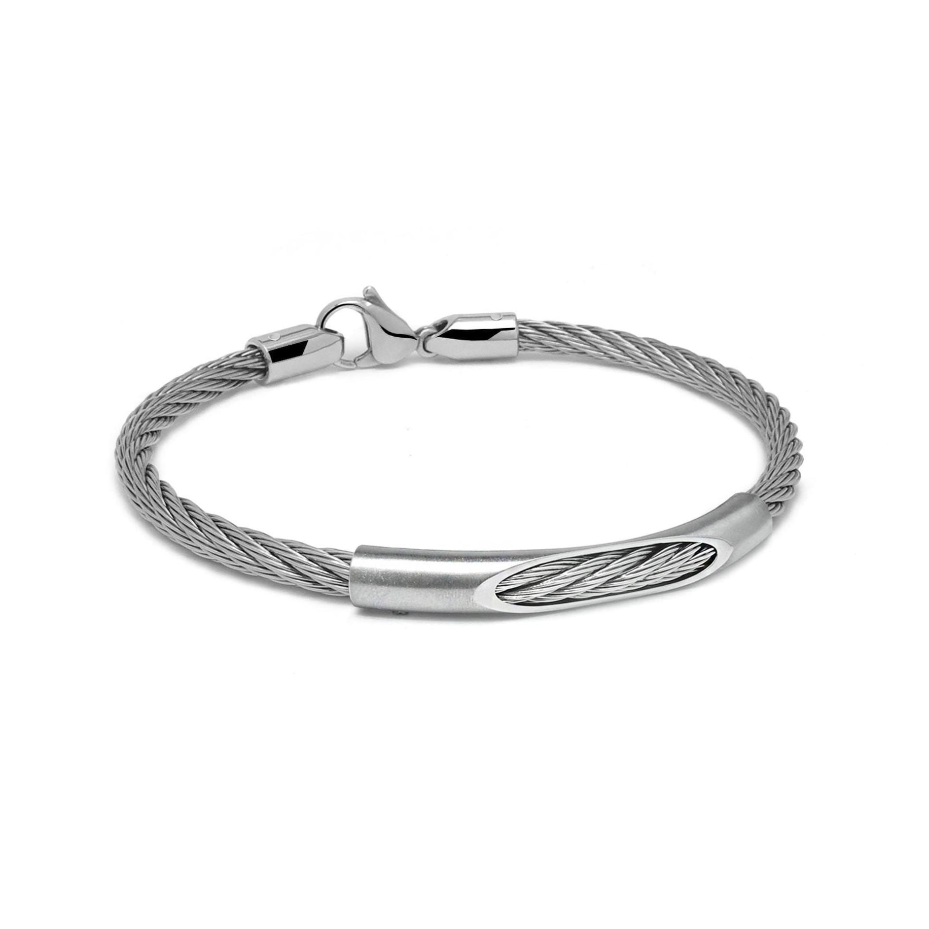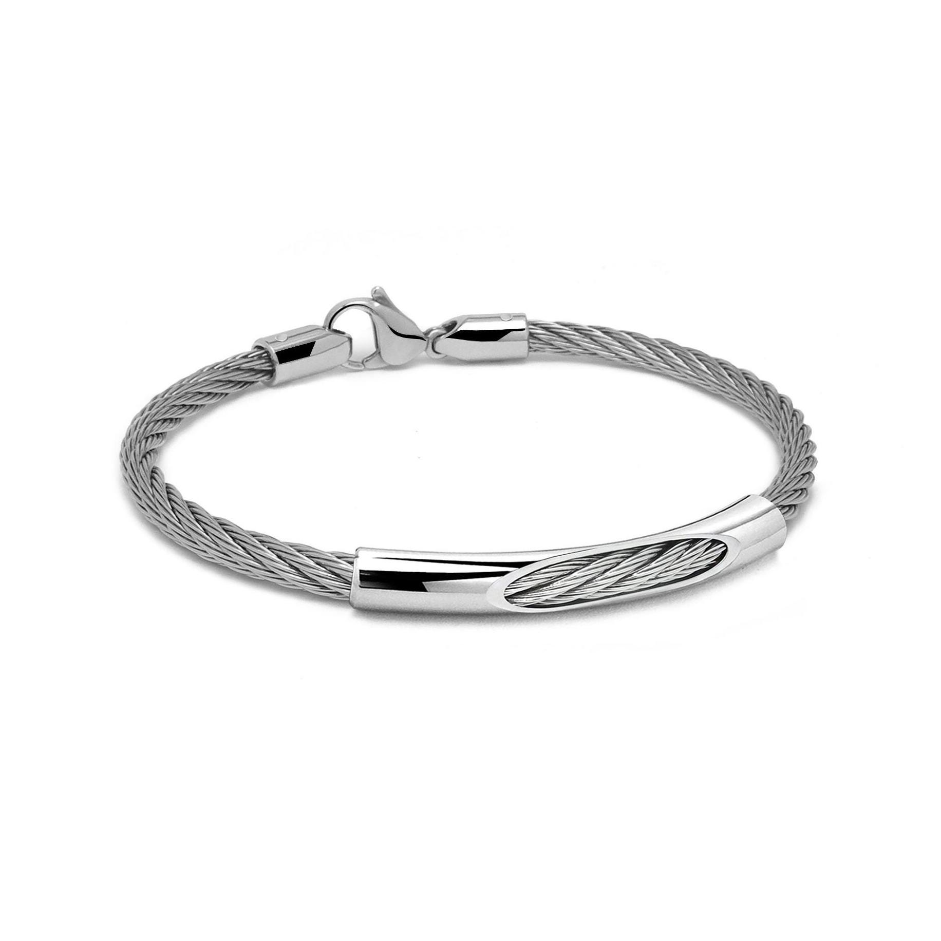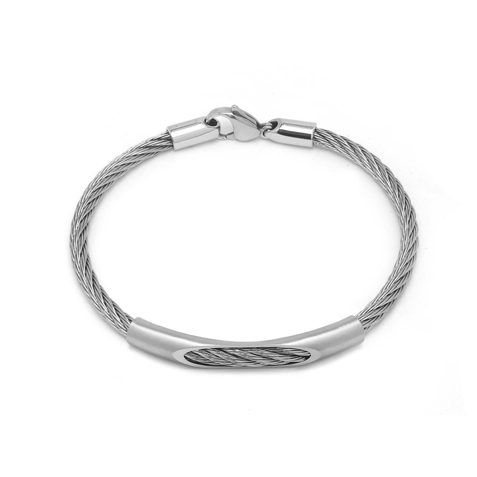 The side caps are securely riveted into the cable, ensuring a robust and reliable connection. This bracelet is perfect worn solo or layered with other pieces for a personalized look. Lightweight and versatile, it transitions seamlessly from office to evening.