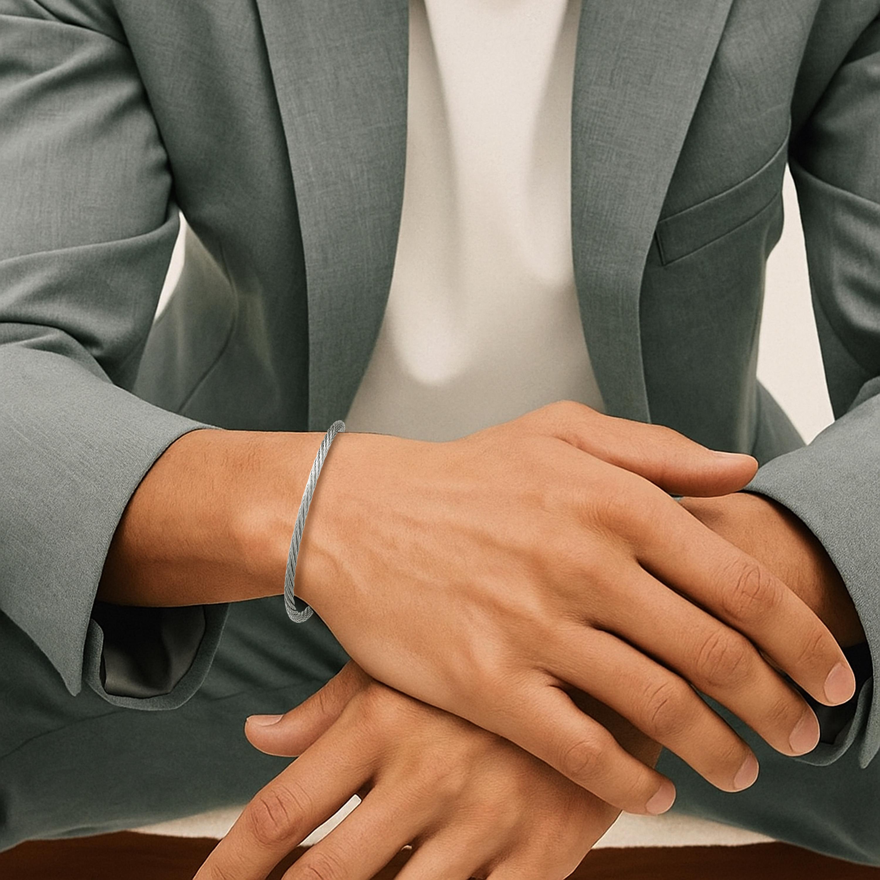 Finished with brushed stainless steel twist bayonet clasp, riveted into the cable, ensuring a robust and reliable connection, this bracelet is perfect worn solo or layered with other pieces for a personalized look. Lightweight and versatile, it transitions seamlessly from office to evening.