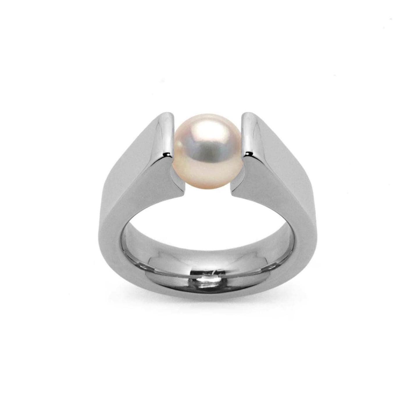 Bold, architectural, and strikingly modern — this AMORE Tension Set Ring from Taormina Jewelry is a true statement of minimalist design and technical mastery. Crafted in premium stainless steel, the setting holds a round white cultured pearl in perfect suspension, appearing to float effortlessly between the open arms of the ring.