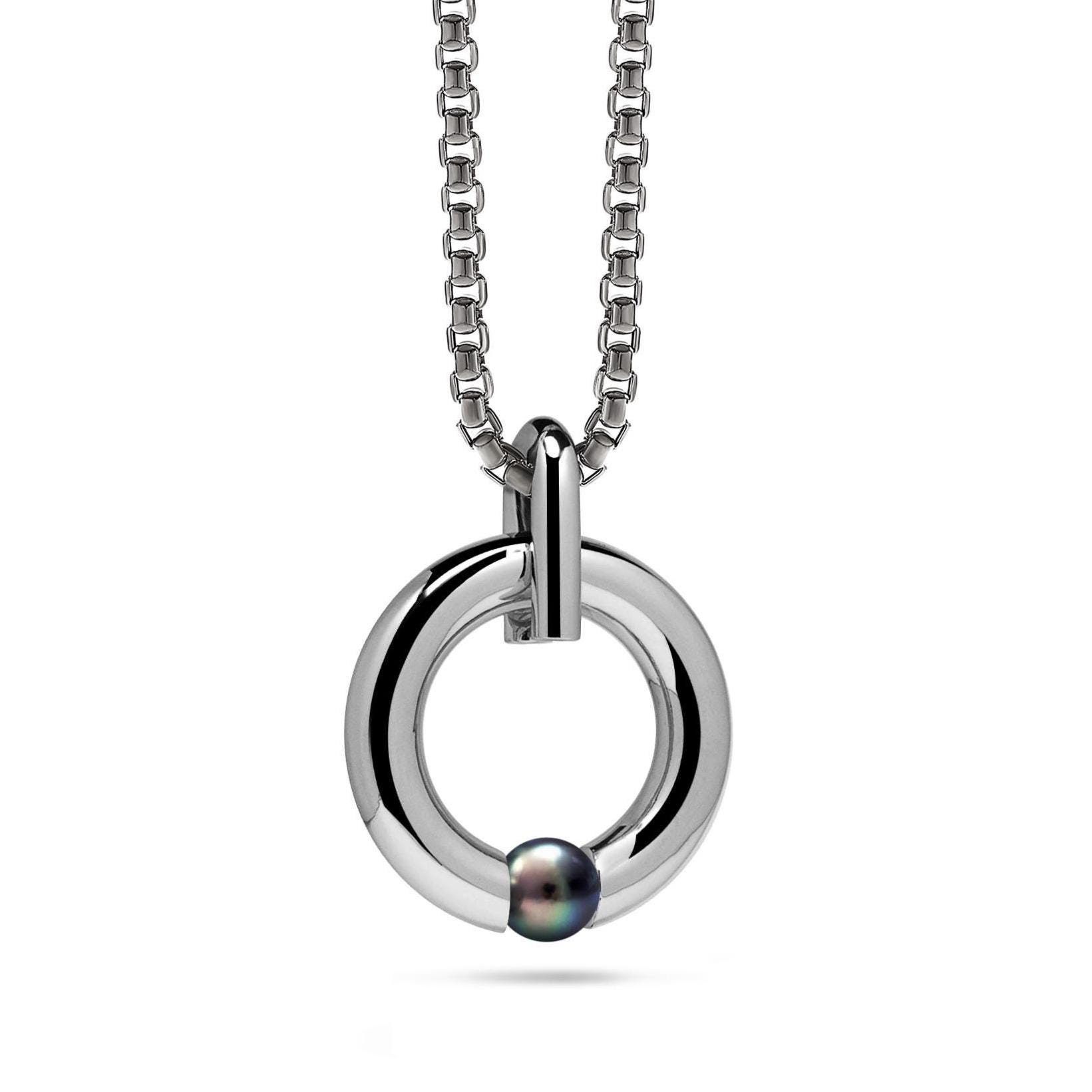 A study in precision and purity. This sculptural necklace features a circular stainless steel pendant with a floating freshwater pearl — engineered with no visible soldering. The components are seamlessly held together by precise tension-fitting, creating a flawless connection between the loop, bail, and chain. The high-polish finish reflects a modern, minimalist aesthetic, while the tension-set black pearl adds an unexpected softness and contrast.