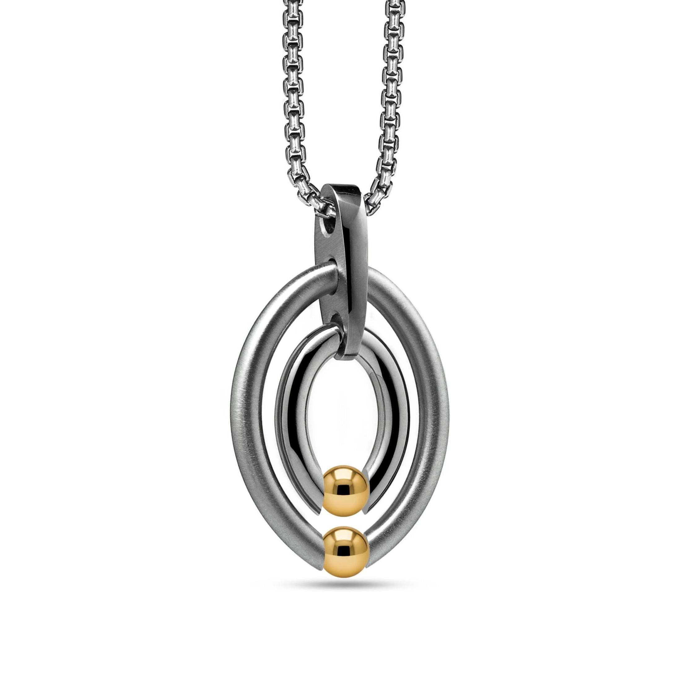 Crafted in brushed and polished stainless steel, the design features two interlocking elliptical rings, symbolizing balance and duality. At the heart of each ring, a tension-set Gold Spheres floats effortlessly — a refined statement of modern elegance.
