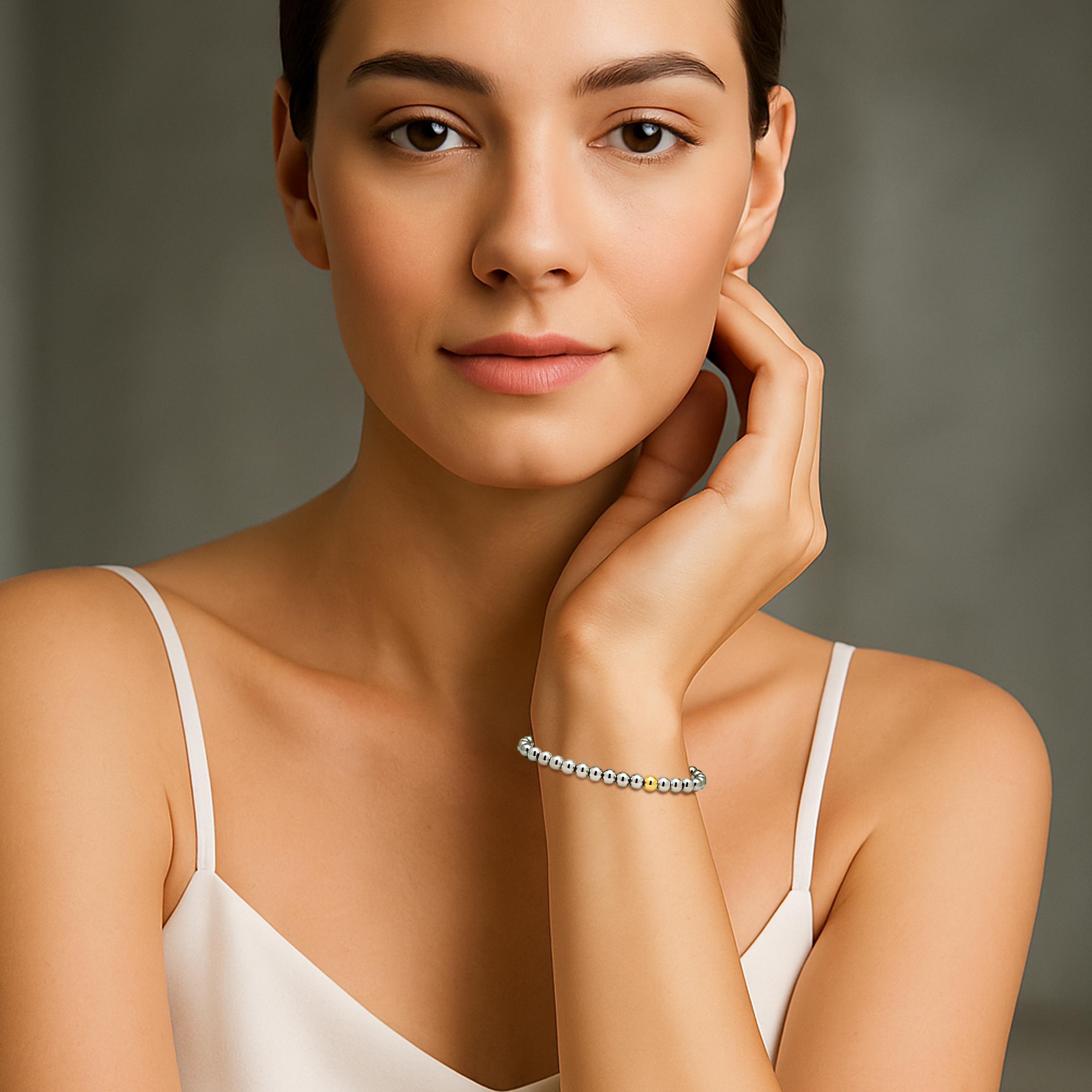 At its center, a sleek accent bead—available in either gold or matching polished steel—offers a subtle yet distinctive contrast, staying true to the brand’s clean, architectural aesthetic.