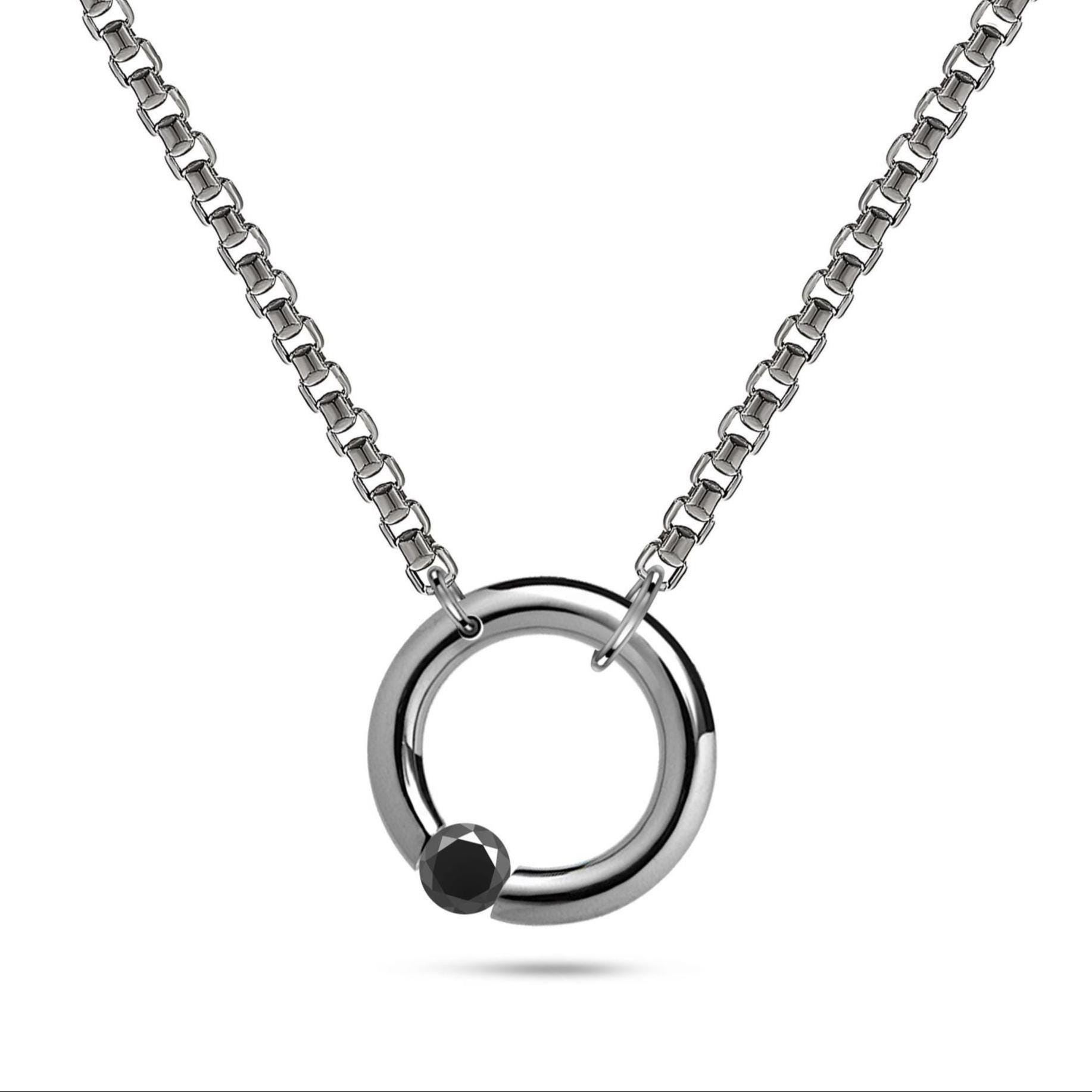 Discover refined minimalism with this contemporary circle necklace by Taormina Jewelry. Expertly crafted from high-polish stainless steel, the pendant features a tension-set black diamond that’s positioned off-center, following the natural diagonal line of the chain. This subtle design detail adds a dynamic sense of movement and modern asymmetry.