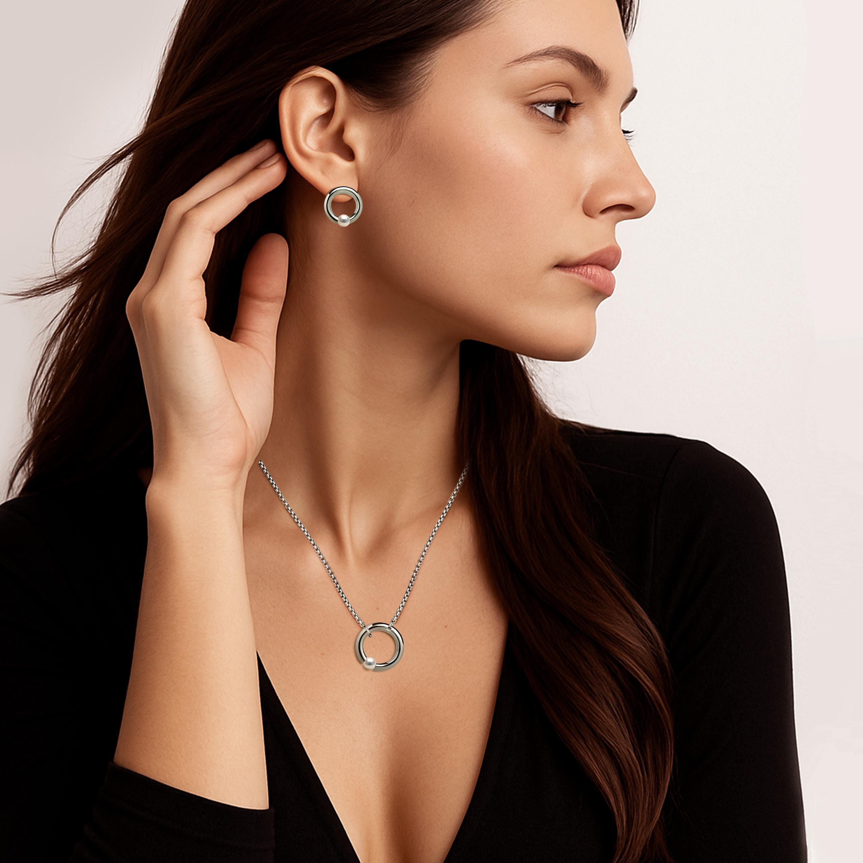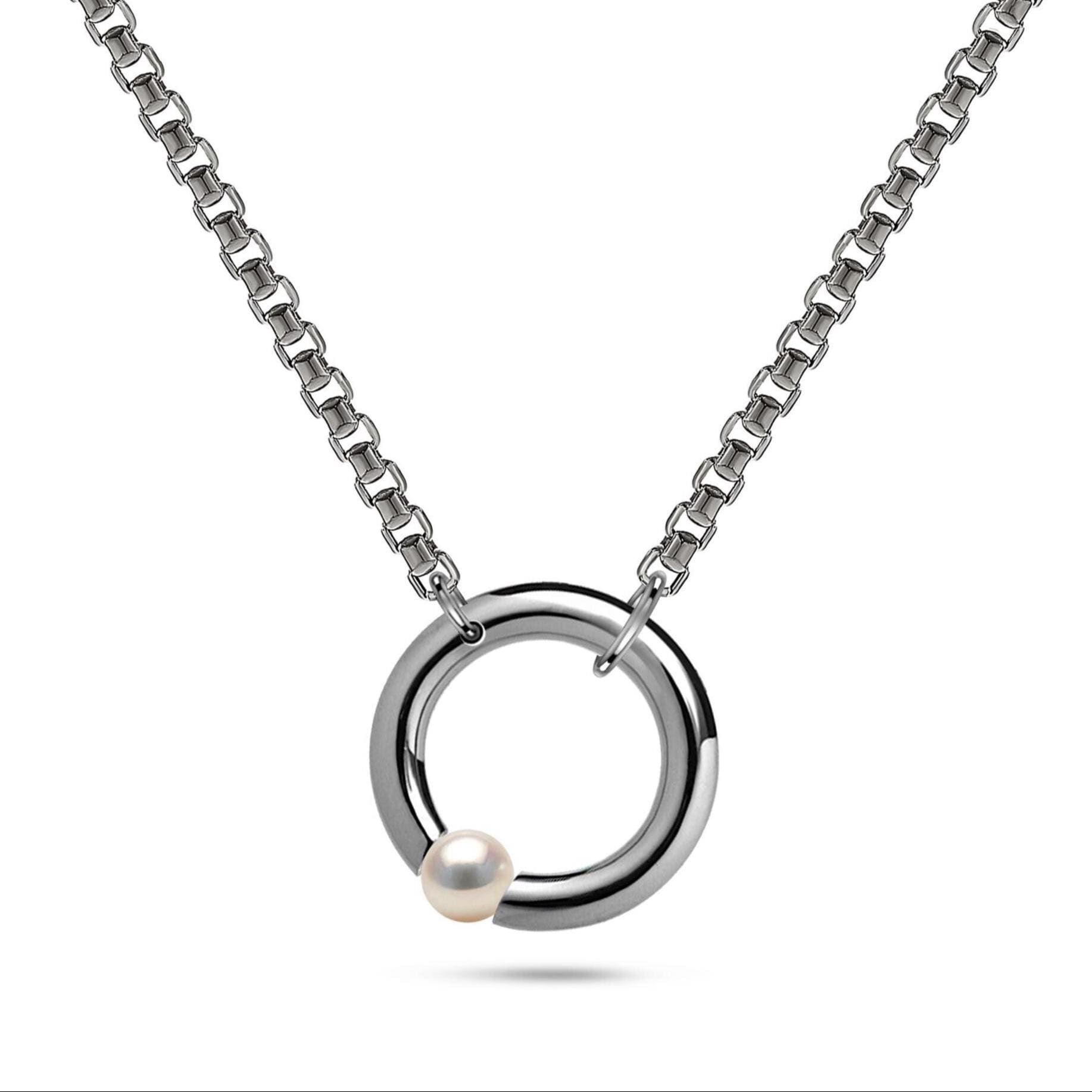 Discover refined minimalism with this contemporary circle necklace by Taormina Jewelry. Expertly crafted from high-polish stainless steel, the pendant features a tension-set white cultured pearl that’s positioned off-center, following the natural diagonal line of the chain. This subtle design detail adds a dynamic sense of movement and modern asymmetry.