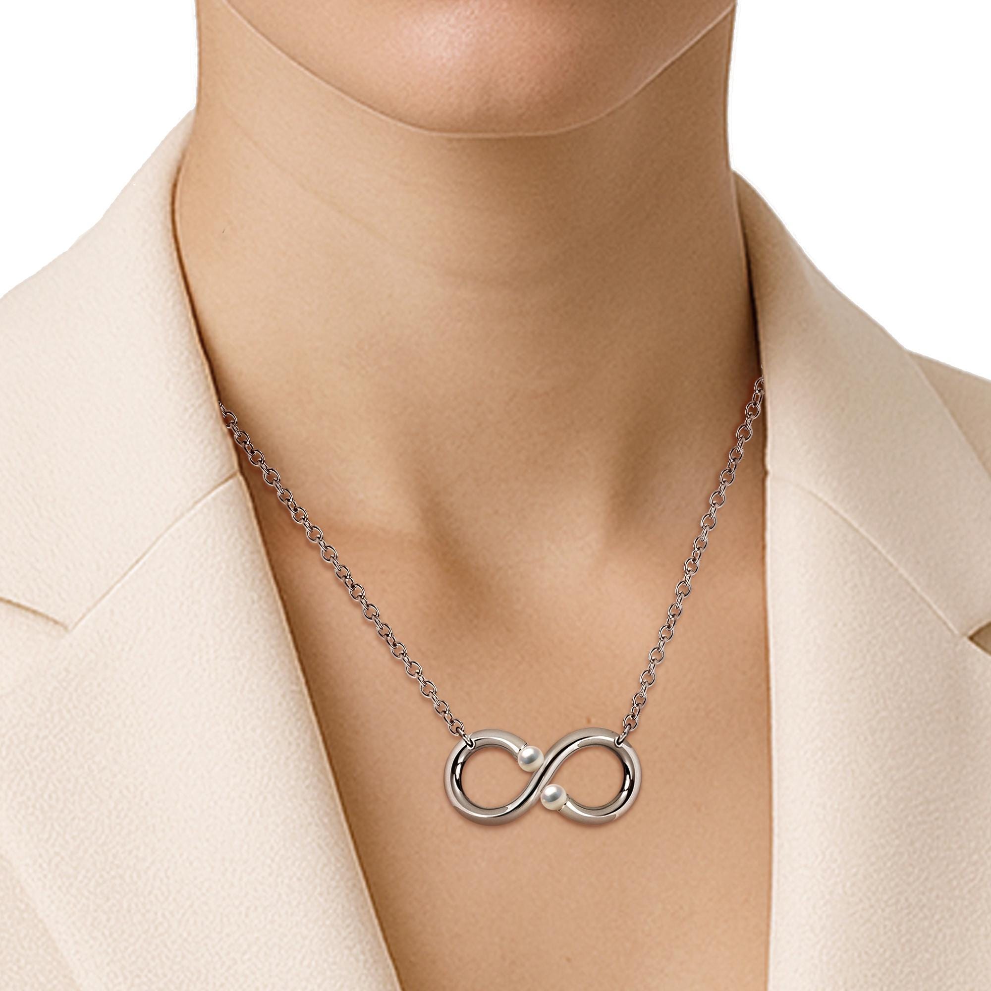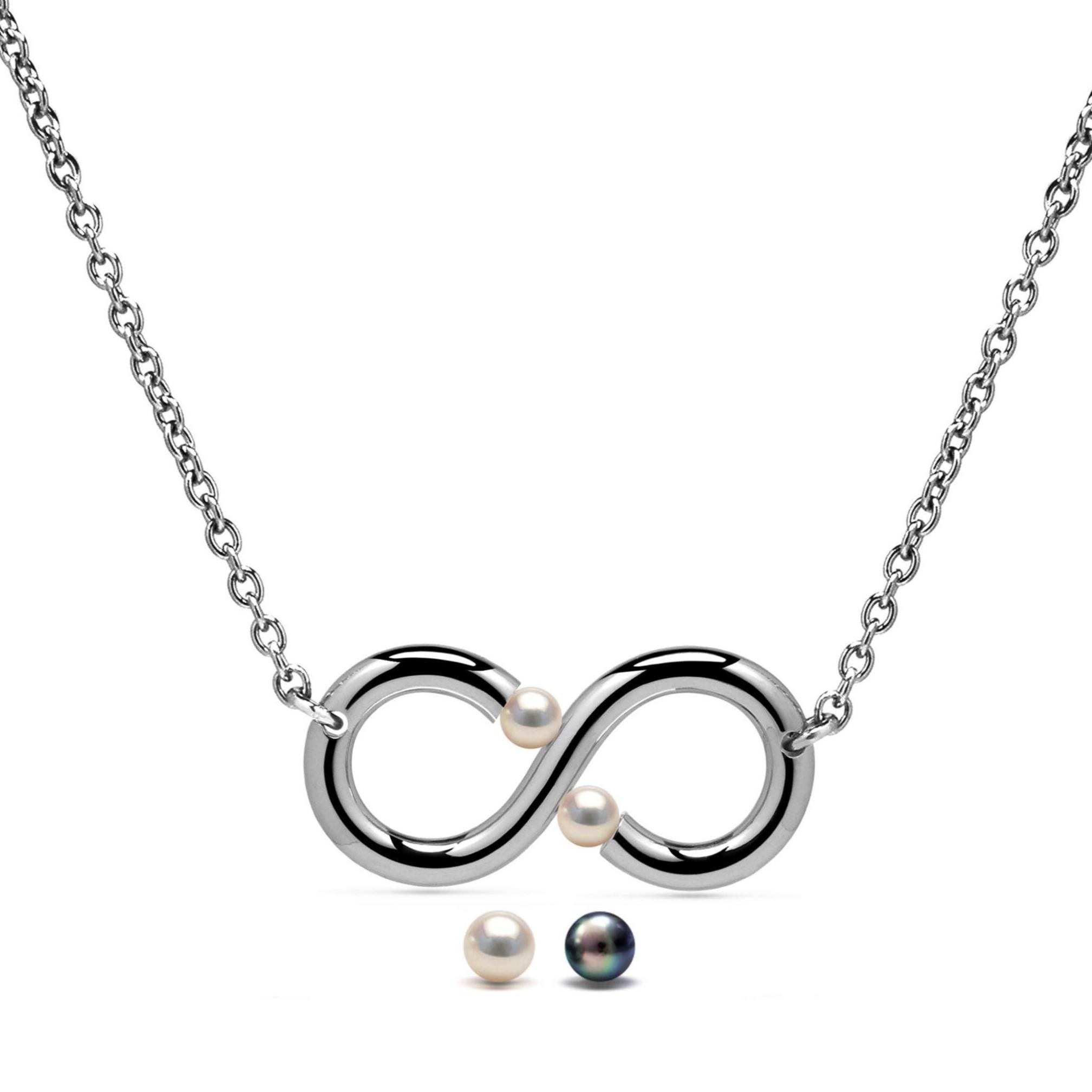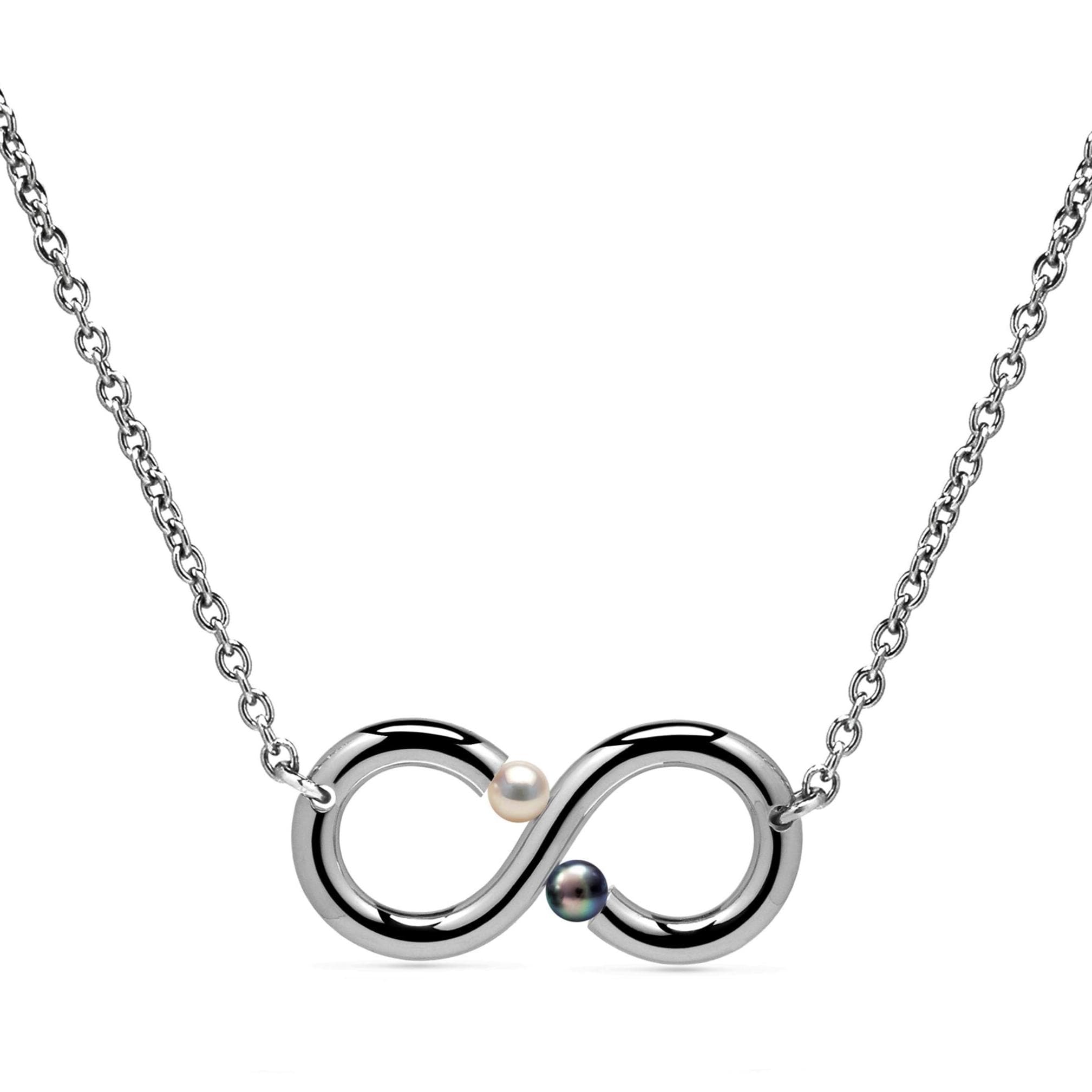 Elevate your everyday elegance with our enchanting INFINITY necklace, featuring two cultured pearls suspended within a sleek, horizontal infinity symbol. Crafted from polished 316 stainless steel, the pendant gently cradles the pearls through precise tension setting, allowing light to illuminate their natural radiance—whether you choose all white pearls, all black pearls or a mix of white and black pearl.