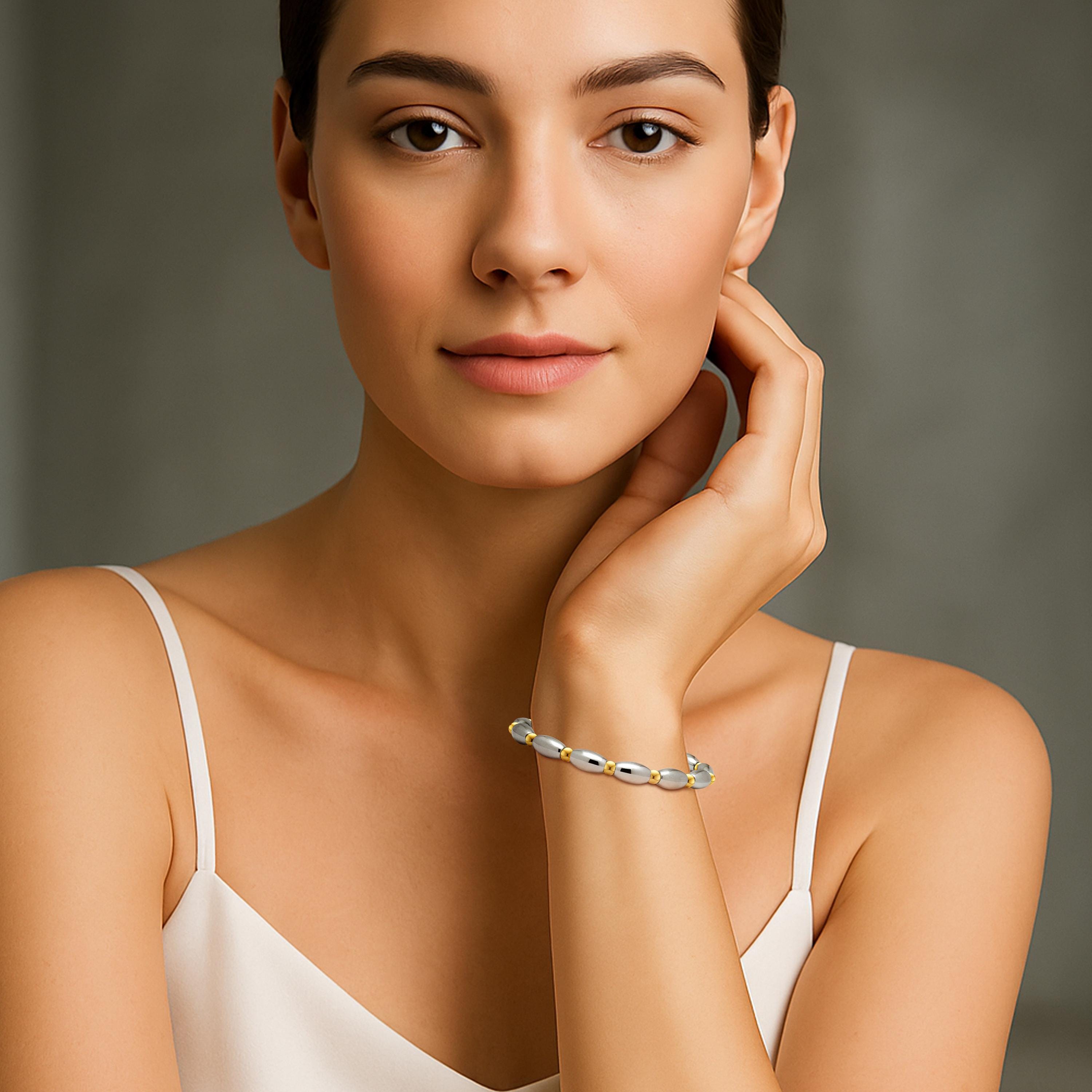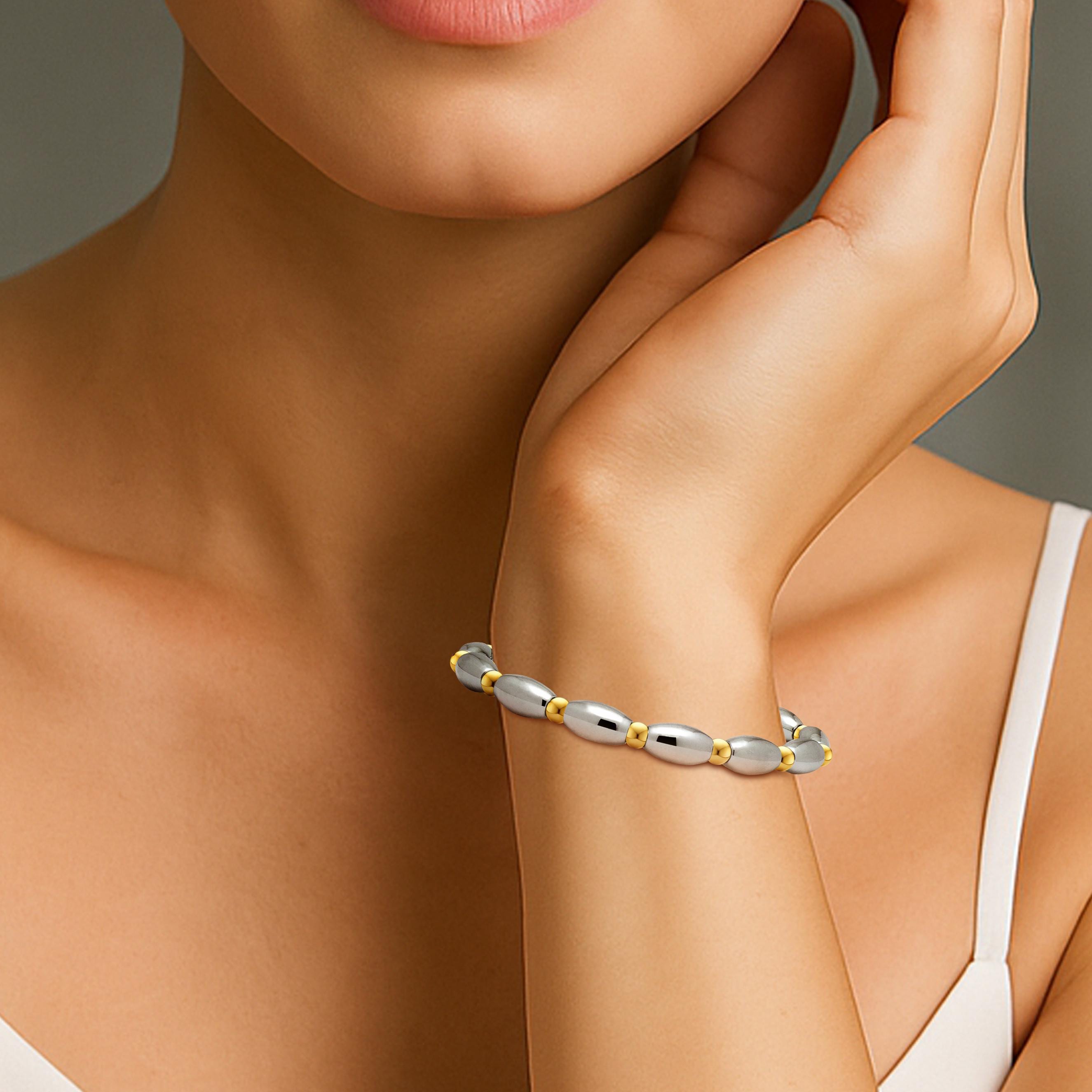 A refined expression of understated luxury, this bracelet is composed of olive shaped polished stainless steel beads alternated with round gold beads, seamlessly strung on an ultra-fine internal steel chain for both flexibility and strength.