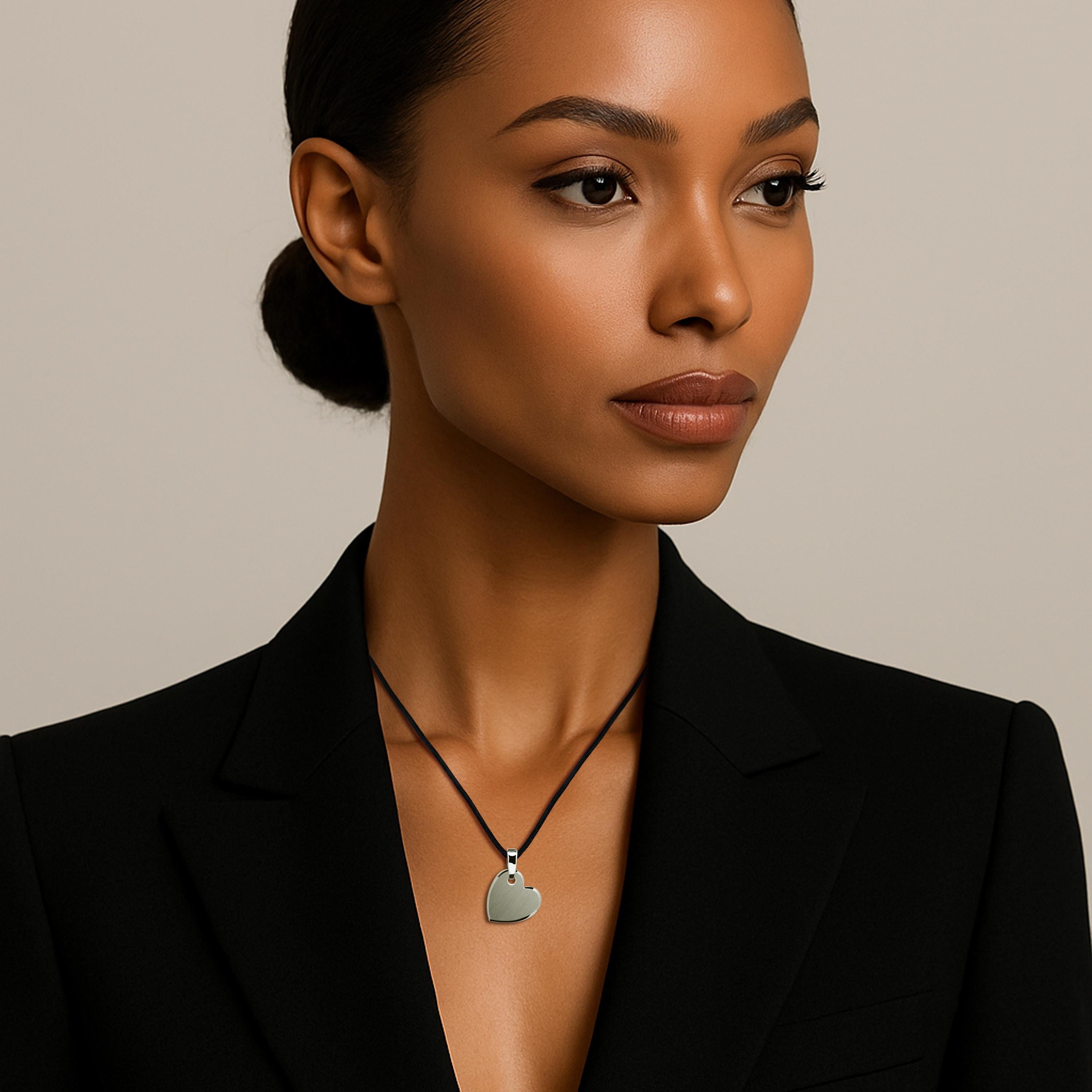 It is a subtle, yet powerful, symbol of love and connection, designed for those who favor sleek lines and architectural elegance over traditional sentimentality. This pendant is offered with a choice of a sturdy Chain for a sophisticated, metallic look, or a comfortable Black Textile Cord for a more casual, modern contrast.